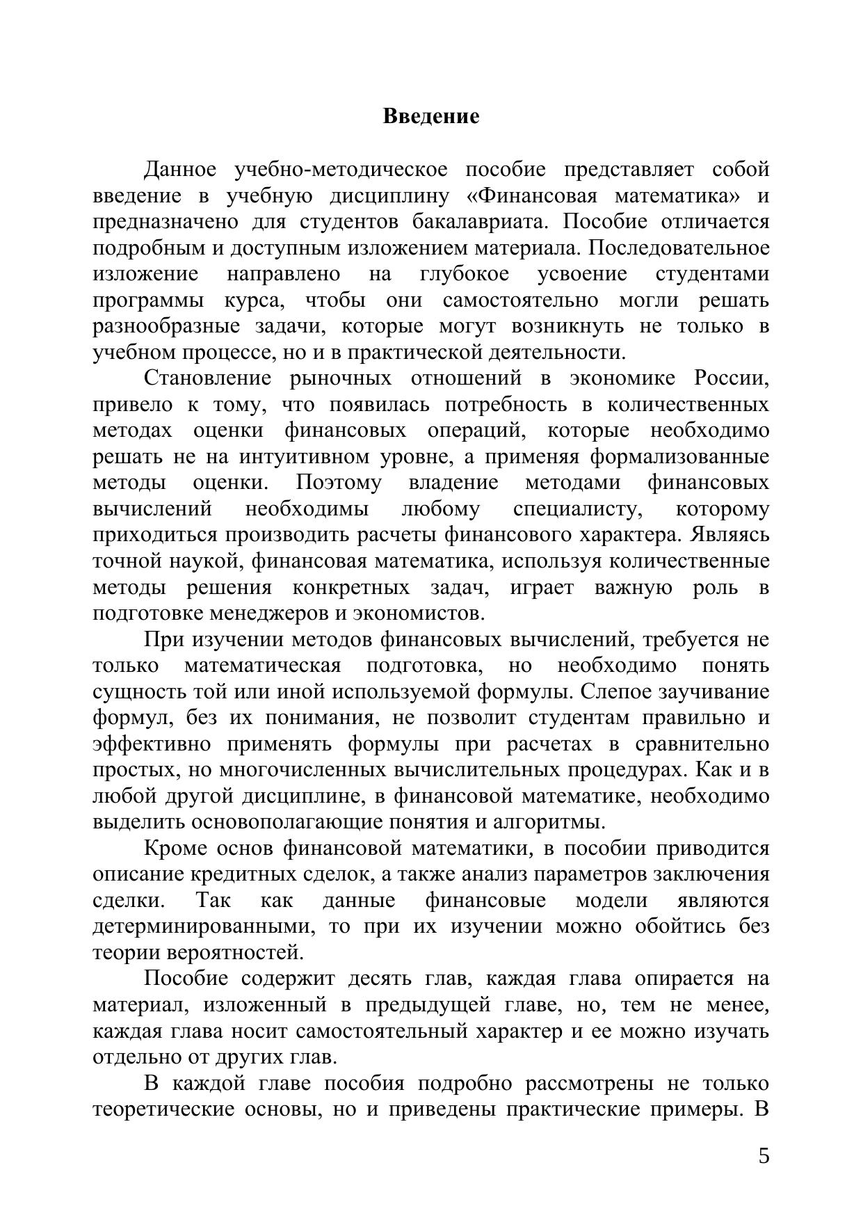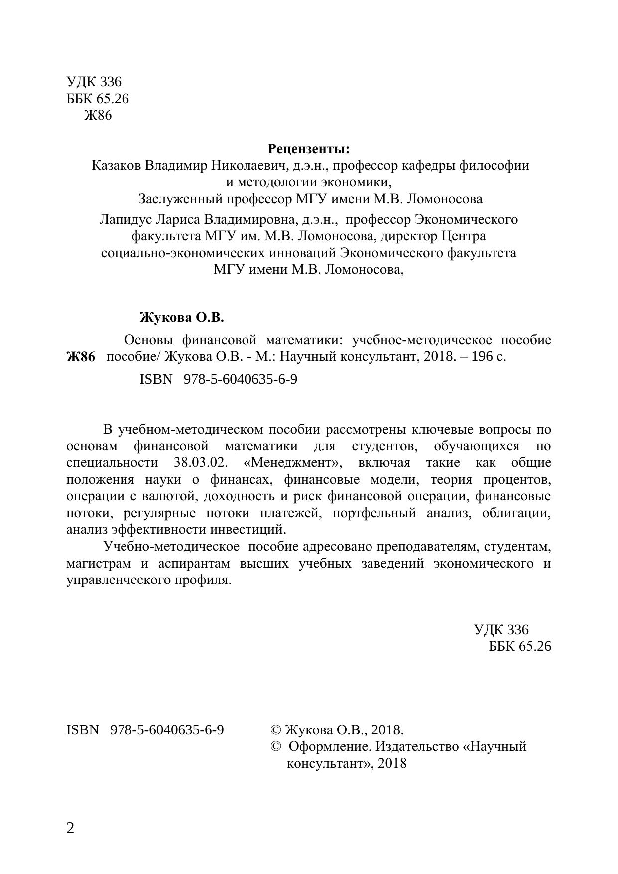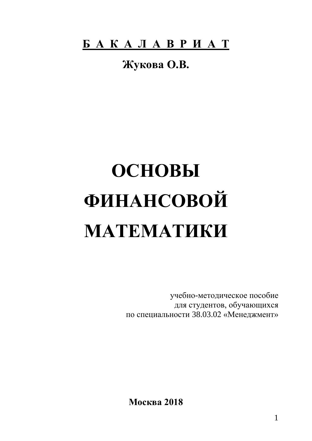 В учебном-методическом пособии рассмотрены ключевые вопросы по основам финансовой математики для студентов, обучающихся по специальности 38.03.02. «Менеджмент», включая такие как общие положения науки о финансах, финансовые модели, теория процентов, операции с валютой, доходность и риск финансовой операции, финансовые потоки, регулярные потоки платежей, портфельный анализ, облигации, анализ эффективности инвестиций. Учебно-методическое пособие адресовано преподавателям, студентам, магистрам и аспирантам высших учебных заведений экономического и управленческого профиля.
