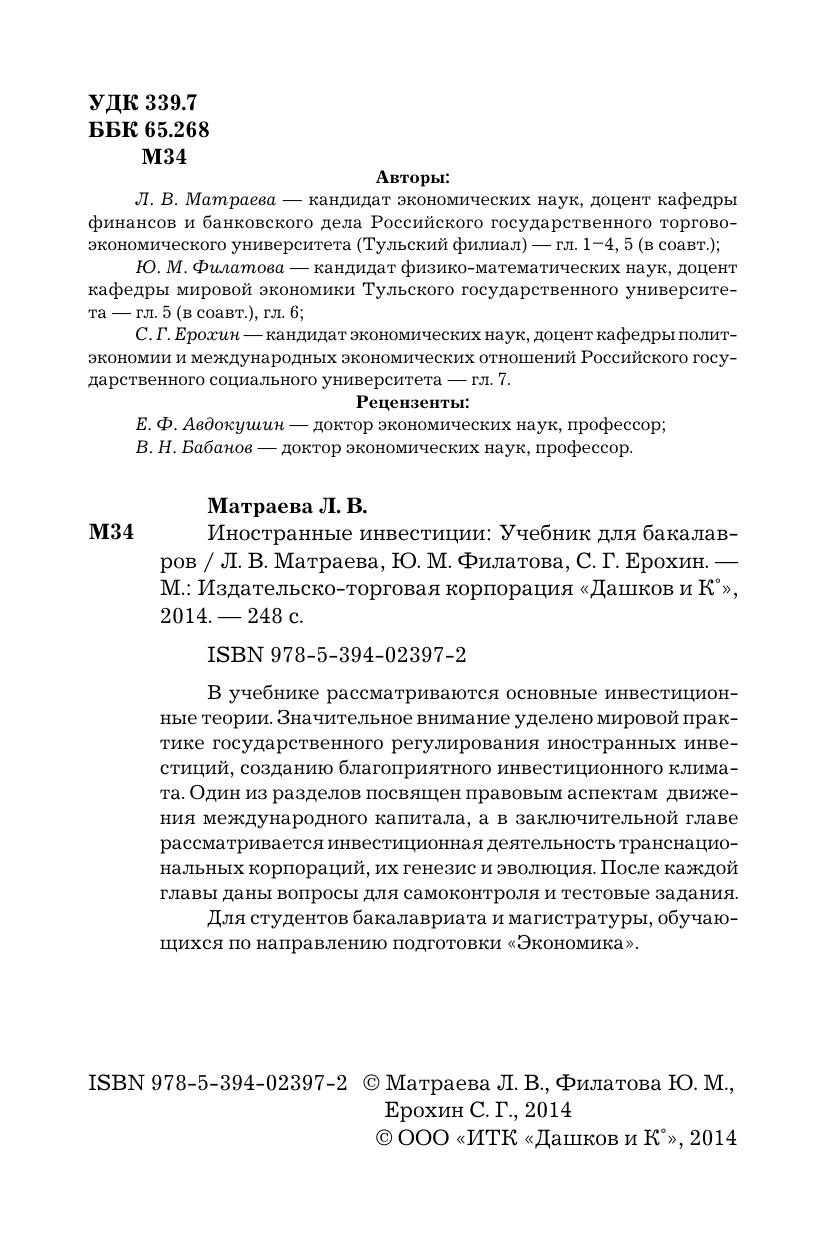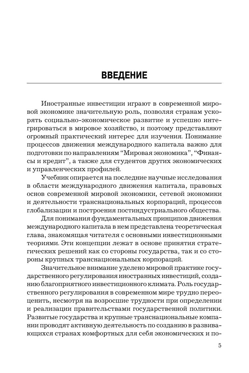В учебнике рассматриваются основные инвестиционные теории. Значительное внимание уделено мировой практике государственного регулирования иностранных инвестиций, созданию благоприятного инвестиционного климата. Один из разделов посвящен правовым аспектам движения международного капитала, а в заключительной главе рассматривается инвестиционная деятельность транснациональных корпораций, их генезис и эволюция. После каждой главы даны вопросы для самоконтроля и тестовые задания. Для студентов бакалавриата и магистратуры, обучающихся по направлению подготовки «Экономика».