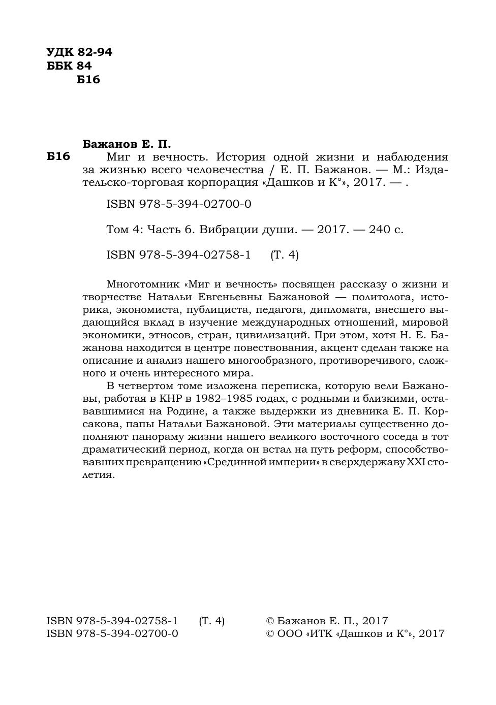 В четвертом томе изложена переписка, которую вели Бажановы, работая в КНР в 1982–1985 годах, с родными и близкими, остававшимися на Родине, а также выдержки из дневника Е. П. Корсакова, папы Натальи Бажановой. Эти материалы существенно дополняют панораму жизни нашего великого восточного соседа в тот драматический период, когда он встал на путь реформ, способствовавших превращению «Срединной империи» в сверхдержаву ХХI столетия.