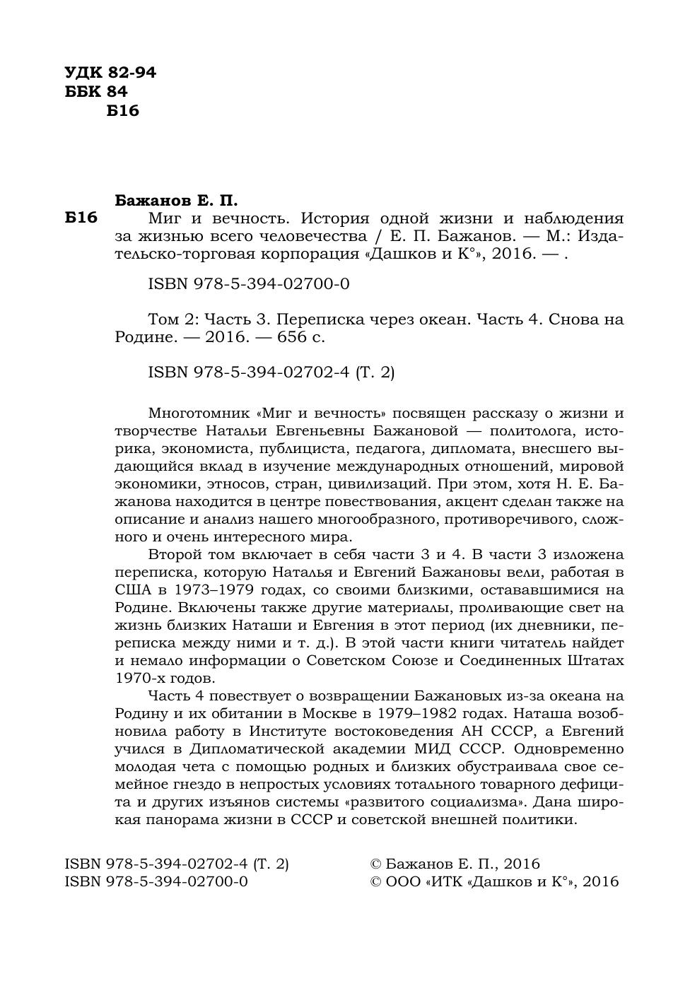 Второй том включает в себя части 3- и 4. В части 3 изложена переписка, которую Наталья и Евгений Бажановы вели, работая в США в 1973-1979 годах, со своими близкими, остававшимися на Родине. Включены также другие материалы, проливающие свет на жизнь близких Наташи и Евгения в этот период (их дневники, переписка между ними и т.д.) В этой части книги читатель найдет и немало информации о Советском Союзе и Соединенных Штатах 1970-х годов.