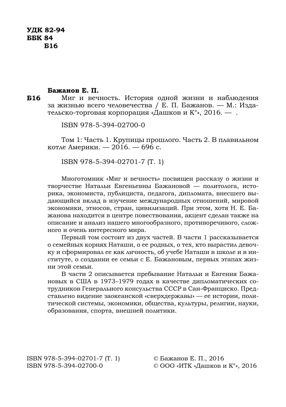 Многотомник "Миг и вечность" посвящен рассказу о жизни и творчестве Натальи Евгеньевны Бажановой -политолога, историка, экономиста, публициста, педагога, дипломата, внесшего выдающийся вклад в изучение международных отношений, мировой экономики, этносов, стран, цивилизаций. При этом, хотя Н.Е. Бажанова находится в центре повествования, акцент сделан также на описание и анализ нашего многообразного, противоречивого, сложного и очень интересного мира.