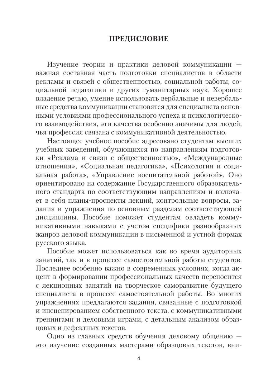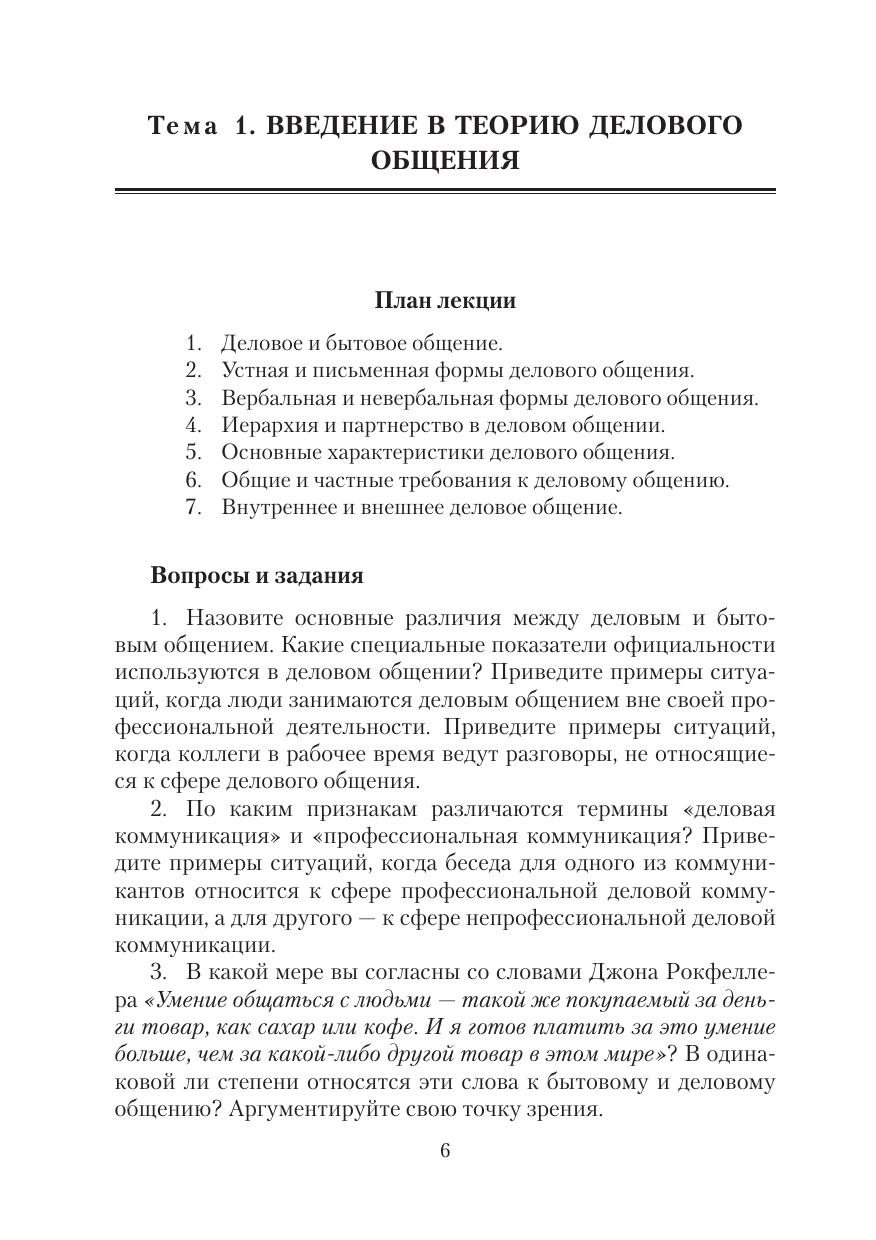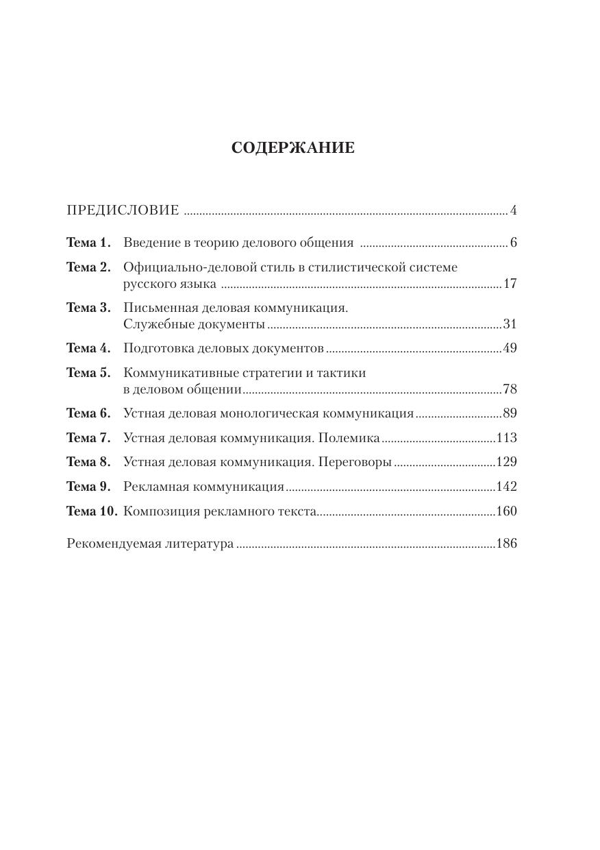 Пособие содержит план лекций, а также комплекс заданий и упражнений по теории и практике делового общения. Включает материалы по деловой коммуникации в устной и письменной форме, в том числе по составлению и оформлению деловых документов, стилистике деловой речи, рекламной коммуникации, стратегии и тактике делового общения.