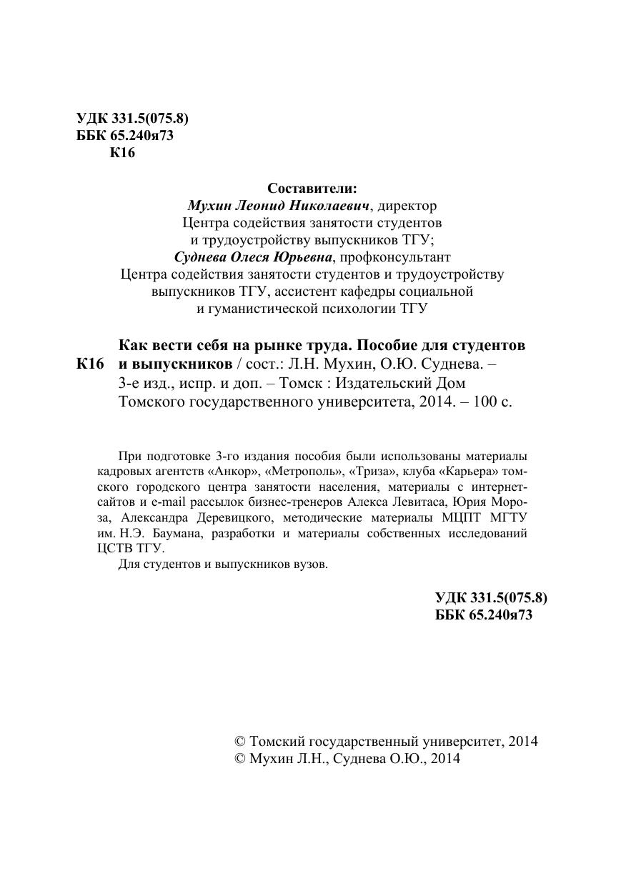 При подготовке 3-го издания пособия были использованы материалы кадровых агентств «Анкор», «Метрополь», «Триза», клуба «Карьера» томского городского центра занятости населения, материалы с интернет-сайтов и e-mail рассылок бизнес-тренеров Алекса Левитаса, Юрия Мороза, Александра Деревицкого, методические материалы МЦПТ МГТУ им. Н.Э. Баумана, разработки и материалы собственных исследований ЦСТВ ТГУ. Для студентов и выпускников вузов.