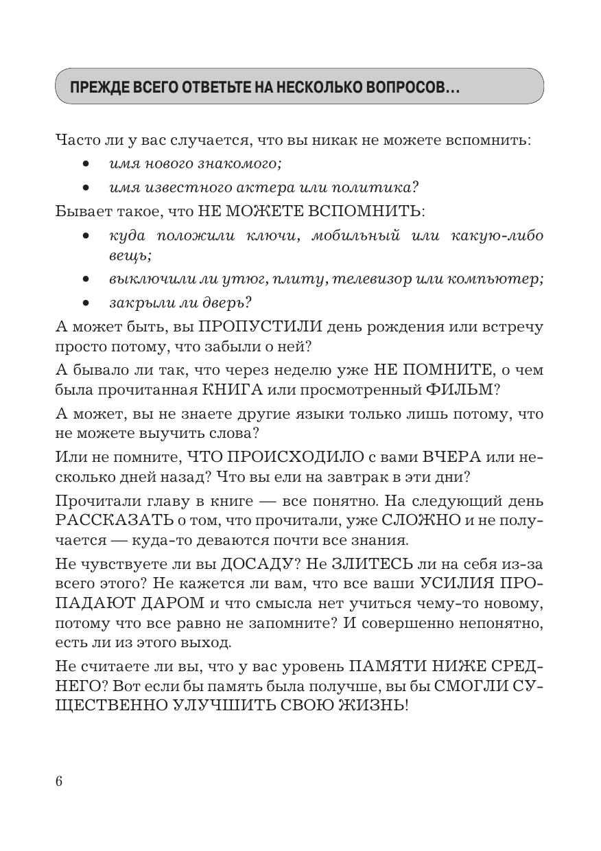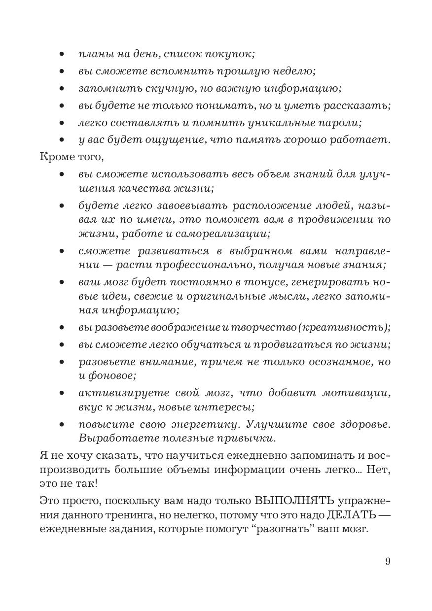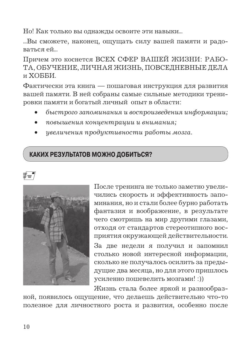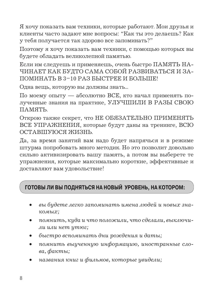 В данной книге раскрывается простой алгоритм расширения возможностей памяти. Как результат - повышение качества жизни, выраженное в усилении внимания, росте продуктивности, обучаемости, скорости мышления. Автор рассматривает небольшие практические упражнения, выполняя которые вы неизбежно придете к успеху. Для людей, интересующихся развитием своих способностей, изучающих иностранный язык, тех, кто столкнулся с проблемами памяти, кому по работе или учебе необходимо освоить большое количество информации. Книга будет полезна публично выступающим для запоминания докладов и презентаций, торговым представителям и агентам - для запоминания продуктов, их свойств и цен..