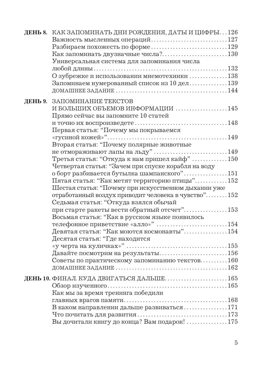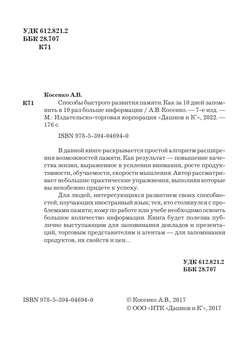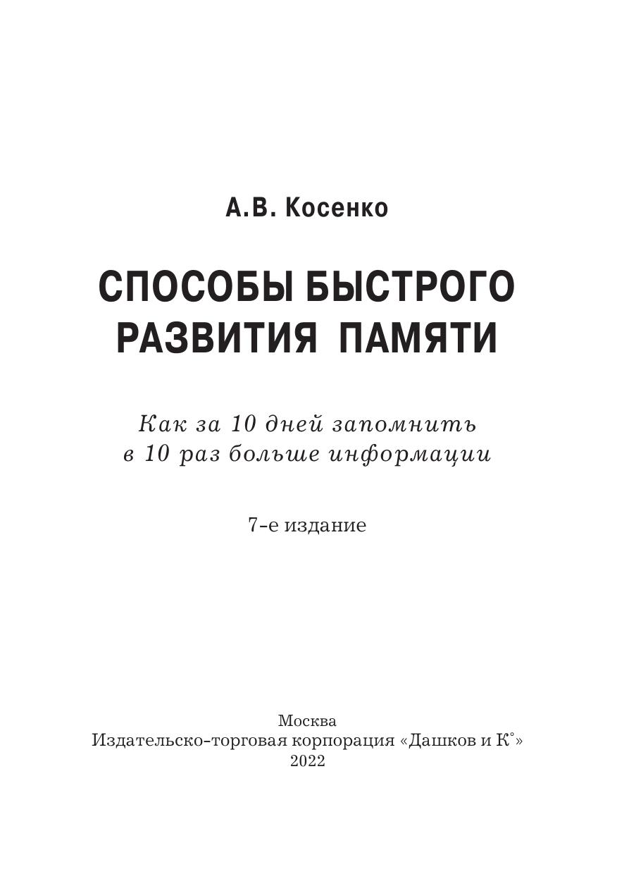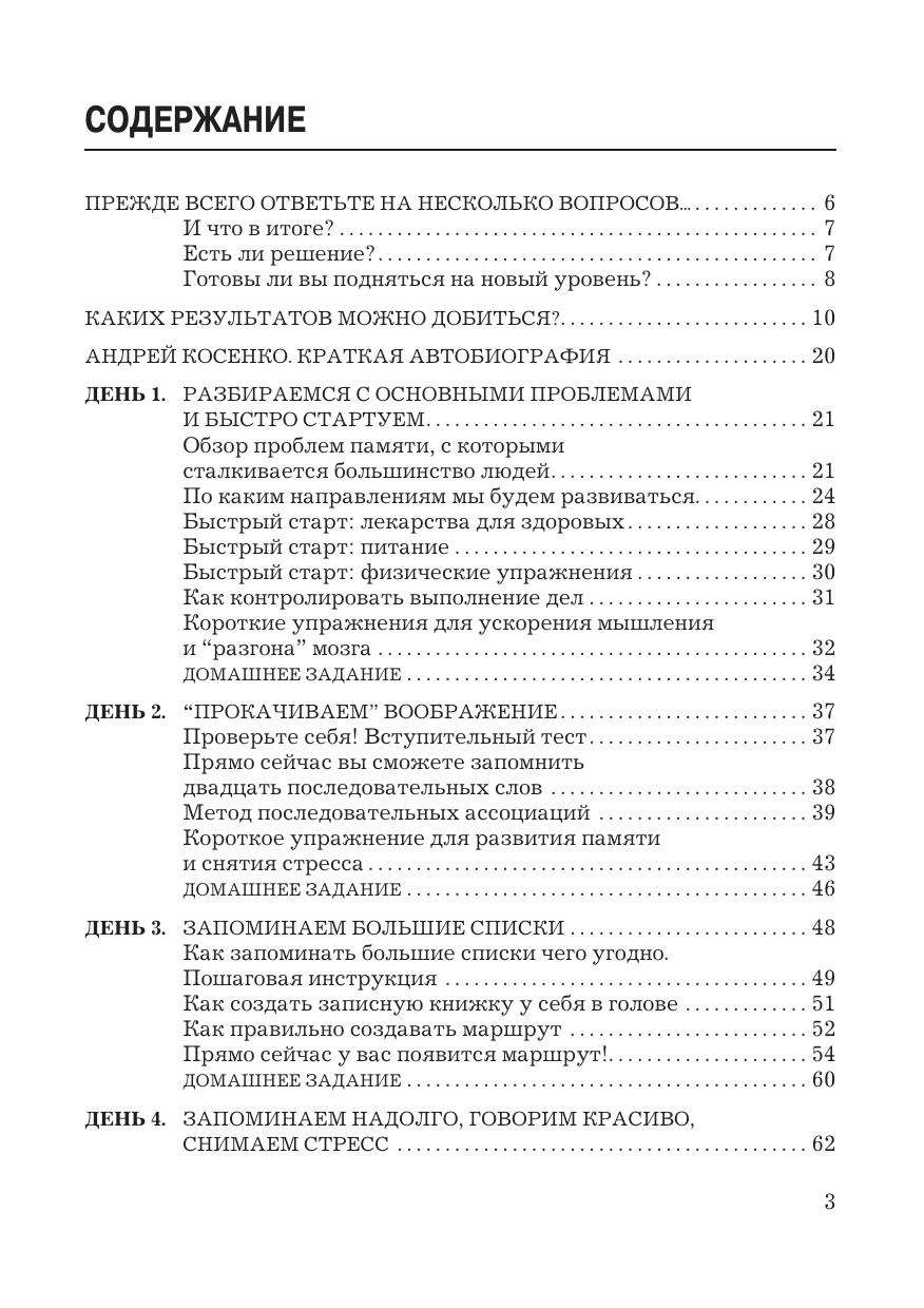 В данной книге раскрывается простой алгоритм расширения возможностей памяти. Как результат - повышение качества жизни, выраженное в усилении внимания, росте продуктивности, обучаемости, скорости мышления. Автор рассматривает небольшие практические упражнения, выполняя которые вы неизбежно придете к успеху. Для людей, интересующихся развитием своих способностей, изучающих иностранный язык, тех, кто столкнулся с проблемами памяти, кому по работе или учебе необходимо освоить большое количество информации. Книга будет полезна публично выступающим для запоминания докладов и презентаций, торговым представителям и агентам - для запоминания продуктов, их свойств и цен..