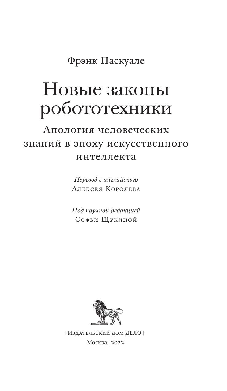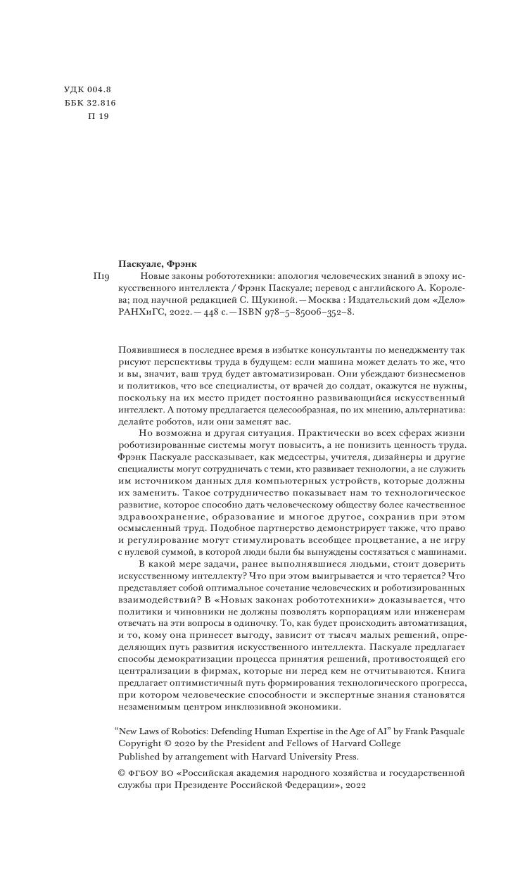 Но возможна и другая ситуация. Практически во всех сферах жизни роботизированные системы могут повысить, а не понизить ценность труда. Фрэнк Паскуале рассказывает, как медсестры, учителя, дизайнеры и другие специалисты могут сотрудничать с теми, кто развивает технологии, а не служить им источником данных для компьютерных устройств, которые должны их заменить. Такое сотрудничество показывает нам то технологическое развитие, которое способно дать человеческому обществу более качественное здравоохранение, образование и многое другое, сохранив при этом осмысленный труд. Подобное партнерство демонстрирует также, что право и регулирование могут стимулировать всеобщее процветание, а не игру с нулевой суммой, в которой люди были бы вынуждены состязаться с машинами. В какой мере задачи, ранее выполнявшиеся людьми, стоит доверить искусственному интеллекту? Что при этом выигрывается и что теряется? Что представляет собой оптимальное сочетание человеческих и роботизированных взаимодействий? В «Новых законах робототехники» доказывается, что политики и чиновники не должны позволять корпорациям или инженерам отвечать на эти вопросы в одиночку. То, как будет происходить автоматизация, и то, кому она принесет выгоду, зависит от тысяч малых решений, определяющих путь развития искусственного интеллекта. Паскуале предлагает способы демократизации процесса принятия решений, противостоящей его централизации в фирмах, которые ни перед кем не отчитываются. Книга предлагает оптимистичный путь формирования технологического прогресса, при котором человеческие способности и экспертные знания становятся незаменимым центром инклюзивной экономики.