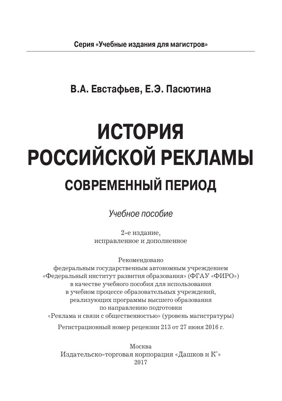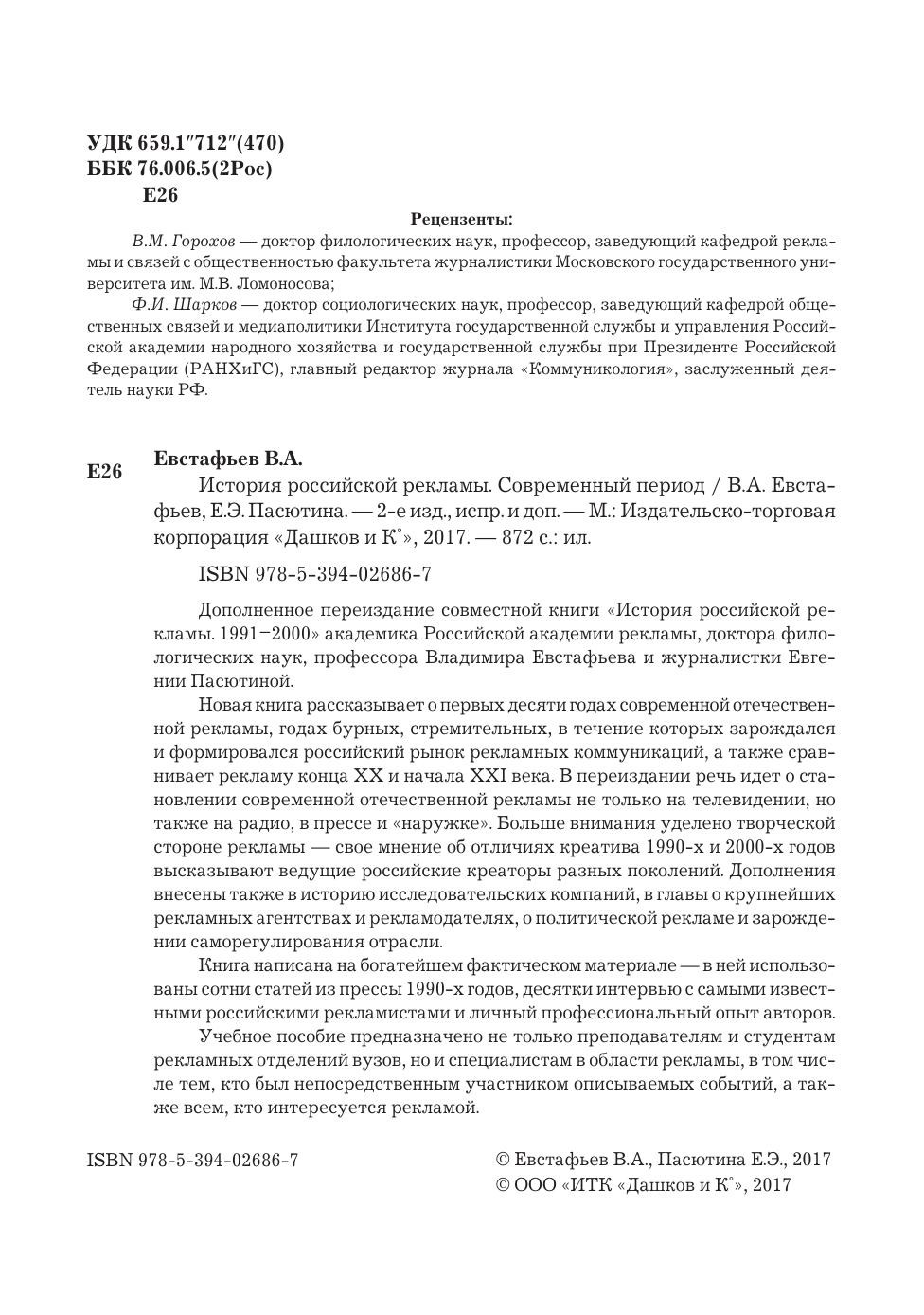 Дополненное переиздание современной книги "История российской рекламы. 1991-2000" академика Российской академии рекламы, доктора филологических наук, профессора Владимира Евстафьева и журналистки Евгении Пасютиной.