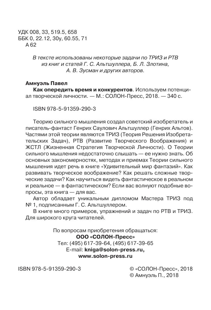 Частями этой теории являются ТРИЗ (Теория Решения Изобретательских Задач), РТВ (Развитие Творческого Воображения) и ЖСТЛ (Жизненная Стратегия Творческой Личности). О Теории сильного мышления недостаточно слышать — ее нужно знать. Об основных закономерностях, методах и приемах Теории сильного мышления идет речь в книге «Удивительный мир фантазий». Как развивать творческое воображение? Как решать сложные творческие задачи? Как научиться видеть фантастическое в реальном и реальное — в фантастическом? Если вас волнуют подобные вопросы, эта книга — для вас. Автор обладает уникальным дипломом Мастера ТРИЗ под № 1, подписанным Г. С. Альтшуллером. В книге много примеров, упражнений и задач по РТВ и ТРИЗ. Для широкого круга читателей.