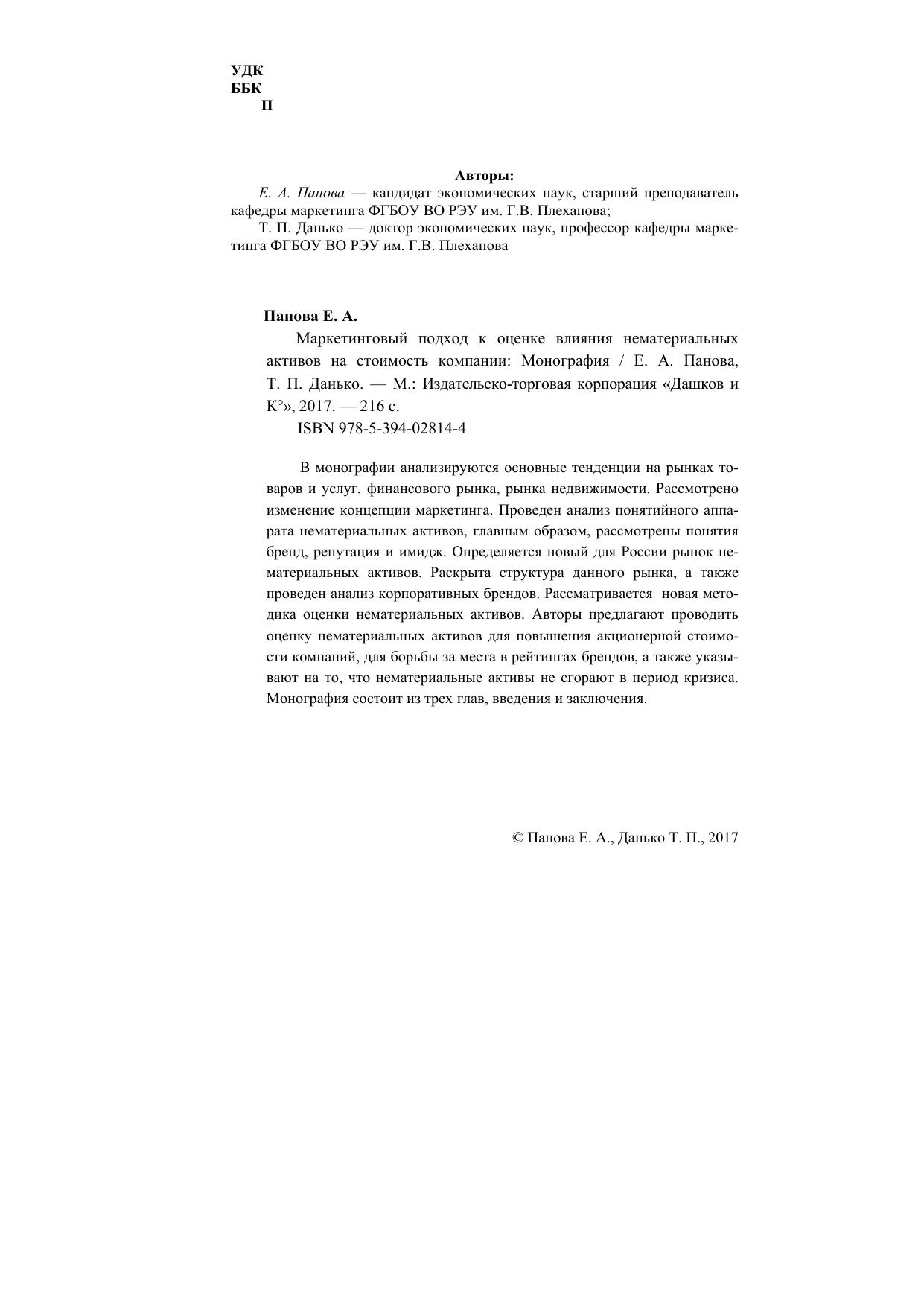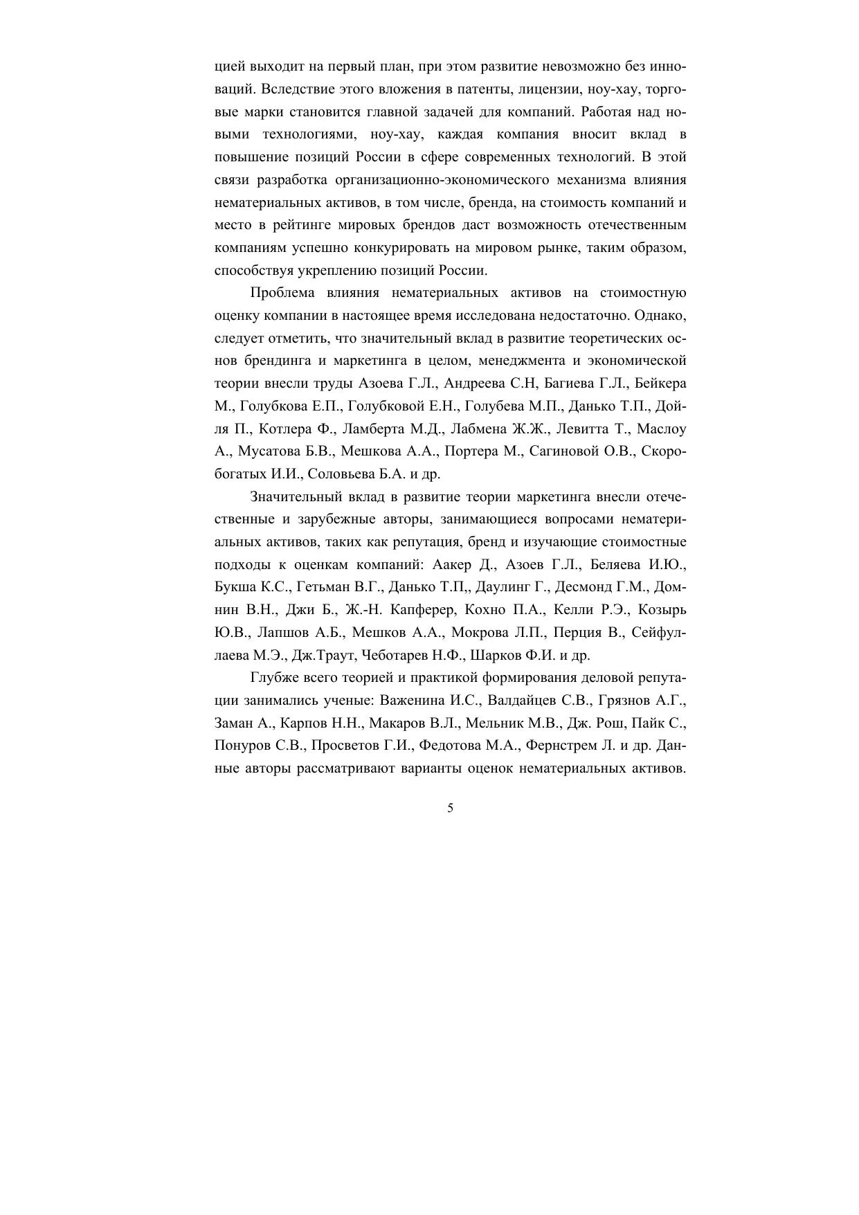 В монографии анализируются основные тенденции на рынках товаров и услуг, финансового рынка, рынка недвижимости. Рассмотрено изменение концепции маркетинга. Проведен анализ понятийного аппарата нематериальных активов, главным образом, рассмотрены понятия бренд, репутация и имидж. Определяется новый для России рынок нематериальных активов. Раскрыта структура данного рынка, а также проведен анализ корпоративных брендов. Рассматривается новая методика оценки нематериальных активов. Авторы предлагают проводить оценку нематериальных активов для повышения акционерной стоимости компаний, для борьбы за места в рейтингах брендов, а также указывают на то, что нематериальные активы не сгорают в период кризиса.
