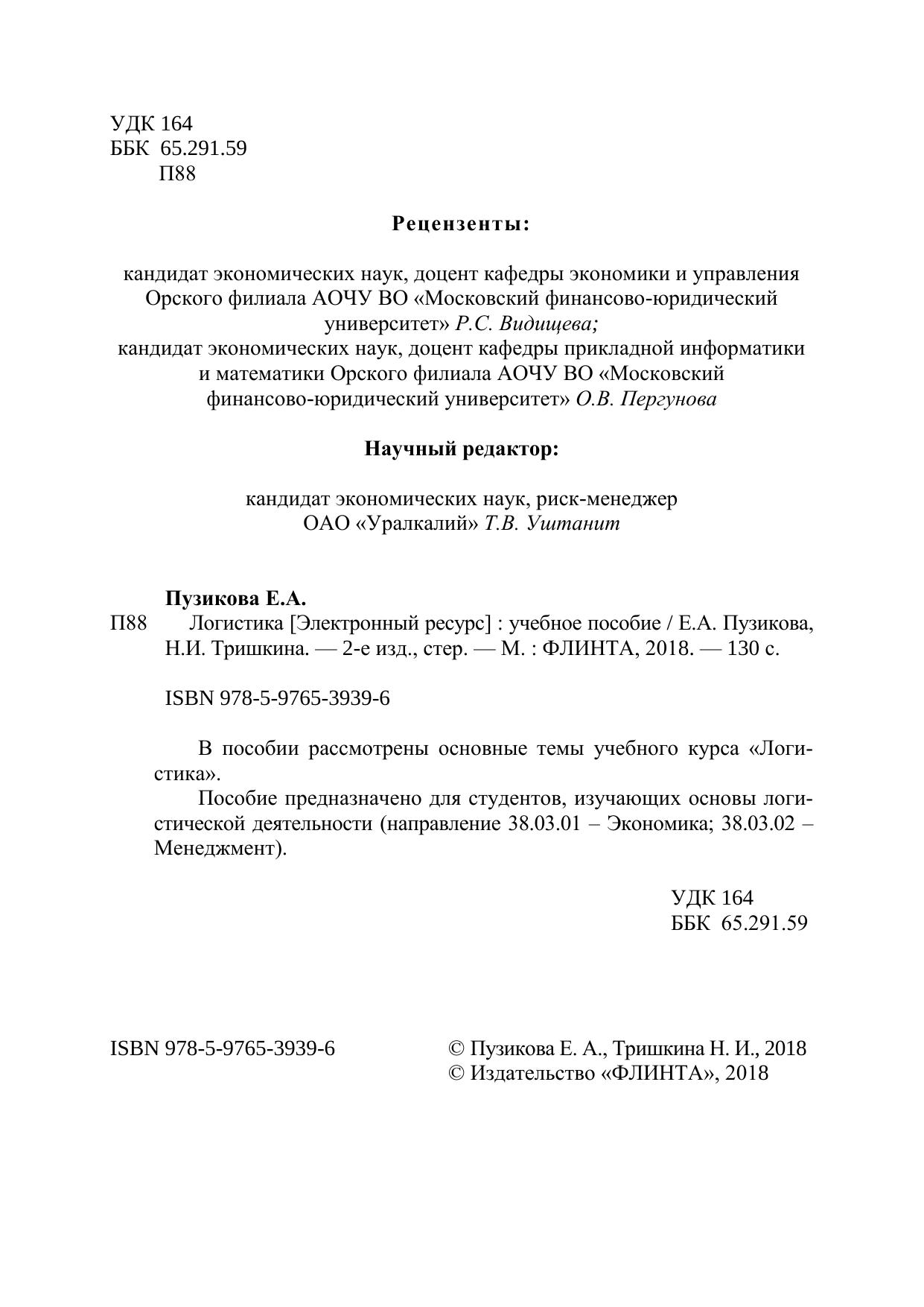В пособии рассмотрены основные темы учебного курса «Логистика». Пособие предназначено для студентов, изучающих основы логистической деятельности (направление 38.03.01 ‒ Экономика; 38.03.02 ‒ Менеджмент).