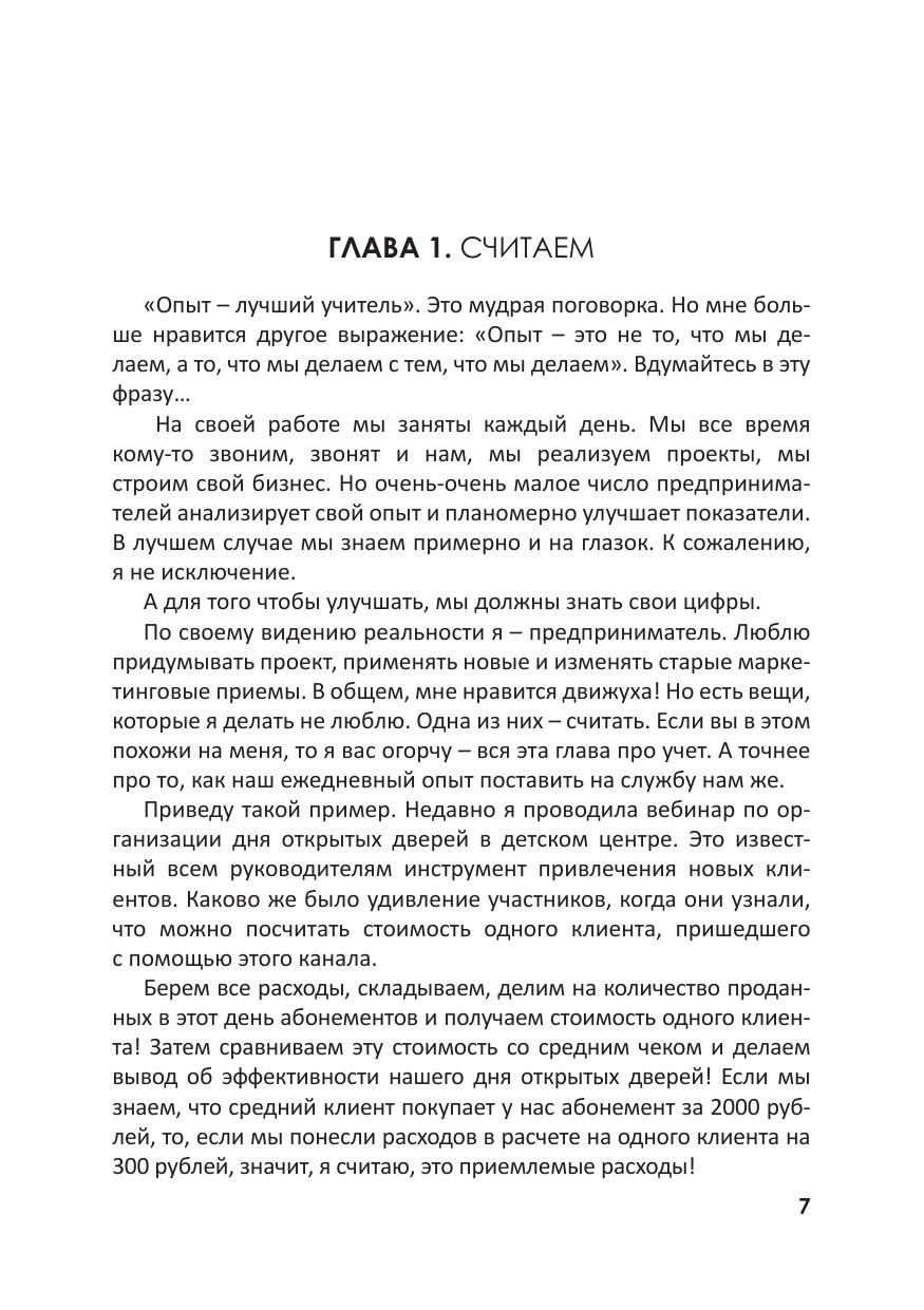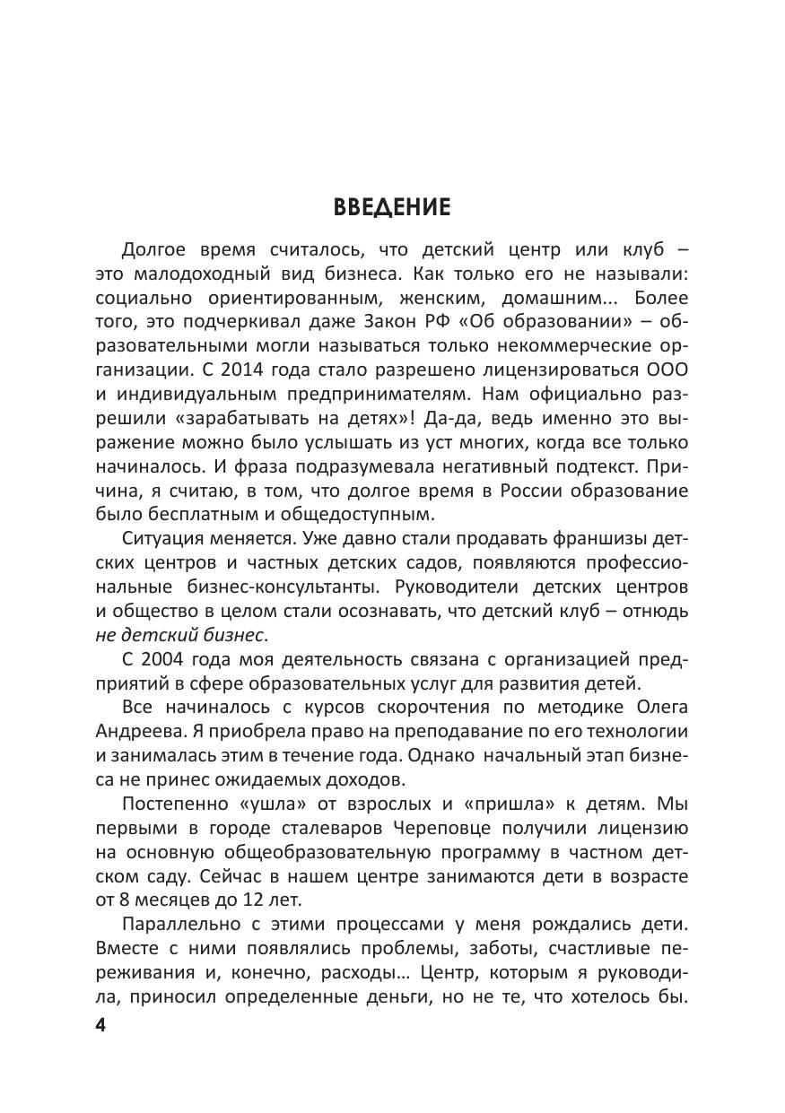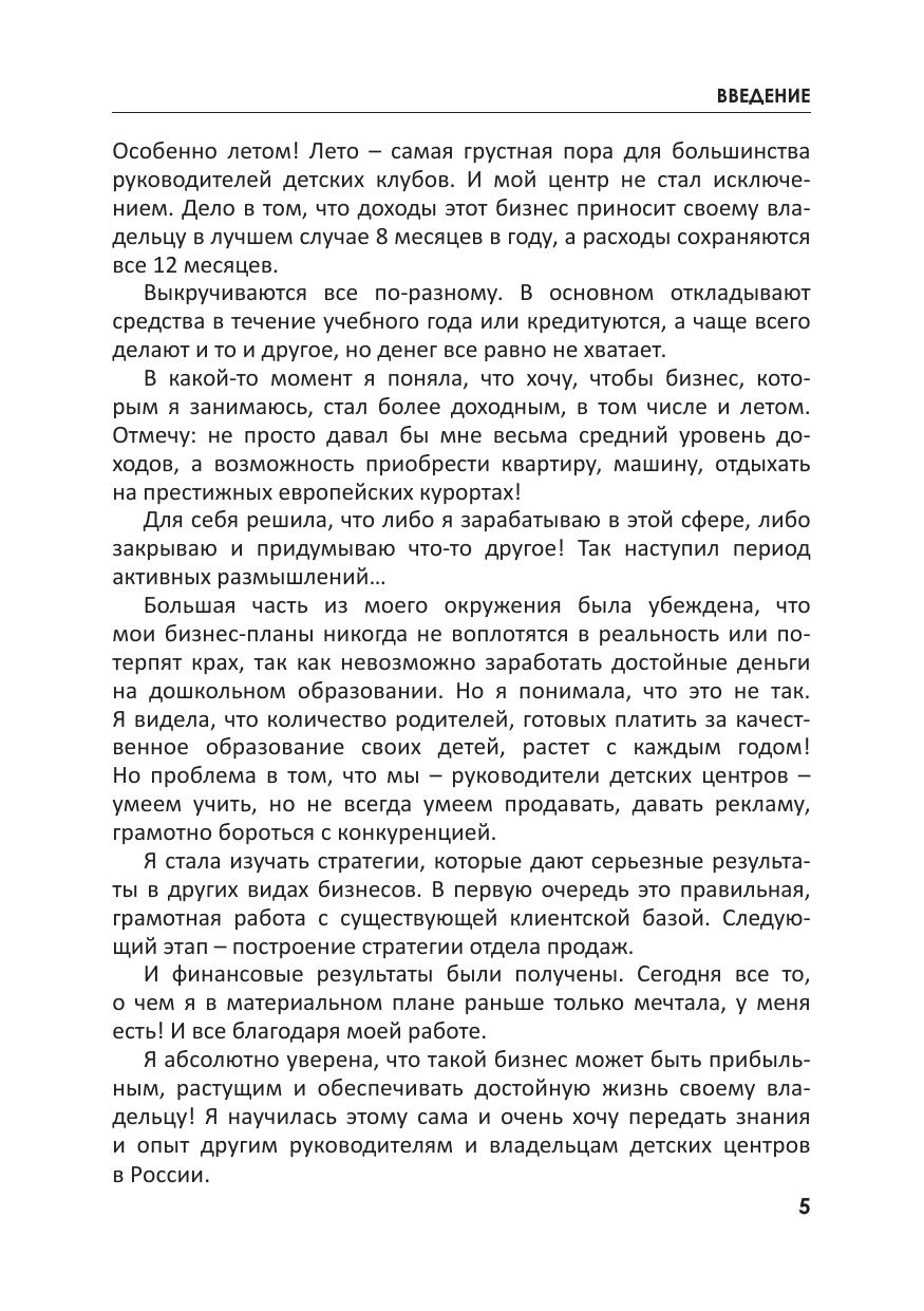 Книга представляет собой практическое руководство по работе с клиентами при продажах в детских центрах. Уделено внимание маркетингу, продвижению в социальных сетях и другим важным аспектам при организации деятельности предприятия. Речь пойдет о том, как правильно работать с существующей клиентской базой, а также о том, как постоянно ее наращивать. Автор знакомит читателей с возможностью увеличения активных продаж в детских центрах. Добиться этого можно посредством построения и грамотной организации работы отдела продаж. Книга может быть полезна руководителям детских центров, клубов, фитнес-клубов, оздоровительных центров, частных детских садов, языковых центров и центров повышения квалификации – всем тем, чье благосостояние зависит от правильно организованной работы с клиентской базой и от ее постоянного роста.