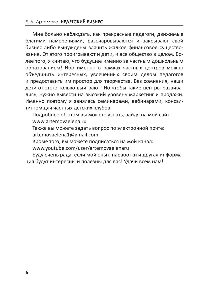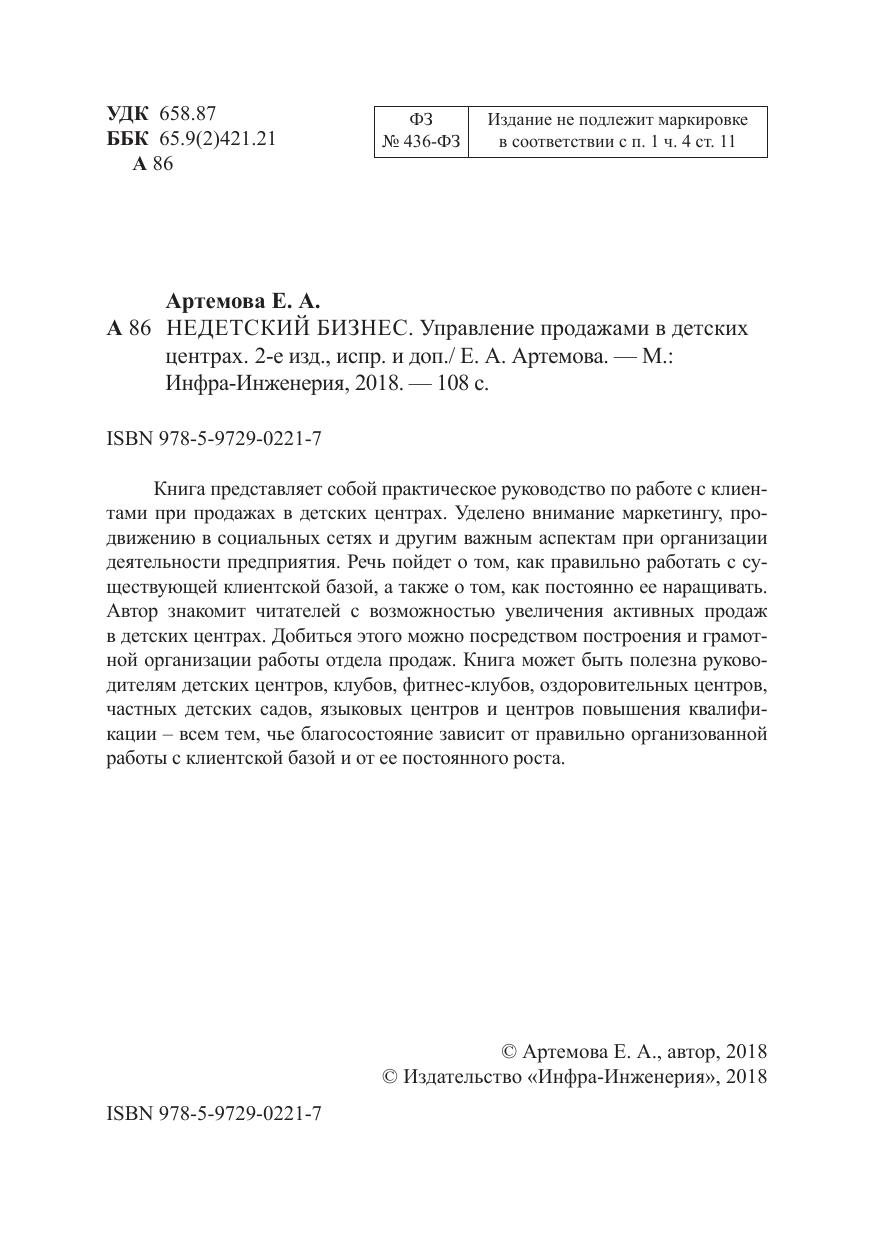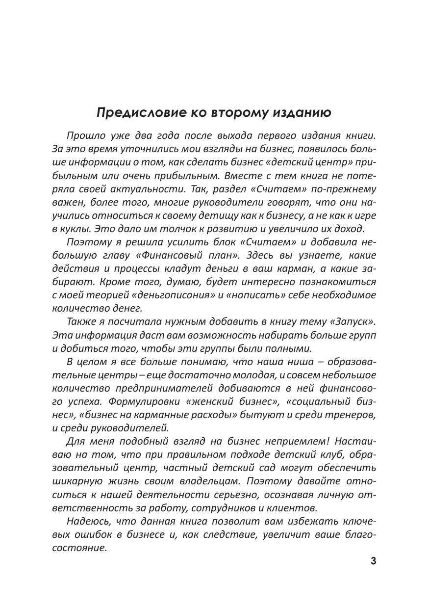 Книга представляет собой практическое руководство по работе с клиентами при продажах в детских центрах. Уделено внимание маркетингу, продвижению в социальных сетях и другим важным аспектам при организации деятельности предприятия. Речь пойдет о том, как правильно работать с существующей клиентской базой, а также о том, как постоянно ее наращивать. Автор знакомит читателей с возможностью увеличения активных продаж в детских центрах. Добиться этого можно посредством построения и грамотной организации работы отдела продаж. Книга может быть полезна руководителям детских центров, клубов, фитнес-клубов, оздоровительных центров, частных детских садов, языковых центров и центров повышения квалификации – всем тем, чье благосостояние зависит от правильно организованной работы с клиентской базой и от ее постоянного роста.