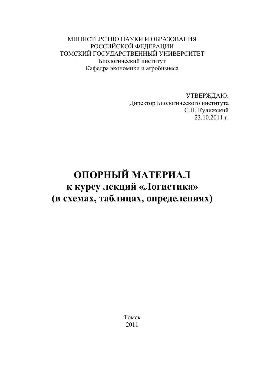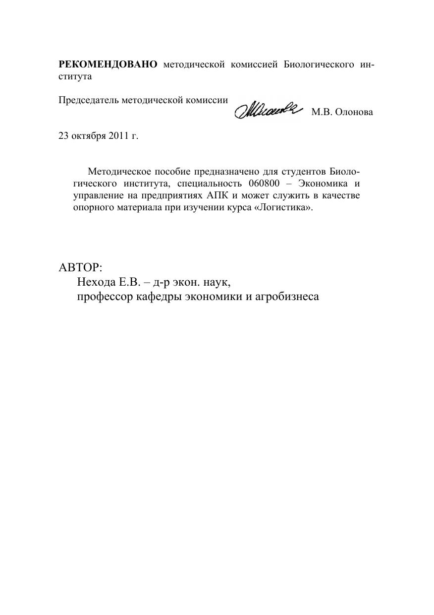 Методическое пособие предназначено для студентов Биологического института, специальность 060800 – Экономика и управление на предприятиях АПК и может служить в качестве опорного материала при изучении курса «Логистика».