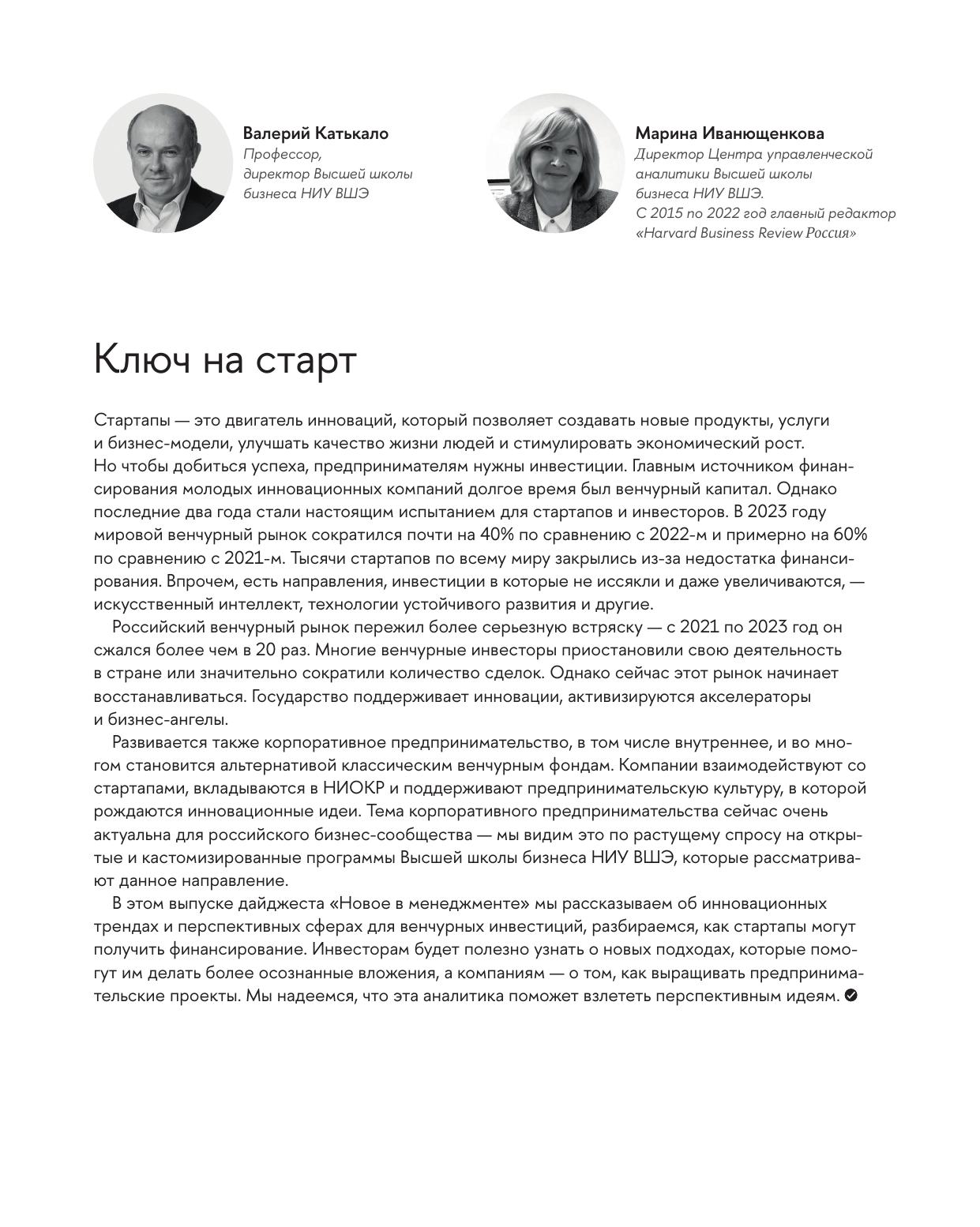 Настоящий дайджест входит в серию регулярных тематических выпусков Высшей школы бизнеса НИУ ВШЭ "Новое в менеджменте". Он посвящен тенденциям и перспективным направлениям мирового и российского венчурного рынка, корпоративному предпринимательству, стартапам и мерам их поддержки. Издание предназначено для руководителей компаний, предпринимателей, преподавателей вузов и студентов, а также для широкого круга читателей, интересующихся актуальными трендами в сфере инноваций и менеджмента.
