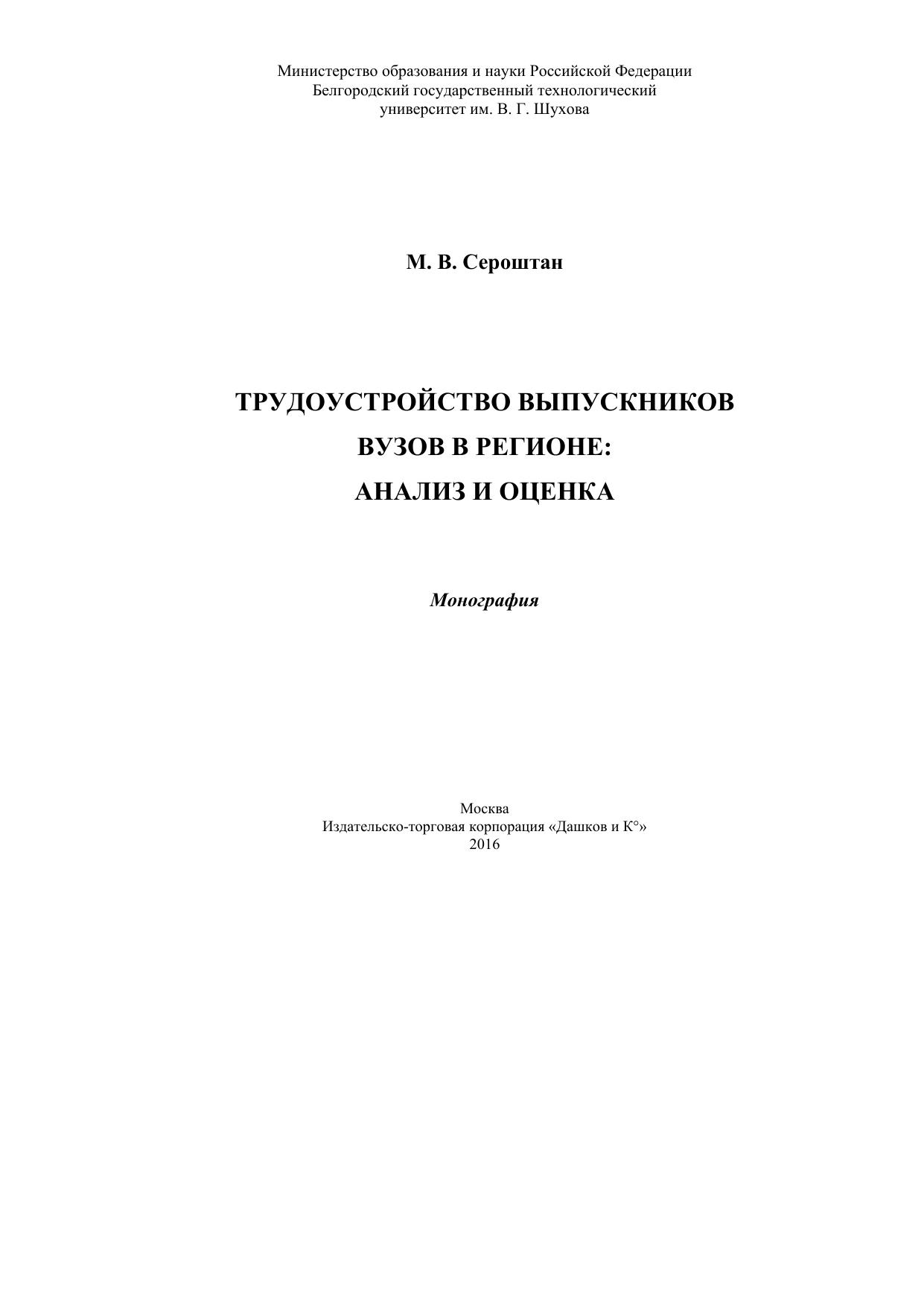 Настоящее издание посвящено исследованию трудоустройства выпускников вузов региона в разрезе отраслей науки, укрупненных групп специальностей и направлений подготовки, образовательных организаций на примере Белгородской области, в том числе и Белгородского государственного технологического университета им. В.Г. Шухова.