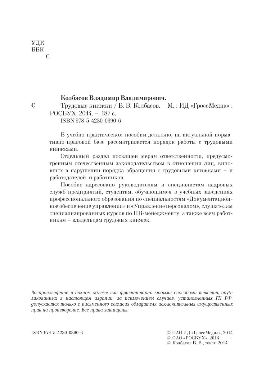 В учебно-практическом пособии детально, на актуальной нормативно-правовой базе рассматривается порядок работы с трудовыми книжками. Отдельный раздел посвящен мерам ответственности, предусмотренным отечественным законодательством в отношении лиц, виновных в нарушении порядка обращения с трудовыми книжками – и работодателей, и работников. Пособие адресовано руководителям и специалистам кадровых служб предприятий, студентам, обучающимся в учебных заведенияхпрофессионального образования по специальностям «Документационное обеспечение управления» и «Управление персоналом», слушателям специализированных курсов по HR-менеджменту, а также всем работникам – владельцам трудовых книжек.
