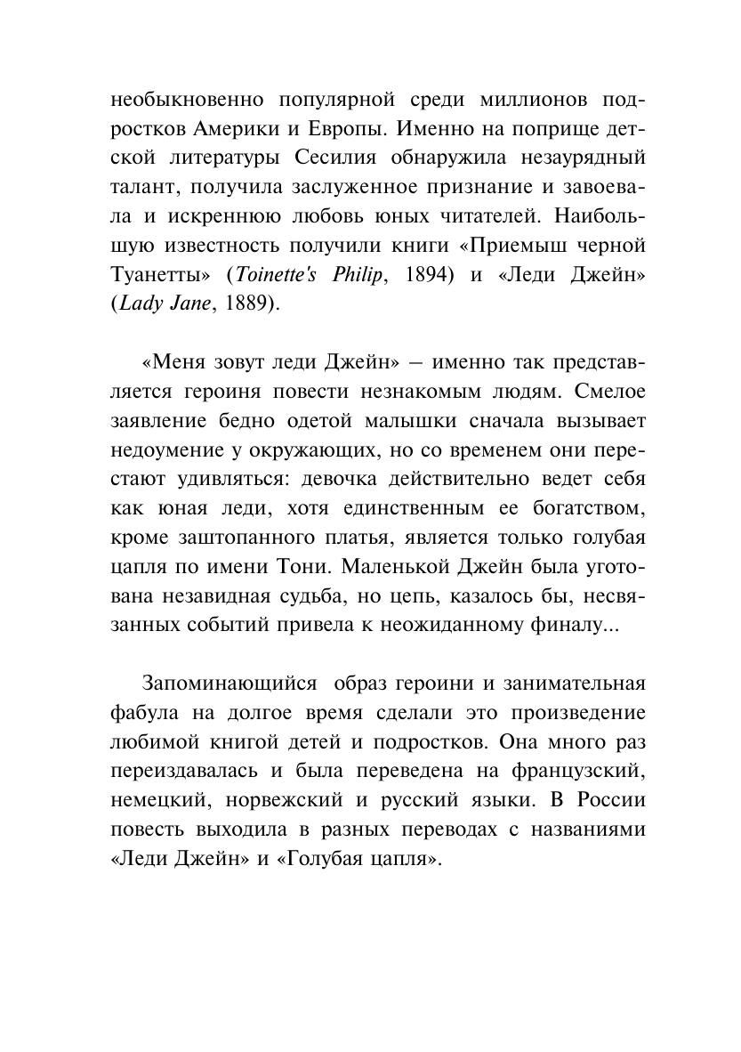 Маленькая Джейн в одночасье остается сиротой. В чужом краю, где у нее нет ни родных, ни знакомых, она попадает к недобрым людям. Единственным другом малышки становится редкая птица – голубая цапля по имени Тони. Однако отважная девочка не падает духом. Добрая душа и благородное сердце помогут ей не только преодолеть все тяготы жизни, но и отыскать родных. Сентиментальная повесть известной американской писательницы Сесилии Джемисон (1837–1909) была в дореволюционной России одной из самых популярных детских книг знаменитой серии «Золотая библиотека».