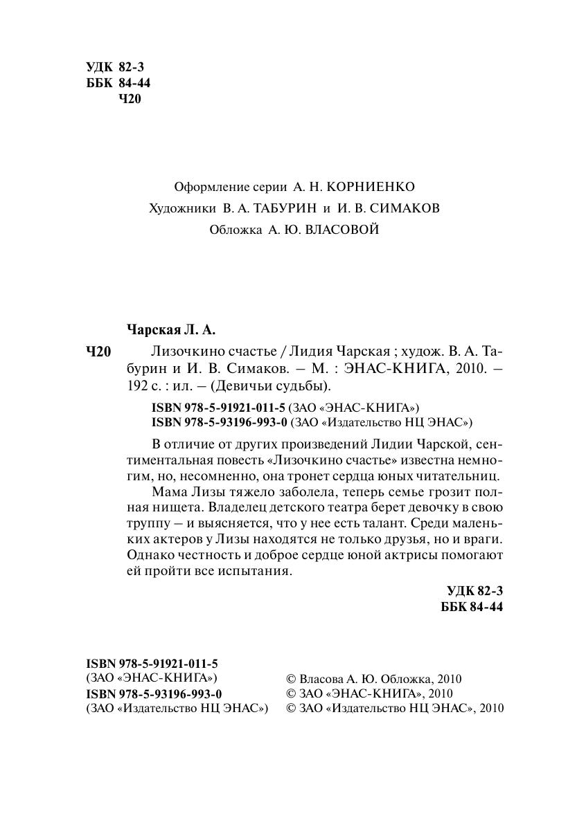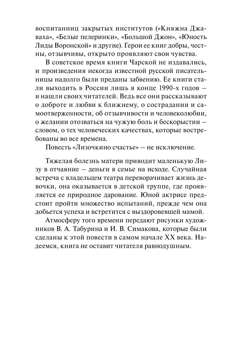 В отличие от других произведений Лидии Чарской, сентиментальная повесть «Лизочкино счастье» известна немногим, но, несомненно, она тронет сердца юных читательниц. Мама Лизы тяжело заболела, теперь семье грозит полная нищета. Владелец детского театра берет девочку в свою труппу – и выясняется, что у нее есть талант. Среди маленьких актеров у Лизы находятся не только друзья, но и враги. Однако честность и доброе сердце юной актрисы помогают ей пройти все испытания.