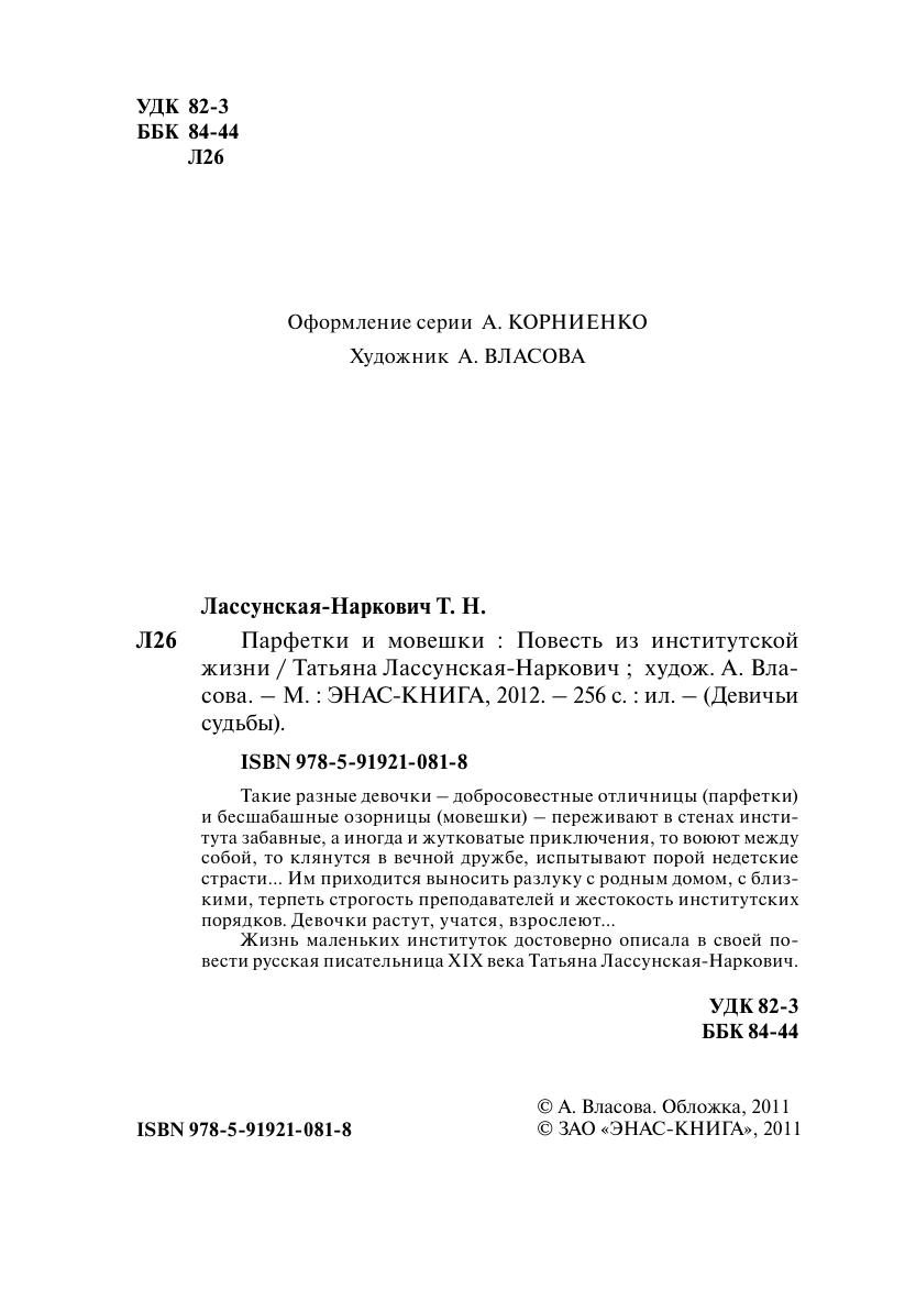 Такие разные девочки – добросовестные отличницы (парфетки)и бесшабашные озорницы (мовешки) – переживают в стенах института забавные, а иногда и жутковатые приключения, то воюют между собой, то клянутся в вечной дружбе, испытывают порой недетские страсти… Им приходится выносить разлуку с родным домом, с близкими, терпеть строгость преподавателей и жестокость институтских порядков. Девочки растут, учатся, взрослеют…Жизнь маленьких институток достоверно описала в своей повести русская писательница XIX века Татьяна Лассунская-Наркович.