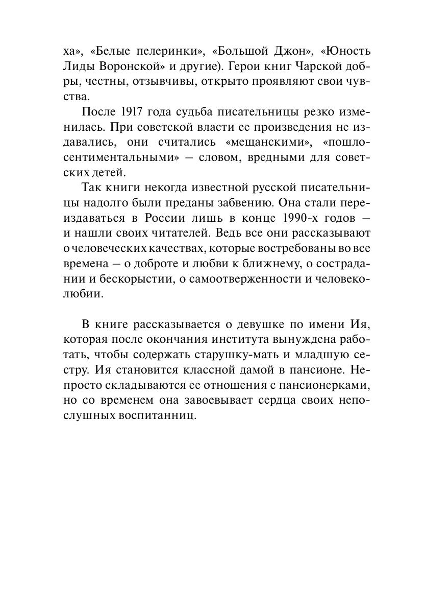 Книга известной писательницы начала ХХ века Лидии Алексеевны Чарской рассказывает о девушке по имени Ия, которая после окончания института вынуждена работать, чтобы содержать старушку-мать и младшую сестру. Ия становится классной дамой в пансионе, и ей предстоит завоевать сердца непослушных воспитанниц.