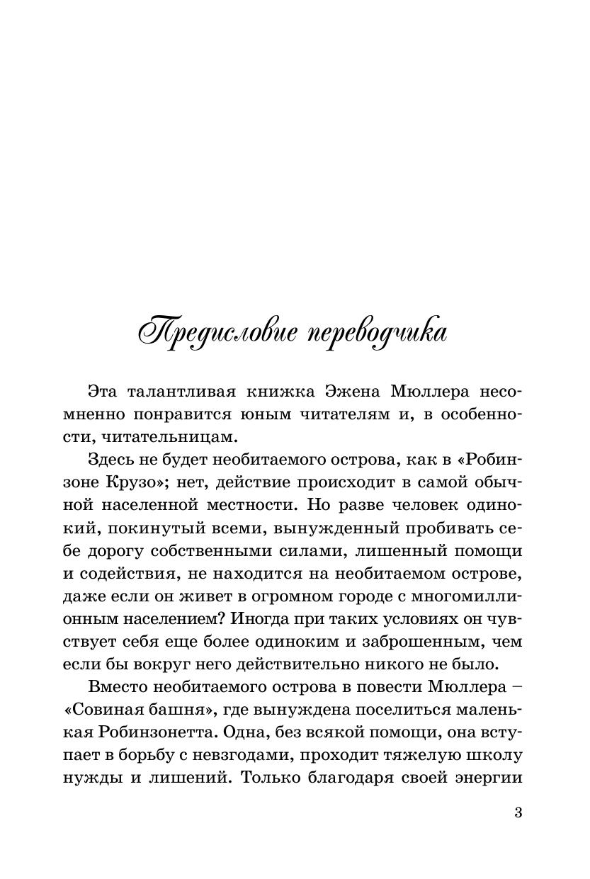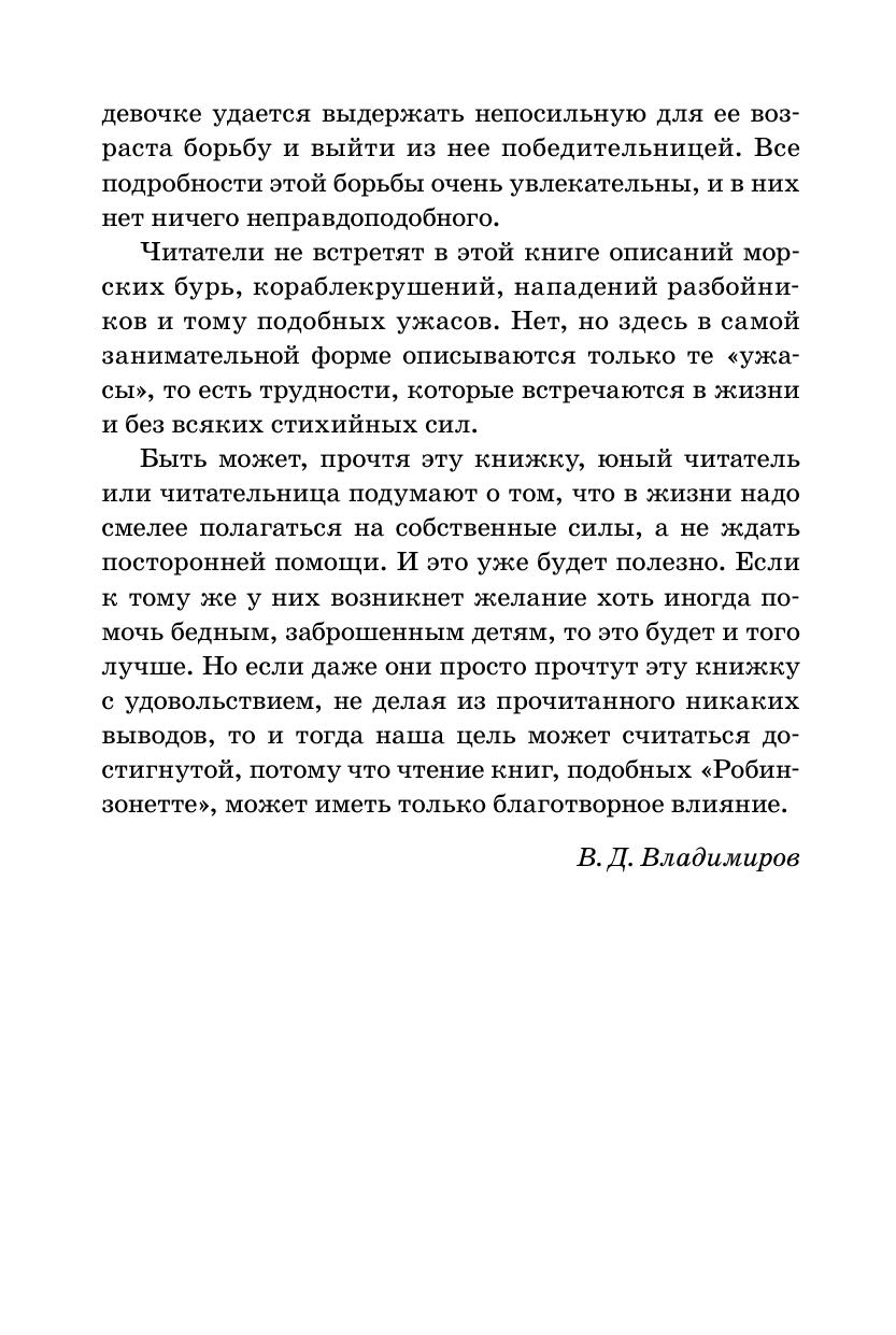 Маленькая сирота, хлебнувшая горя, оказавшись в незнакомых местах, среди чужих людей, сумела, подобно Робинзону на необитаемом острове, не только выжить, но и создать собственное, вполне успешное хозяйство. Благодаря стойкости духа, упорству и трудолюбию девочке удалось завоевать любовь и уважение окружающих, преодолеть всевозможные трудности, невзгоды и, в конце концов, найти свое счастье. Иллюстрации к повести выполнены французским художником Ф. Ликсом в конце XIX столетия; тогда же В. Д. Владимировым был сделан перевод повести на русский язык.