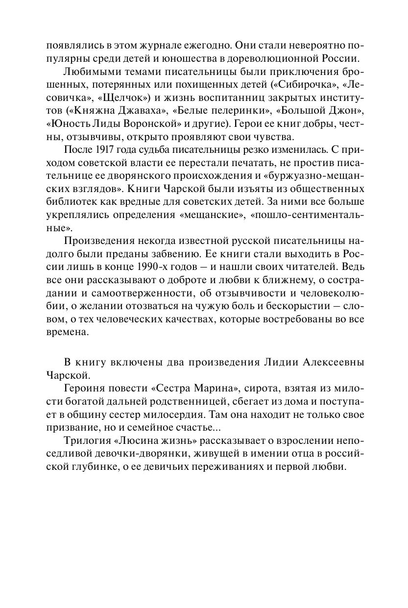 В книгу включены две почти забытые сегодня сентиментальные повести известной писательницы начала ХХ века Лидии Алексеевны Чарской – «Сестра Марина» и «Люсина жизнь».