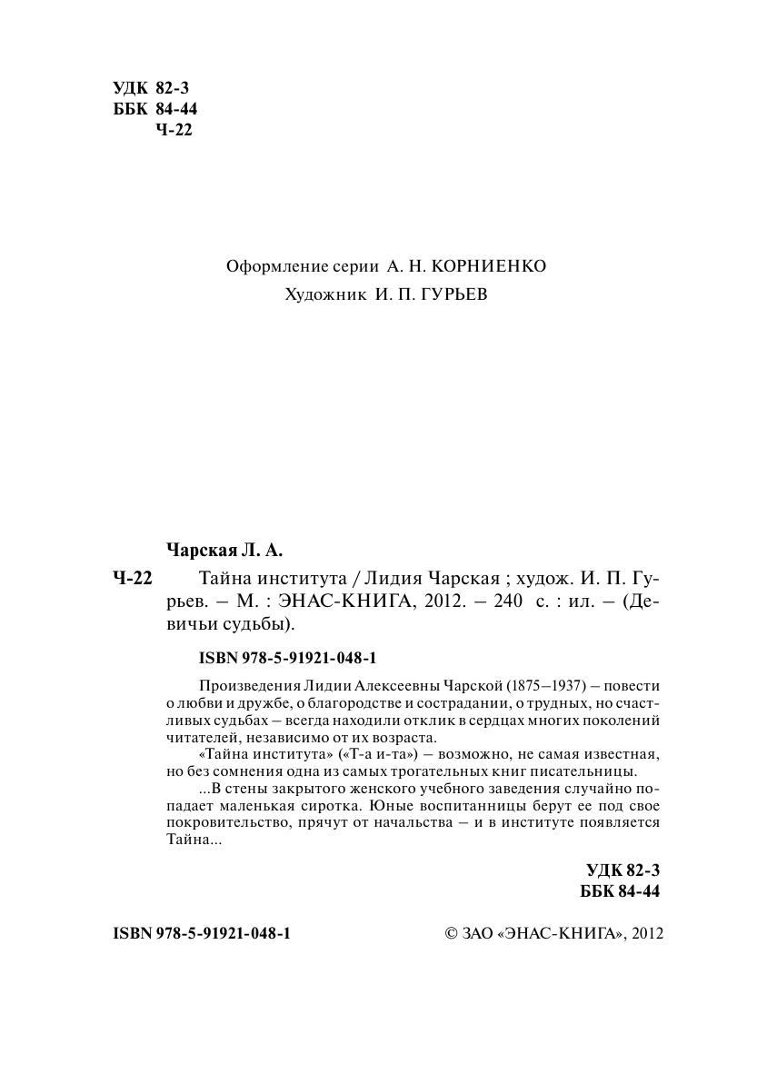 Произведения Лидии Алексеевны Чарской (1875–1937) – повести о любви и дружбе, о благородстве и сострадании, о трудных, но счастливых судьбах – всегда находили отклик в сердцах многих поколений читателей, независимо от их возраста. «Тайна института» («Та и-та») – возможно, не самая известная, но без сомнения одна из самых трогательных книг писательницы. … В стены закрытого женского учебного заведения случайно попадает маленькая сиротка. Юные воспитанницы берут ее под свое покровительство, прячут от начальства – и в институте появляется Тайна…