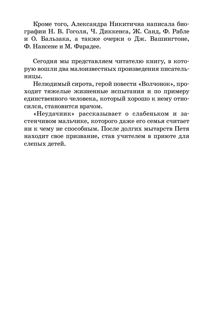 В книгу включены два произведения известной русской писательницы конца XIX – начала ХХ века Александры Никитичны Анненской. Первая повесть называется «Волчонок» – это прозвище главного героя. Нелюдимый мальчик-сирота самостоятельно прокладывает себе дорогу в будущее и исполняет свою мечту – становится врачом. Название второй повести – «Неудачник» – тоже прозвище: так родители и сестры называют болезненного мальчика, не приспособленного ни к тяжелому крестьянскому труду, ни к работе в магазине нечистого на руку родственника. Тем не менее Петя находит свое место в жизни.