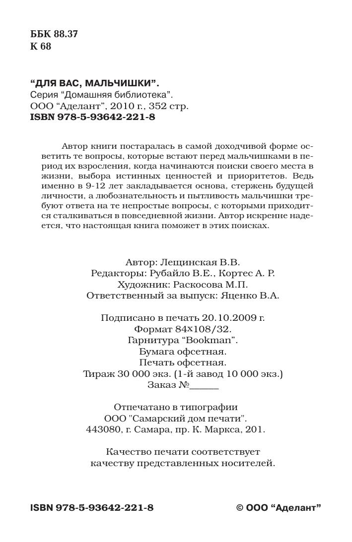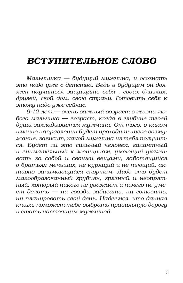 Автор книги постаралась в самой доходчивой форме осветить те вопросы, которые встают перед мальчишками в период их взросления, когда начинаются поиски своего места в жизни, выбора истинных ценностей и приоритетов. Ведь именно в 9-12 лет закладывается основа, стержень будущей личности, а любознательность и пытливость мальчишки требуют ответа на те непростые вопросы, с которыми приходится сталкиваться в повседневной жизни. Автор искренне надеется, что настоящая книга поможет в этих поисках.