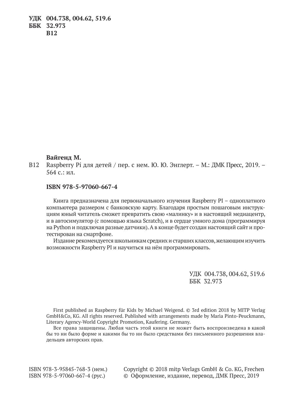 Книга предназначена для первоначального изучения Raspberry PI – одноплатного компьютера размером с банковскую карту. Благодаря простым пошаговым инструкциям юный читатель сможет превратить свою «малинку» и в настоящий медиацентр, и в автосимулятор (с помощью языка Scratch), и в сердце умного дома (программируя на Python и подключая разные датчики). А в конце будет создан настоящий сайт и протестирован на смартфоне. Издание рекомендуется школьникам средних и старших классов, желающим изучить возможности Raspberry PI и научиться на нём программировать.