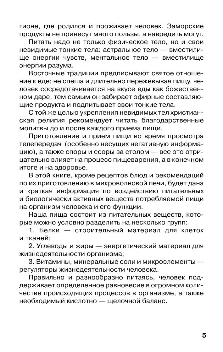 В этой книге, кроме рецептов блюд и рекомендаций по их приготовлению в микроволновой печи, дается и краткая информация по воздействию питательных и биологических активных веществ потребляемой пищи на организм человека и его функции.