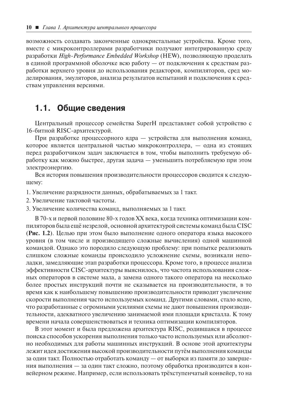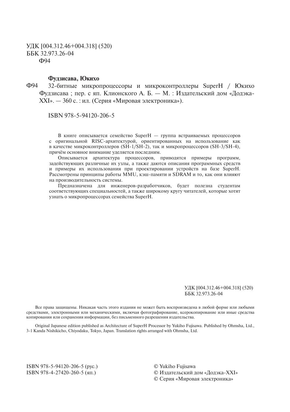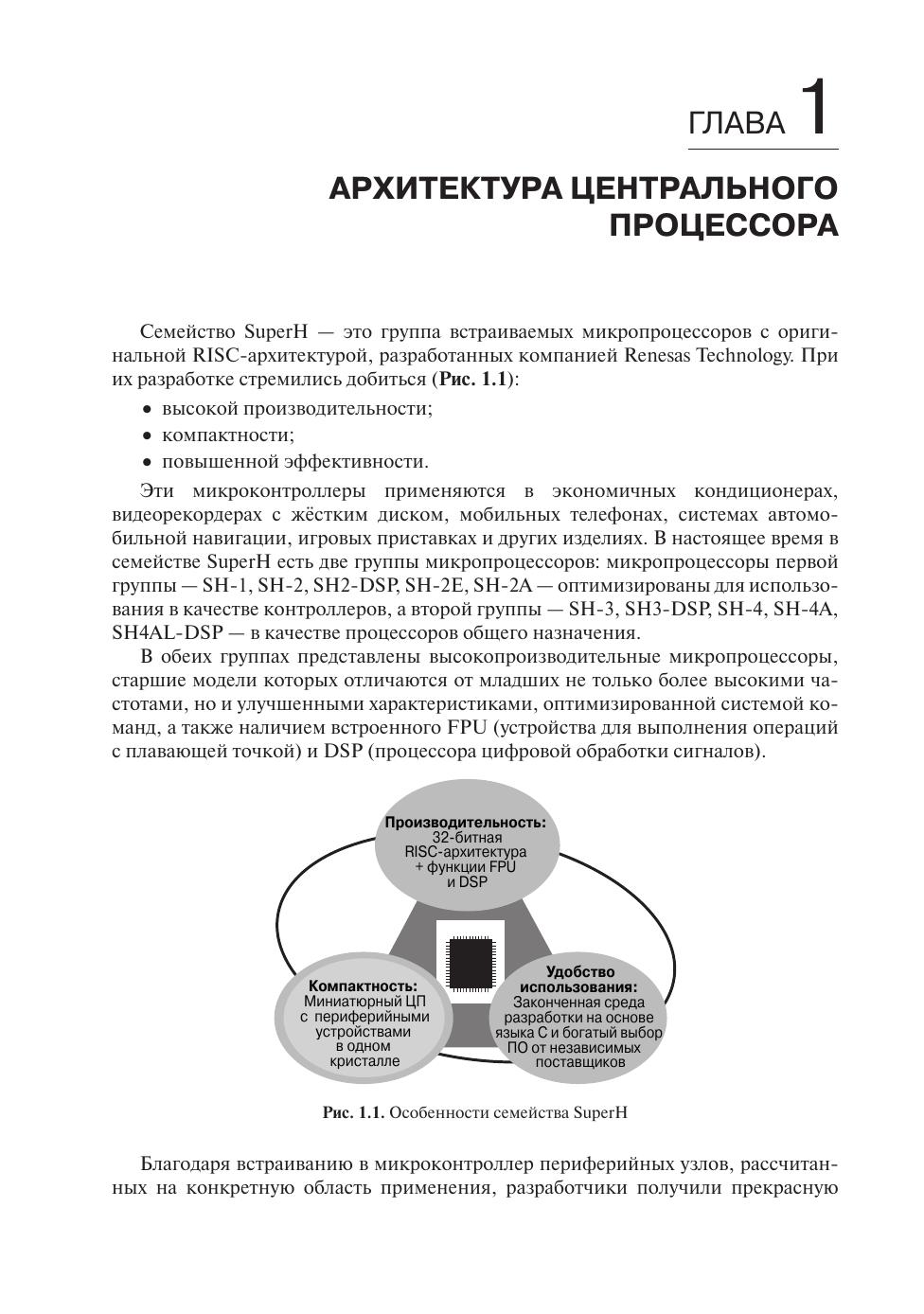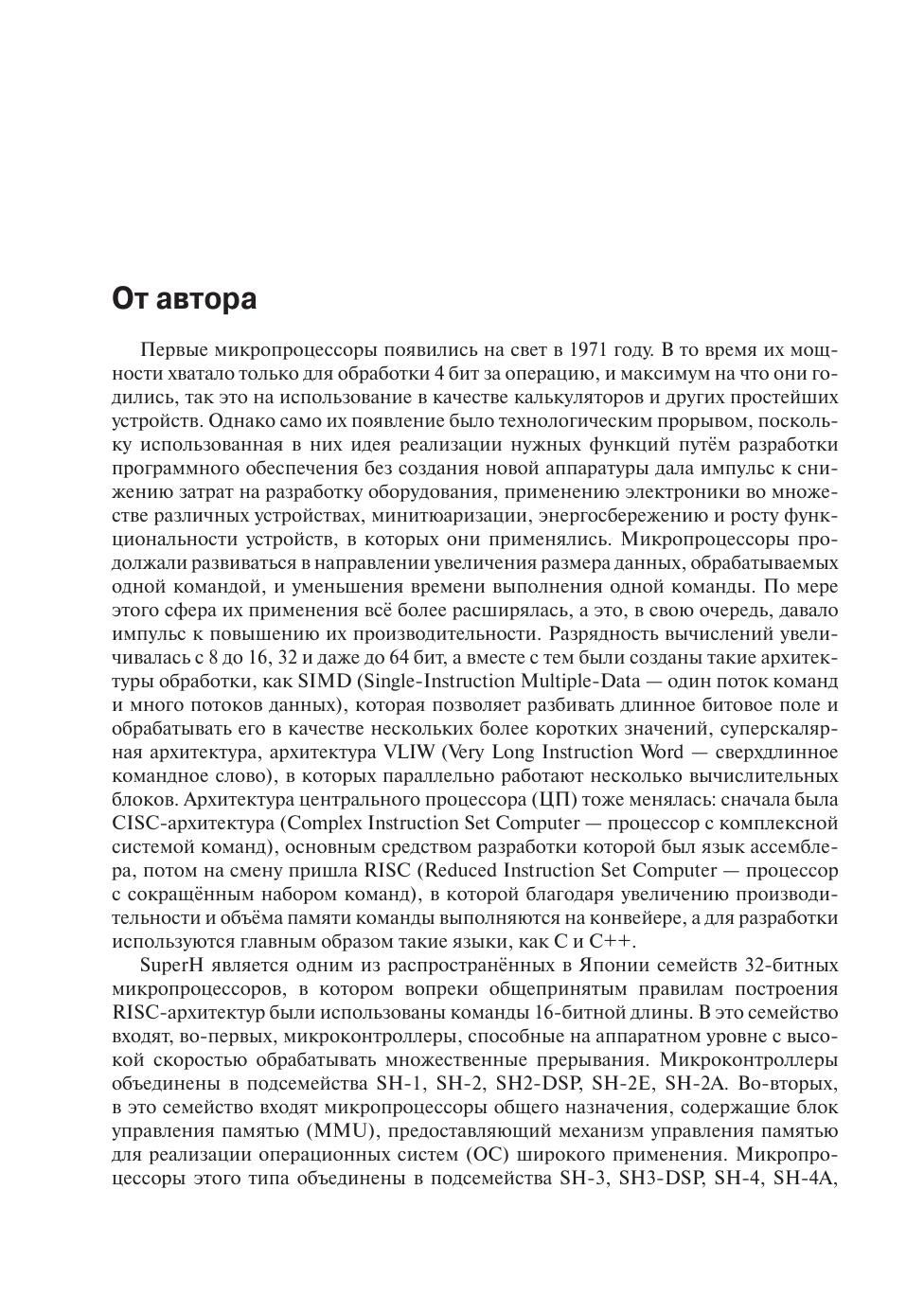 В книге описывается семейство SuperH — группа встраиваемых процессоров с оригинальной RISC-архитектурой, ориентированных на использование как в качестве микроконтроллеров (SH-1/SH-2), так и микропроцессоров (SH-3/SH-4),причём основное внимание уделяется последним. Описывается архитектура процессоров, приводятся примеры программ, задействующих различные их узлы, а также даются описания программных средств и примеры их использования при проектировании устройств на базе SuperH. Рассмотрены принципы работы MMU, кэш-памяти и SDRAM и то, как они влияют на производительность системы. Предназначена для инженеров-разработчиков, будет полезна студентам соответствующих специальностей, а также широкому кругу читателей, которые хотят узнать о микропроцессорах семейства SuperH.