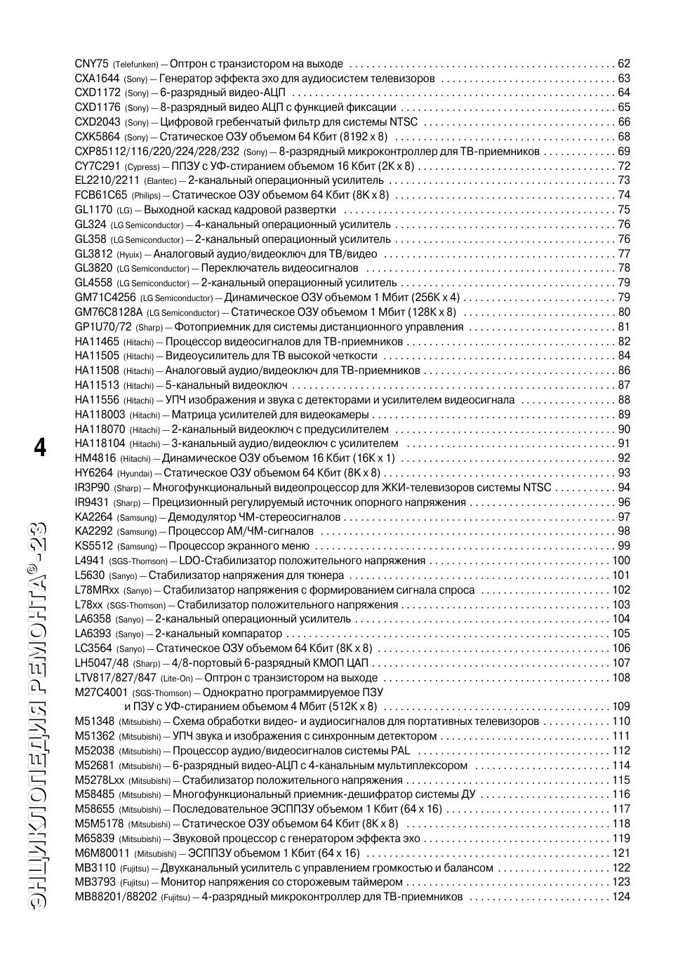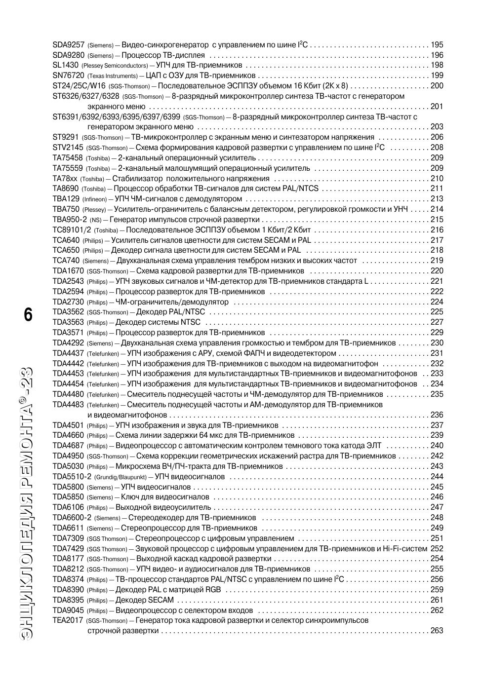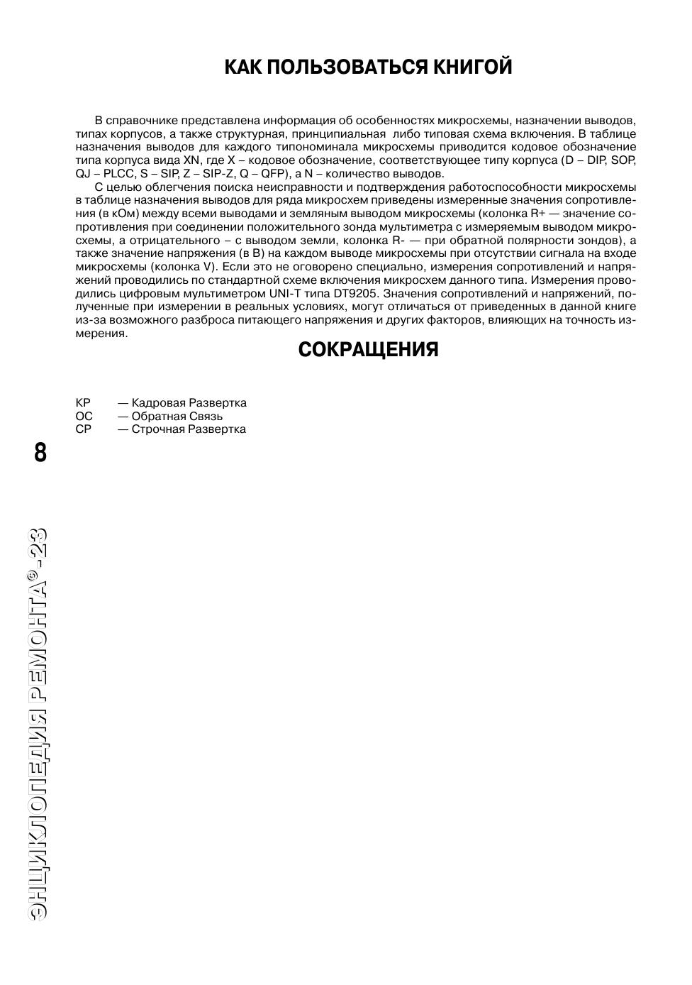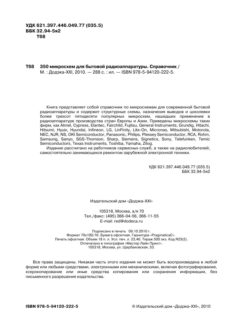Книга представляет собой справочник по микросхемам для современной бытовой радиоаппаратуры и содержит структурные схемы, назначения выводов и цоколевки более трехсот пятидесяти популярных микросхем, нашедших применение врадиоаппаратуре производства стран Европы и Азии. Приведены микросхемы таких фирм, как Atmel, Cypress, Elantec, Fairchild, Fujitsu, General Instruments, Grundig, Hitachi, Hitsumi, Hyuix, Hyundai, Infineon, LG, LinFinity, Lite On, Micronas, Mitsubishi, Motorola, NEC, NJR, NS, OKI Semiconductor, Panasonic, Philips, Plessey Semiconductor, RCA, Rohm, Samsung, Sanyo, SGS Thomson, Sharp, Siemens, Signetics, Sony, Telefunken, Temic Semiconductors, Texas Instruments, Toshiba, Yamaha, Zilog.Издание рассчитано на работников сервисных служб, а также на радиолюбителей, самостоятельно занимающихся ремонтом зарубежной электронной техники.