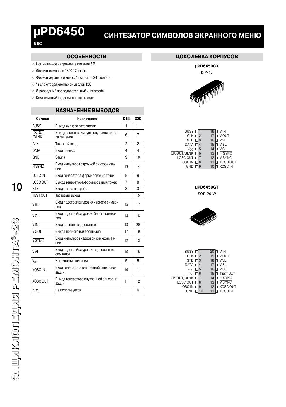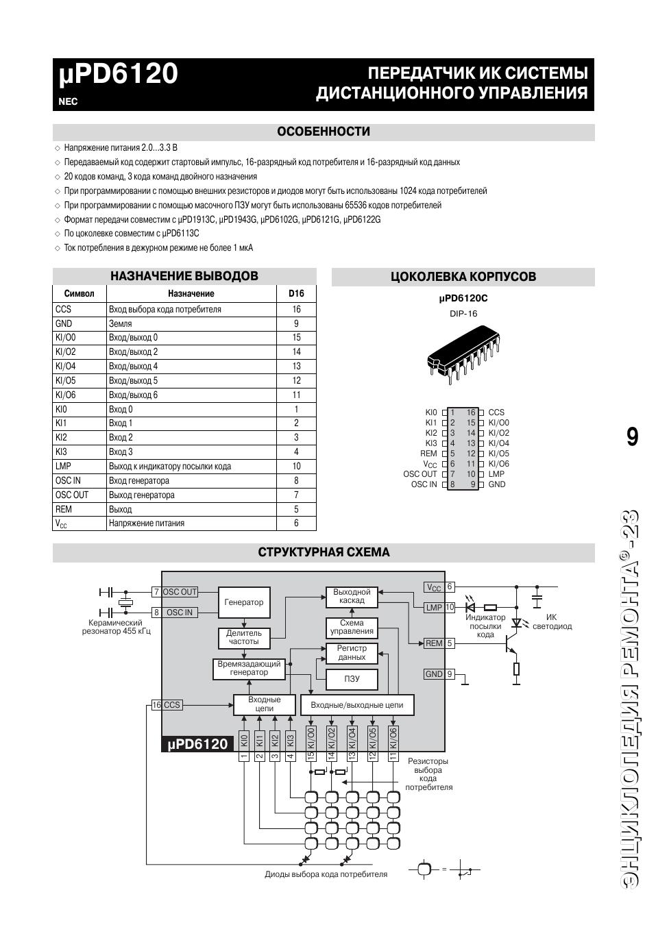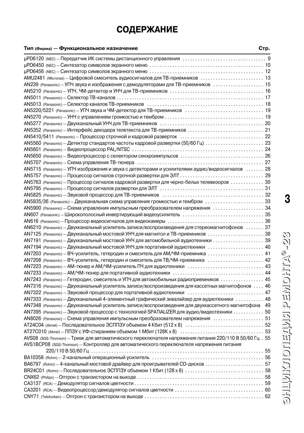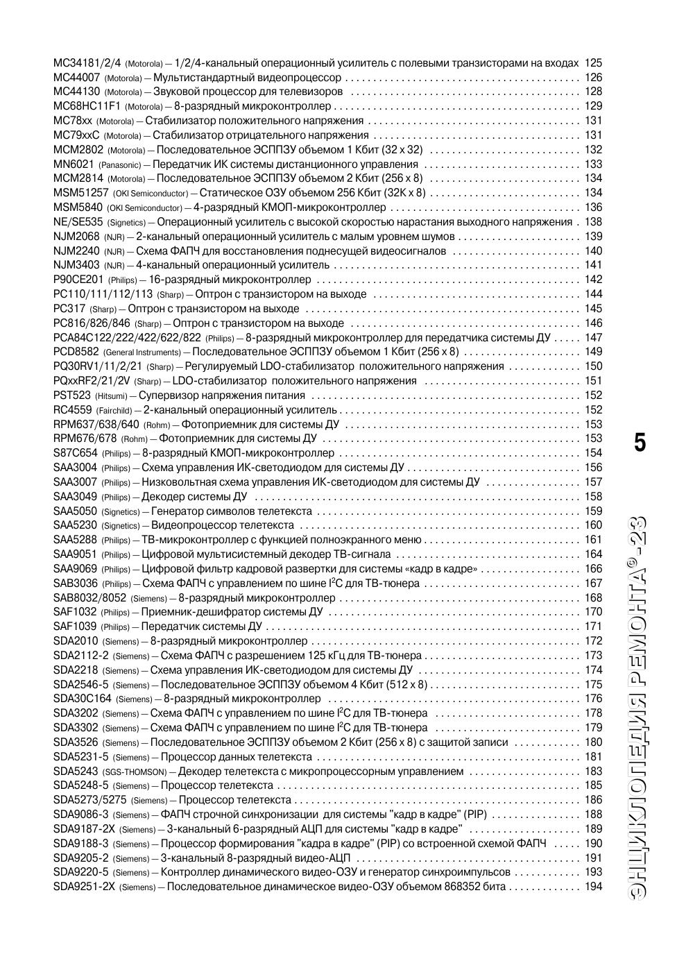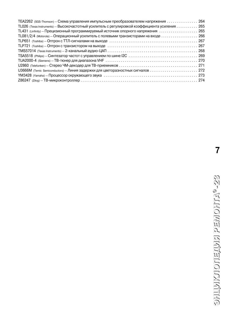 Книга представляет собой справочник по микросхемам для современной бытовой радиоаппаратуры и содержит структурные схемы, назначения выводов и цоколевки более трехсот пятидесяти популярных микросхем, нашедших применение врадиоаппаратуре производства стран Европы и Азии. Приведены микросхемы таких фирм, как Atmel, Cypress, Elantec, Fairchild, Fujitsu, General Instruments, Grundig, Hitachi, Hitsumi, Hyuix, Hyundai, Infineon, LG, LinFinity, Lite On, Micronas, Mitsubishi, Motorola, NEC, NJR, NS, OKI Semiconductor, Panasonic, Philips, Plessey Semiconductor, RCA, Rohm, Samsung, Sanyo, SGS Thomson, Sharp, Siemens, Signetics, Sony, Telefunken, Temic Semiconductors, Texas Instruments, Toshiba, Yamaha, Zilog.Издание рассчитано на работников сервисных служб, а также на радиолюбителей, самостоятельно занимающихся ремонтом зарубежной электронной техники.