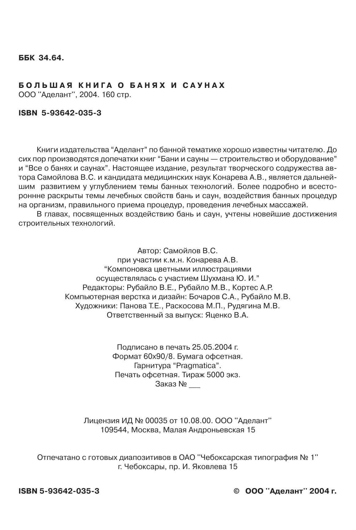 Книги издательства “Аделант” по банной тематике хорошо известны читателю. До сих пор производятся допечатки книг “Бани и сауны — строительство и оборудование” и “Все о банях и саунах”. Настоящее издание, результат творческого содружества автора Самойлова В.С. и кандидата медицинских наук Конарева А.В., является дальнейшим развитием и углублением темы банных технологий. Более подробно и всестороннне раскрыты темы лечебных свойств бань и саун, воздействия банных процедур на организм, правильного приема процедур, проведения лечебных массажей.