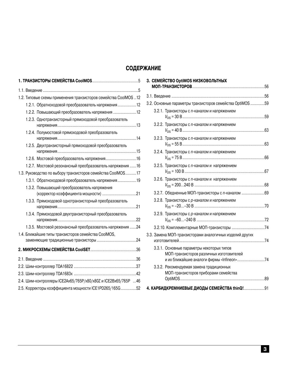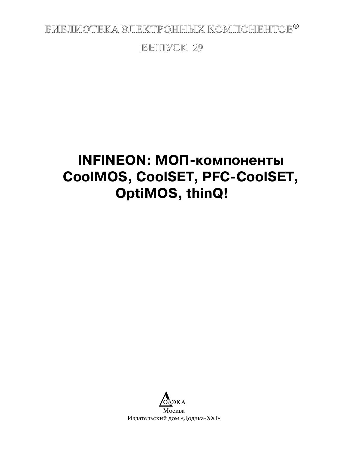 В обзоре представлены новые компоненты силовой электроники фирмы «Infineon»: МОП-транзисторы семейств CoolMOS и OptiMOS, микросхемы для управления импульсными источниками питания семейства CoolSET, корректоры коэффициента мощности семейства PFC-CoolSET, а также сверхбыстродействующие карбидкремниевые диоды семейства thinQ! Представлены таблицы основных параметров и рекомендации по применению. Для специалистов в области электроники и радиолюбителей.