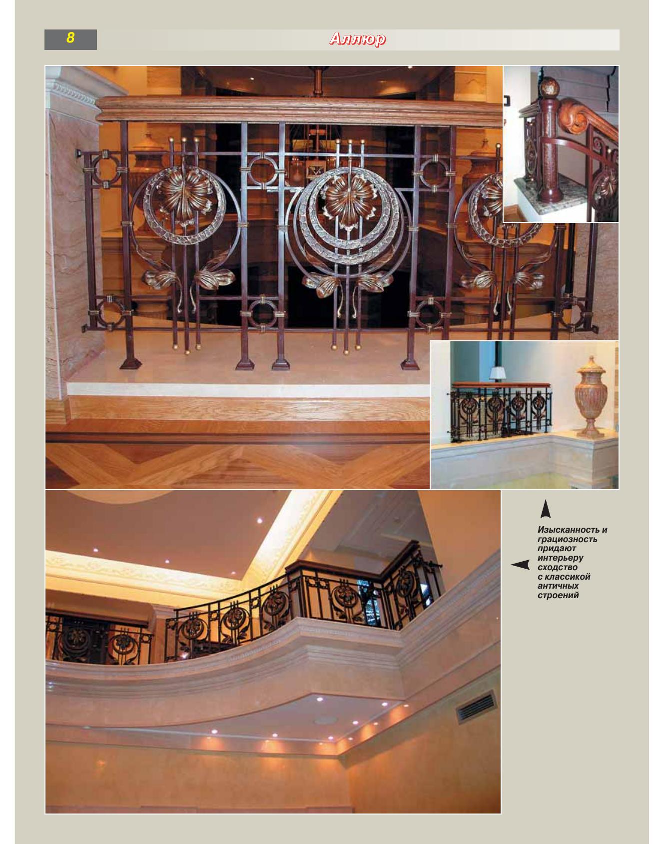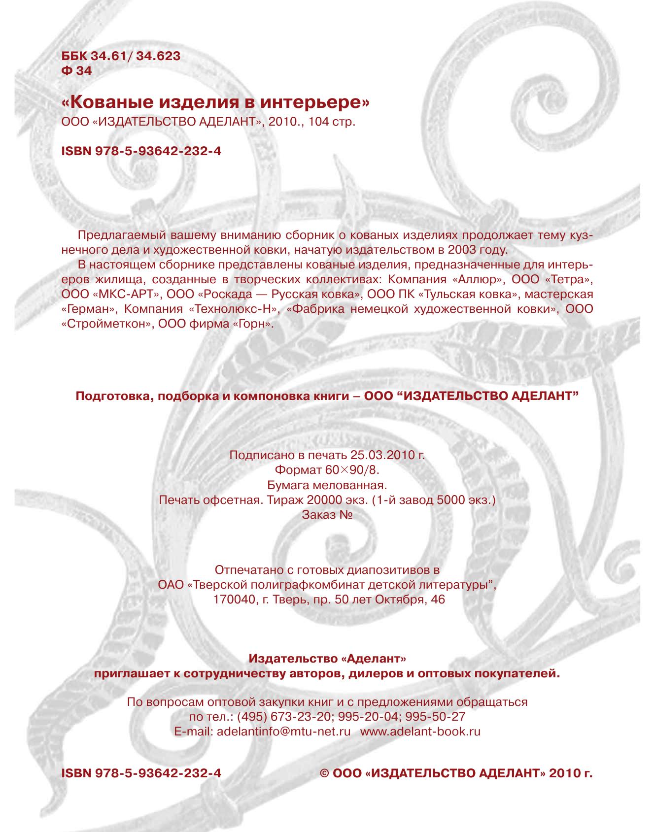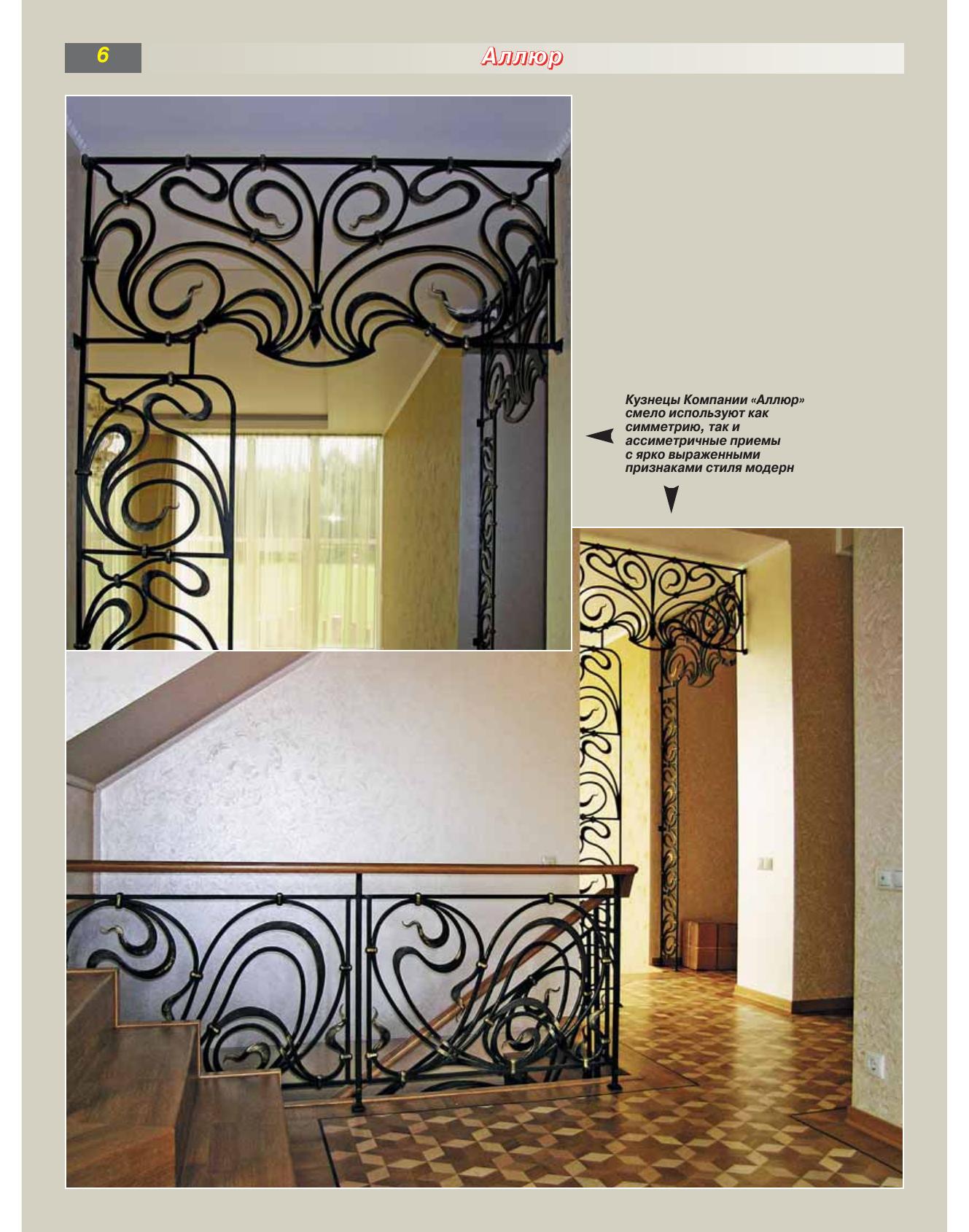 В настоящем сборнике представлены кованые изделия, предназначенные для интерьеров жилища, созданные в творческих коллективах: Компания «Аллюр», ООО «Тетра», ООО «МКС6АРТ», ООО «Рос ка да — Русская ковка», ООО ПК «Тульская ковка», мастерская «Герман», Компания «Технолюкс-Н», «Фабрика немецкой художественной ковки», ООО «Стройметкон», ООО фирма «Горн».