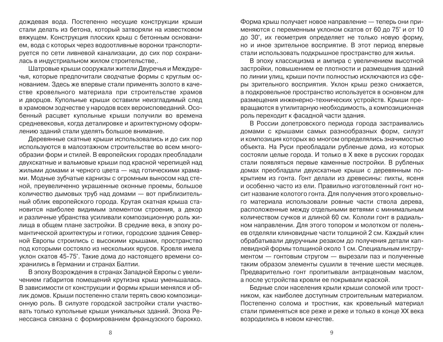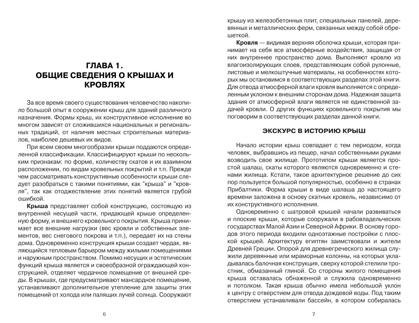 Общие сведения о крышах и кровлях. Конструктивные решения крыш и стропильных систем. Сопряжение вальмовых, ломаных и многощипцовых крыш. Проектирование, возведение и обустройство мансард. Металлические, шиферные, черепичные, рулонные кровли. Системы вентиляции, водоотвода, кабельного подогрева.
