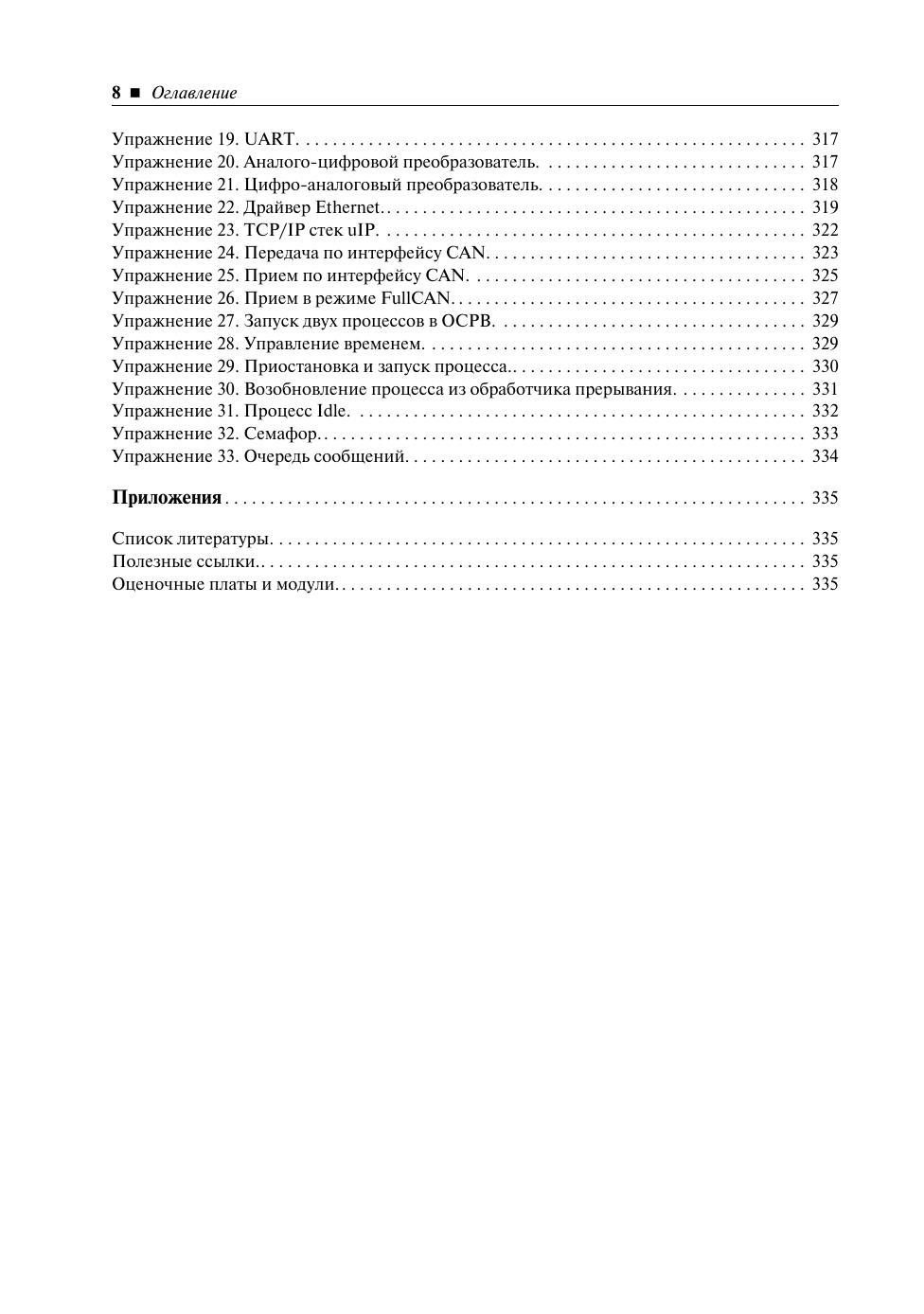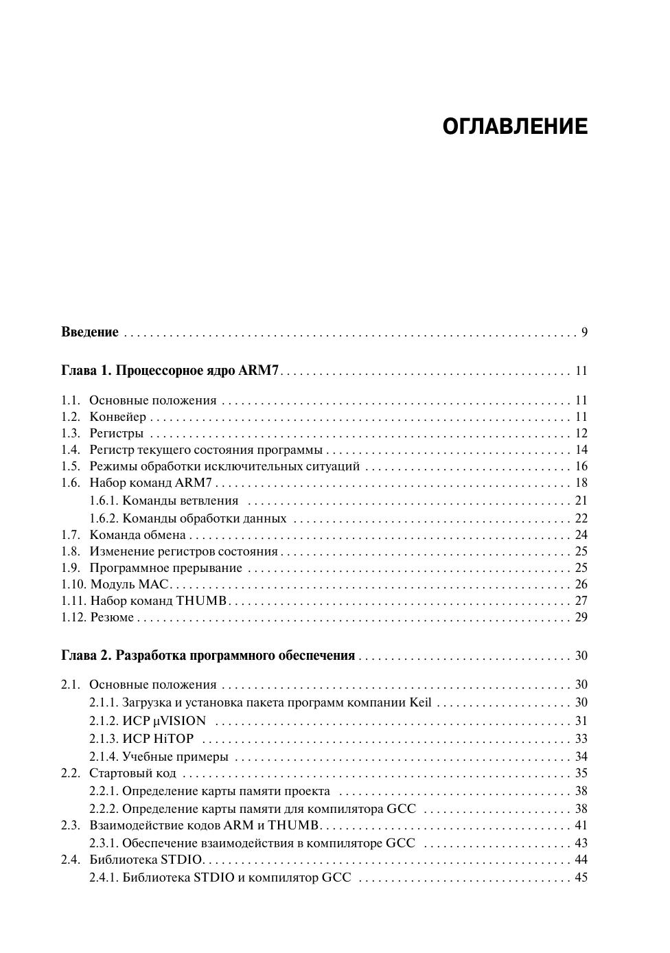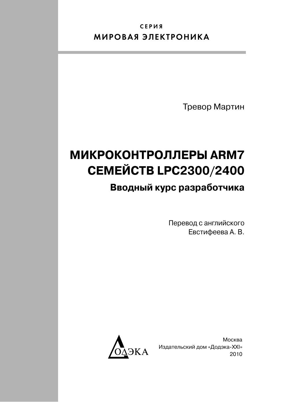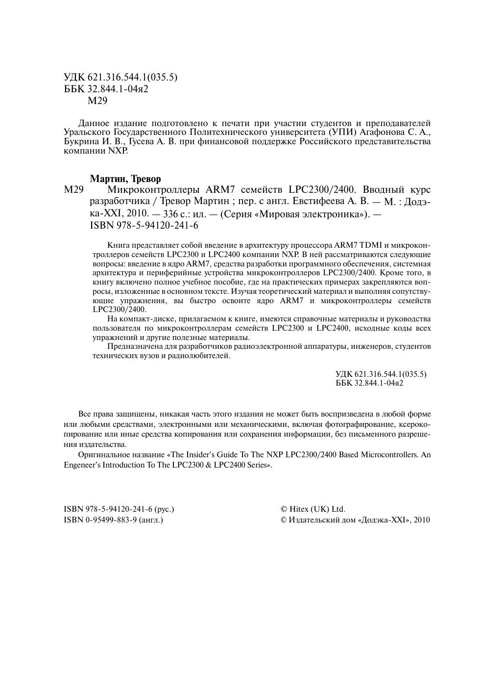 Книга представляет собой введение в архитектуру процессора ARM7 TDMI и микроконтроллеров семейств LPC2300 и LPC2400 компании NXP. В ней рассматриваются следующие вопросы: введение в ядро ARM7, средства разработки программного обеспечения, системная архитектура и периферийные устройства микроконтроллеров LPC2300/2400. Кроме того, в книгу включено полное учебное пособие, где на практических примерах закрепляются вопросы, изложенные в основном тексте. Изучая теоретический материал и выполняя сопутствующие упражнения, вы быстро освоите ядро ARM7 и микроконтроллеры семейств LPC2300/2400. Предназначена для разработчиков радиоэлектронной аппаратуры, инженеров, студентов технических вузов и радиолюбителей.