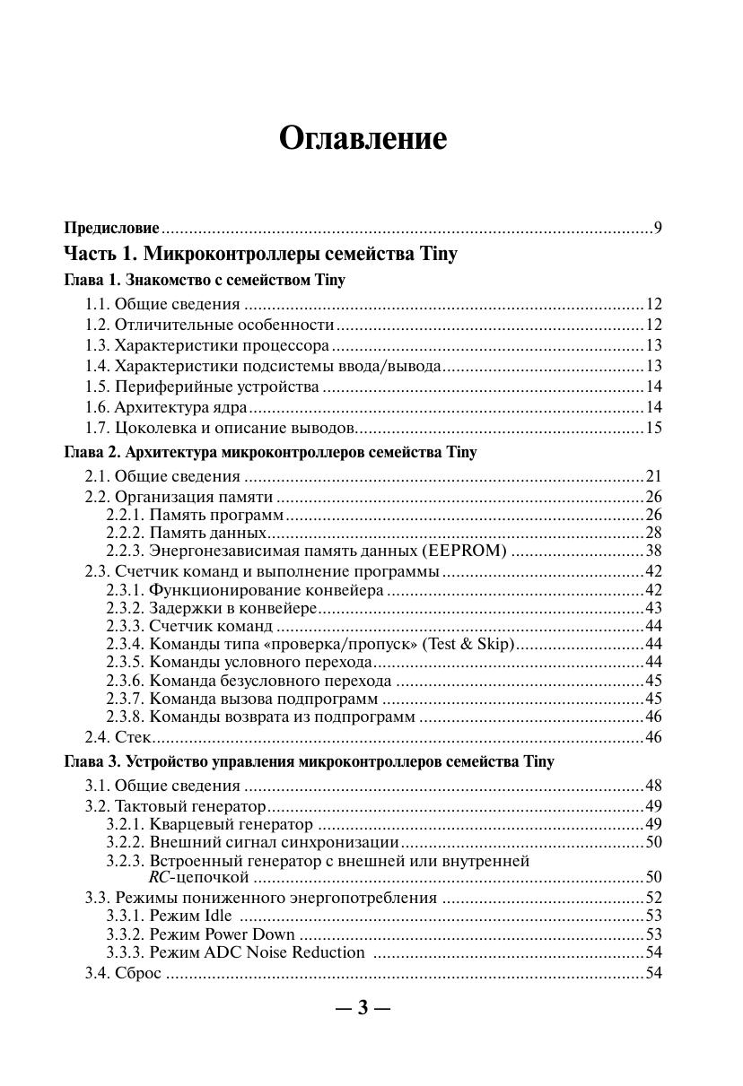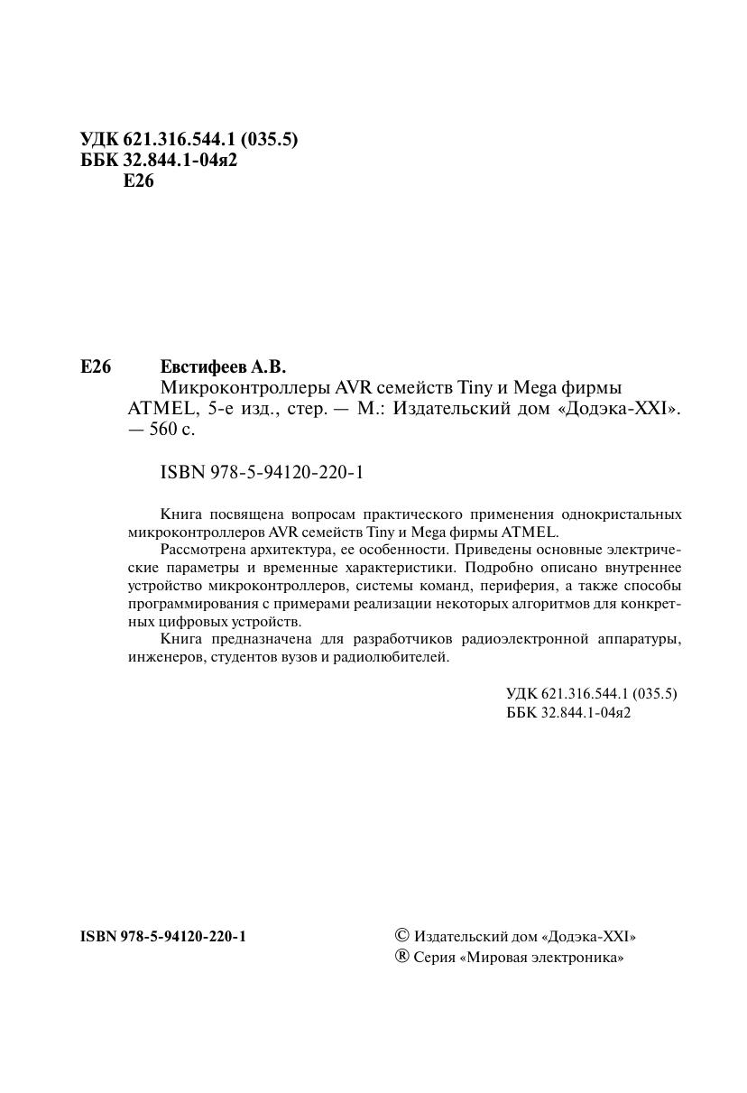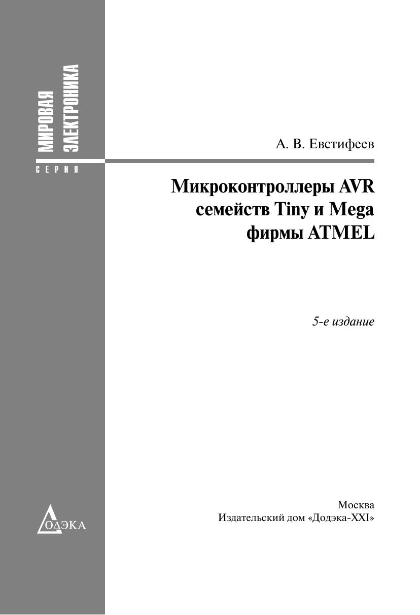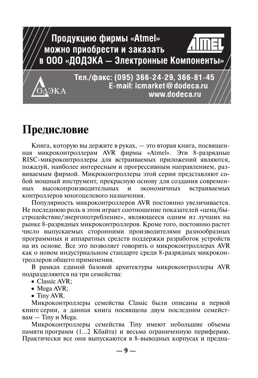 Книга посвящена вопросам практического применения однокристальных микроконтроллеров AVR семейств Tiny и Mega фирмы ATMEL. Рассмотрена архитектура, ее особенности. Приведены основные электрические параметры и временные характеристики. Подробно описано внутреннее устройство микроконтроллеров, системы команд, периферия, а также способы программирования с примерами реализации некоторых алгоритмов для конкретных цифровых устройств. Книга предназначена для разработчиков радиоэлектронной аппаратуры, инженеров, студентов вузов и радиолюбителей.