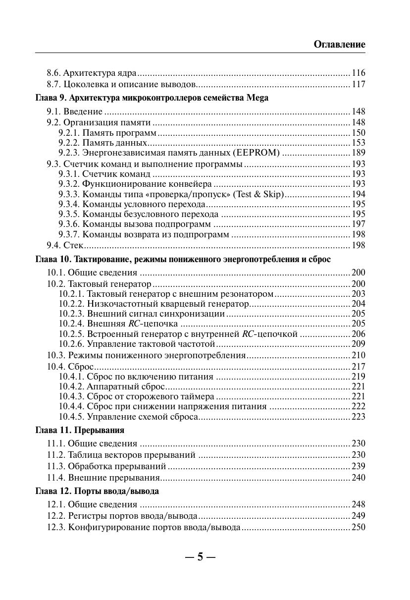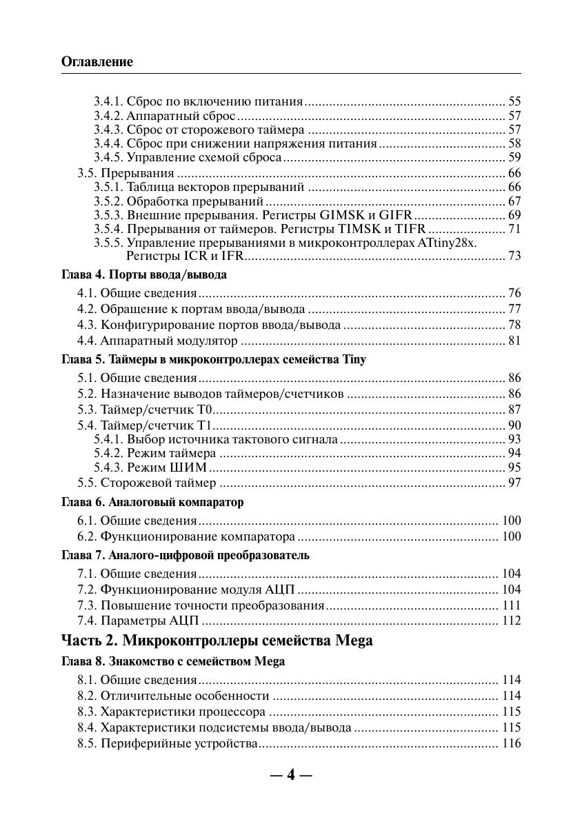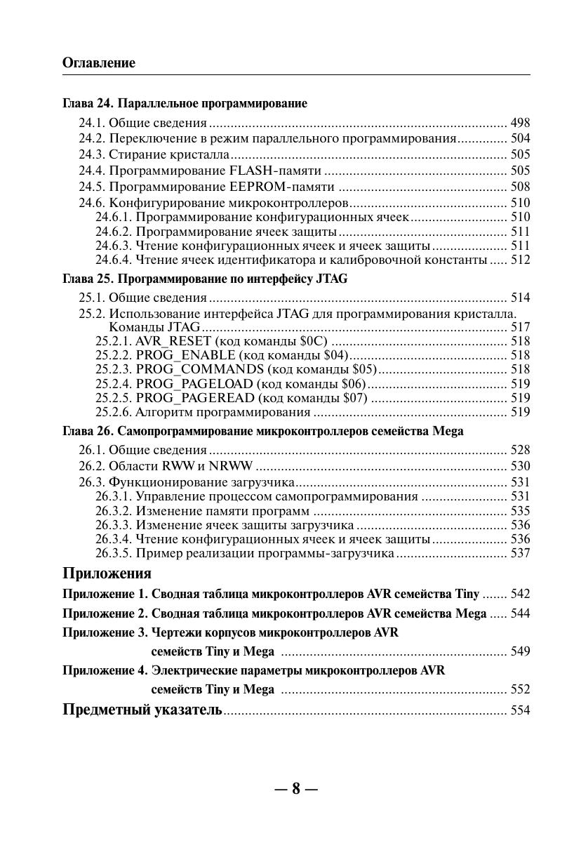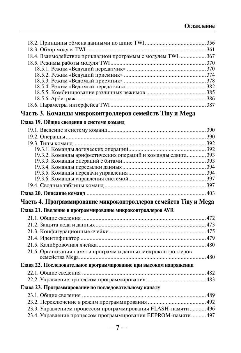 Книга посвящена вопросам практического применения однокристальных микроконтроллеров AVR семейств Tiny и Mega фирмы ATMEL. Рассмотрена архитектура, ее особенности. Приведены основные электрические параметры и временные характеристики. Подробно описано внутреннее устройство микроконтроллеров, системы команд, периферия, а также способы программирования с примерами реализации некоторых алгоритмов для конкретных цифровых устройств. Книга предназначена для разработчиков радиоэлектронной аппаратуры, инженеров, студентов вузов и радиолюбителей.