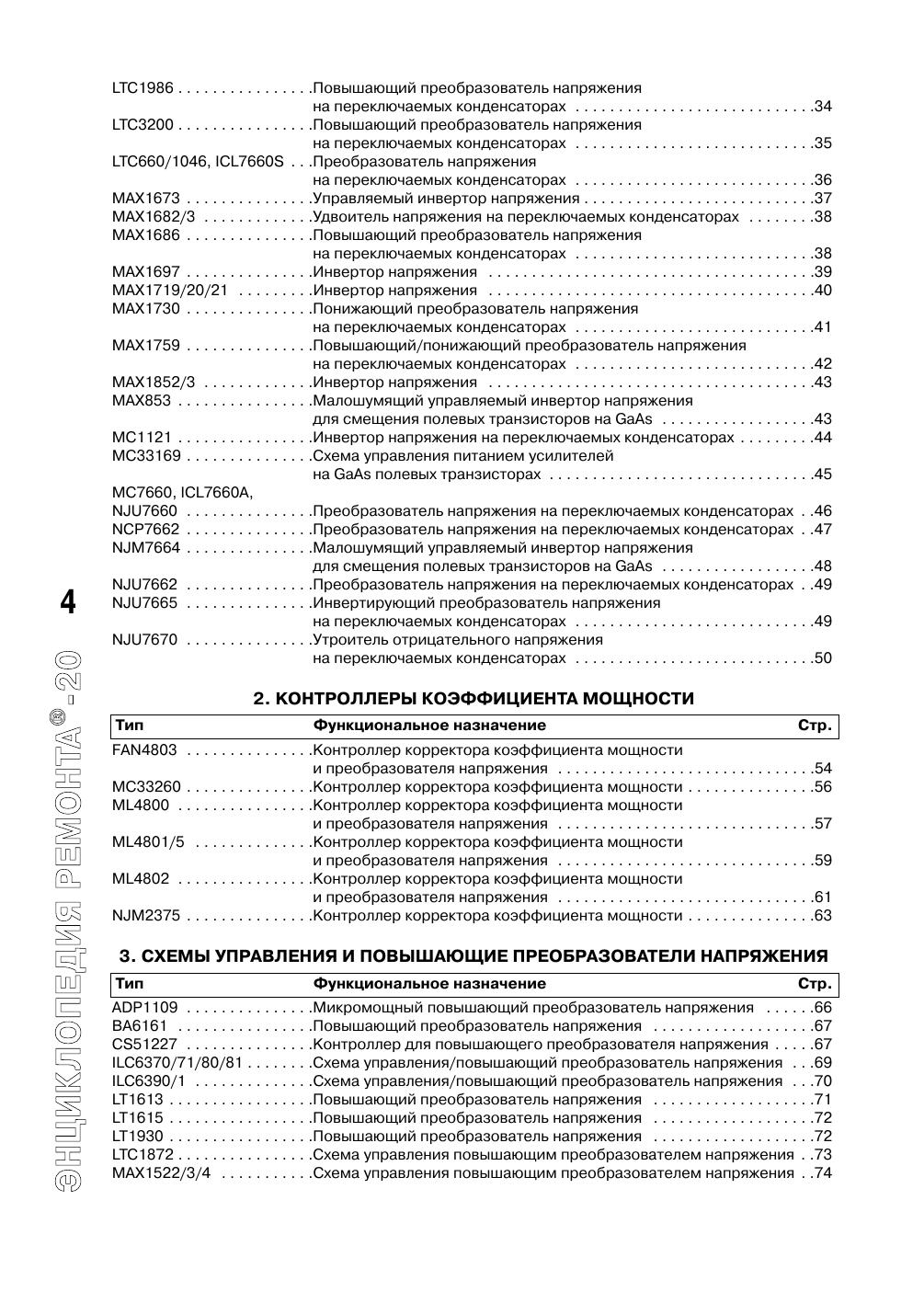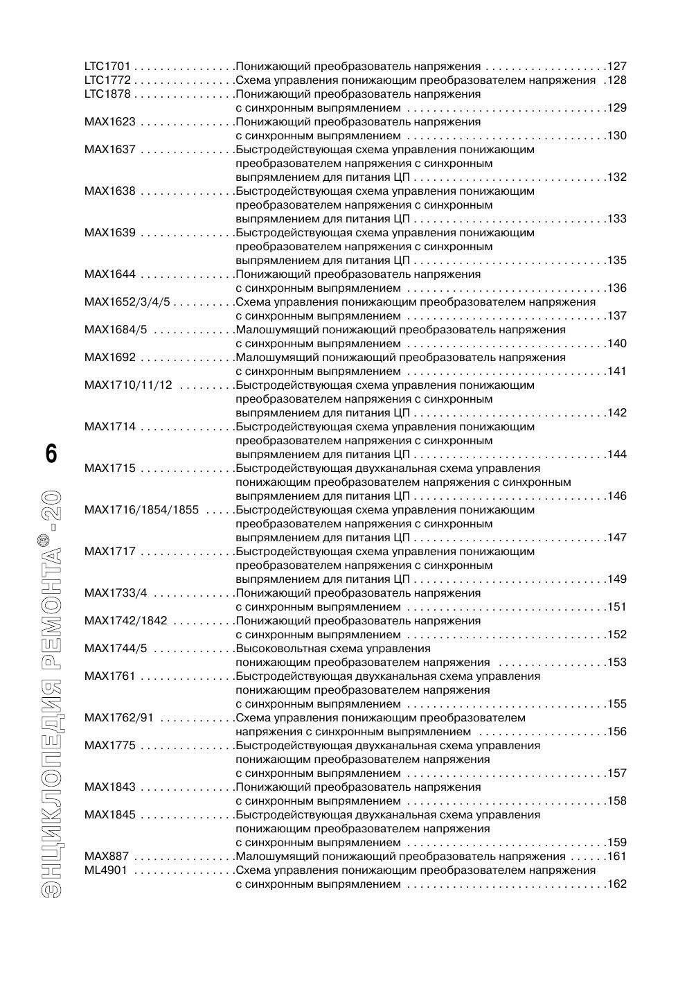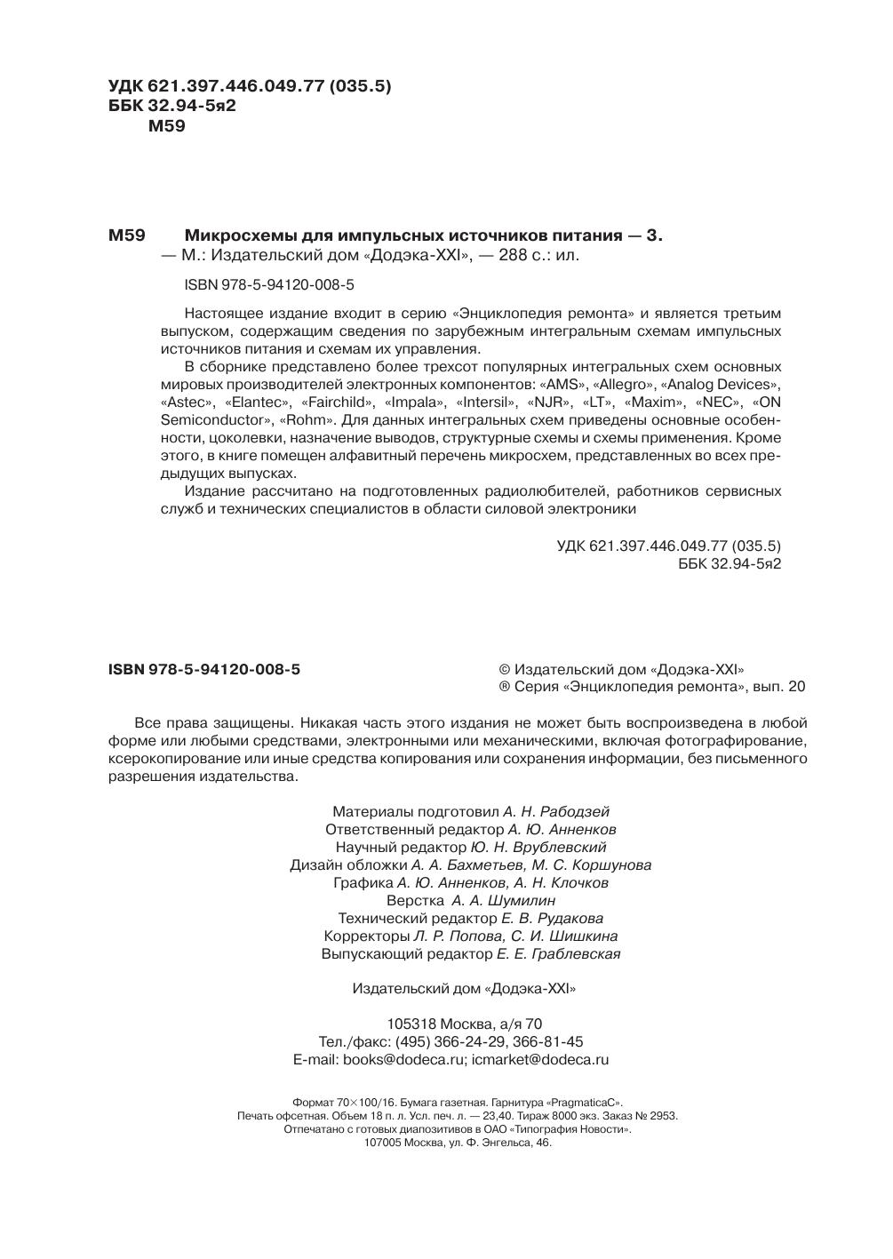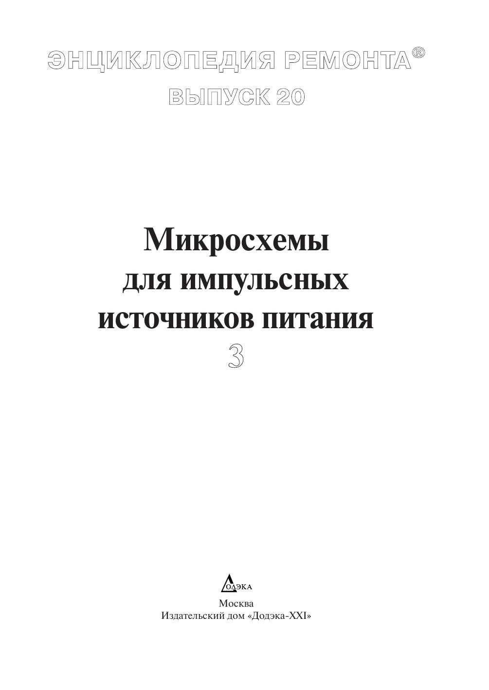 Настоящее издание входит в серию «Энциклопедия ремонта» и является третьим выпуском, содержащим сведения по зарубежным интегральным схемам импульсных источников питания и схемам их управления. В сборнике представлено более трехсот популярных интегральных схем основных мировых производителей электронных компонентов: «AMS», «Allegro», «Analog Devices», «Astec», «Elantec», «Fairchild», «Impala», «Intersil», «NJR», «LT», «Maxim», «NEC», «ON Semiconductor», «Rohm». Для данных интегральных схем приведены основные особенности, цоколевки, назначение выводов, структурные схемы и схемы применения. Кроме этого, в книге помещен алфавитный перечень микросхем, представленных во всех предыдущих выпусках. Издание рассчитано на подготовленных радиолюбителей, работников сервисных служб и технических специалистов в области силовой электроники.
