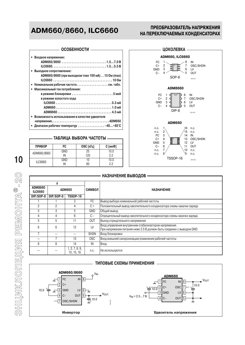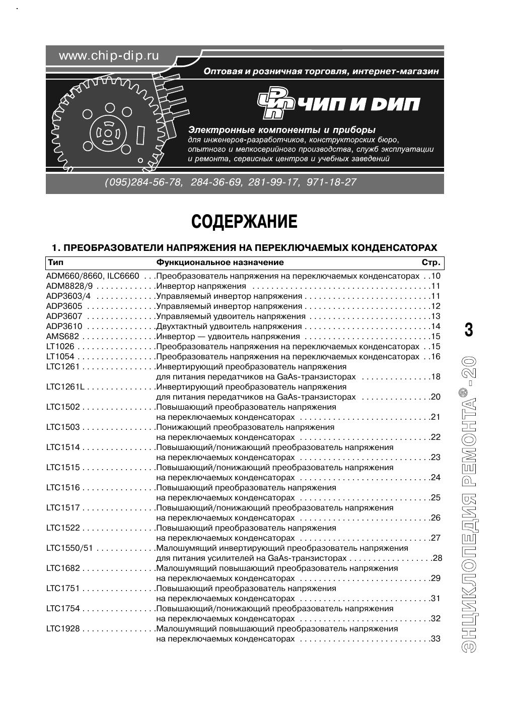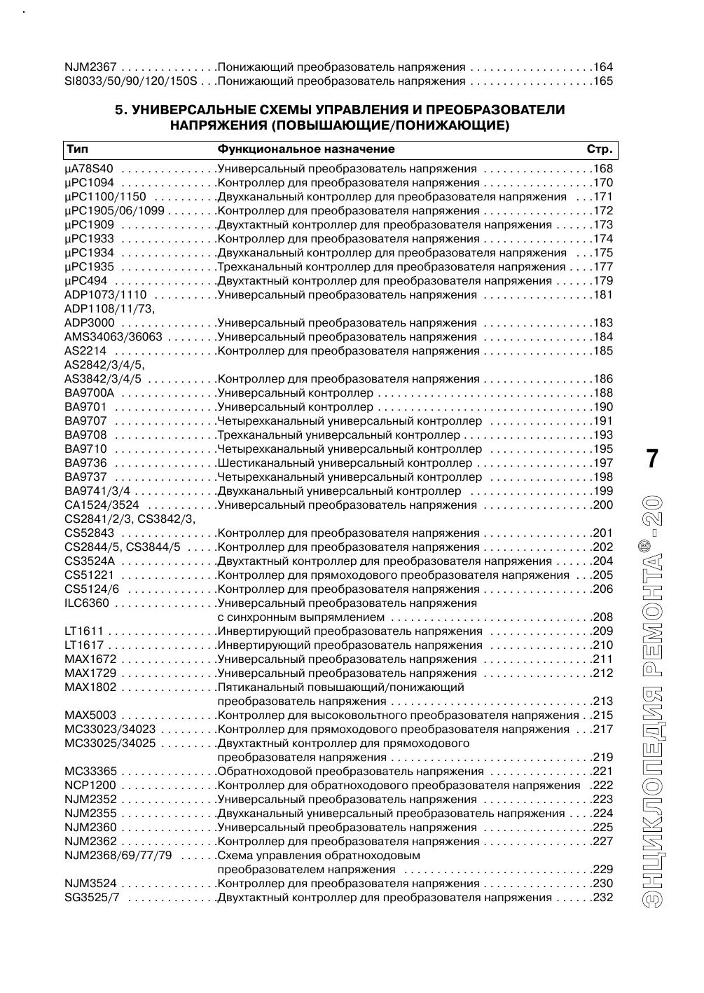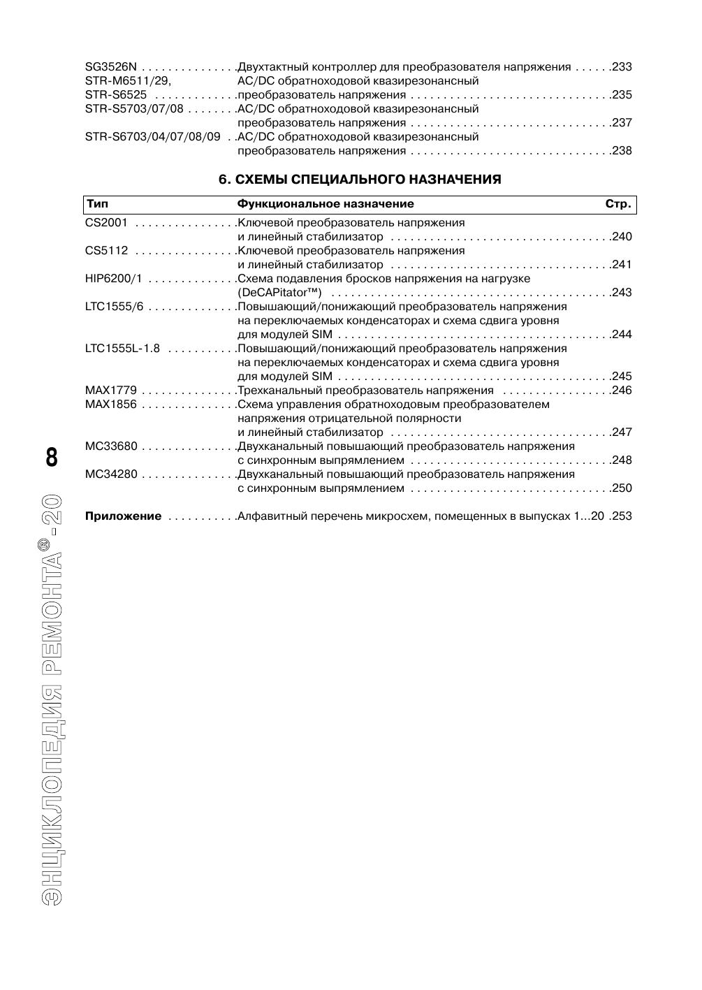 Настоящее издание входит в серию «Энциклопедия ремонта» и является третьим выпуском, содержащим сведения по зарубежным интегральным схемам импульсных источников питания и схемам их управления. В сборнике представлено более трехсот популярных интегральных схем основных мировых производителей электронных компонентов: «AMS», «Allegro», «Analog Devices», «Astec», «Elantec», «Fairchild», «Impala», «Intersil», «NJR», «LT», «Maxim», «NEC», «ON Semiconductor», «Rohm». Для данных интегральных схем приведены основные особенности, цоколевки, назначение выводов, структурные схемы и схемы применения. Кроме этого, в книге помещен алфавитный перечень микросхем, представленных во всех предыдущих выпусках. Издание рассчитано на подготовленных радиолюбителей, работников сервисных служб и технических специалистов в области силовой электроники.