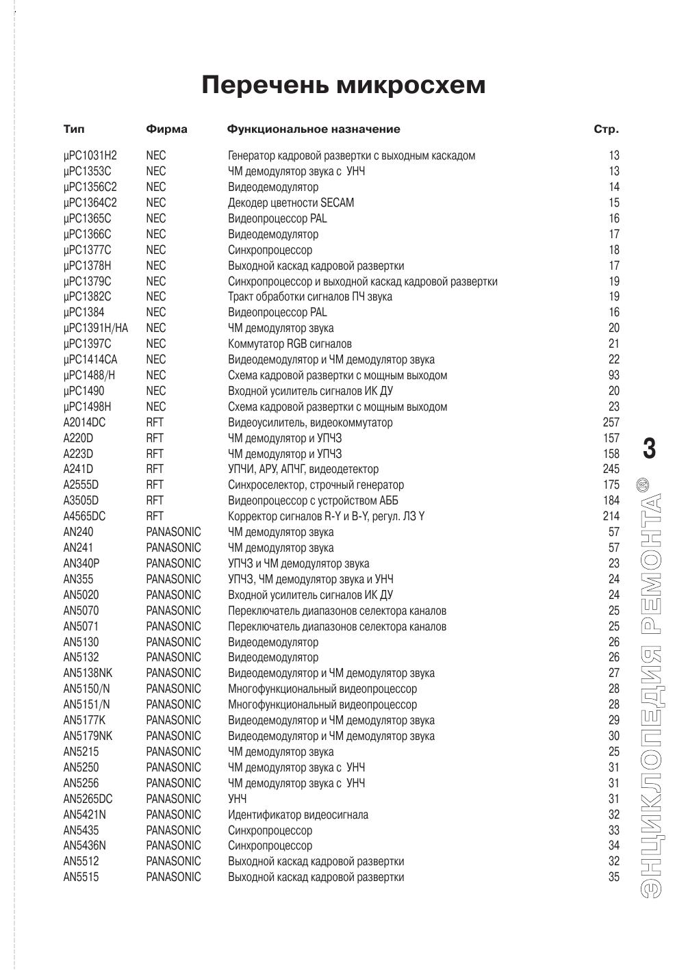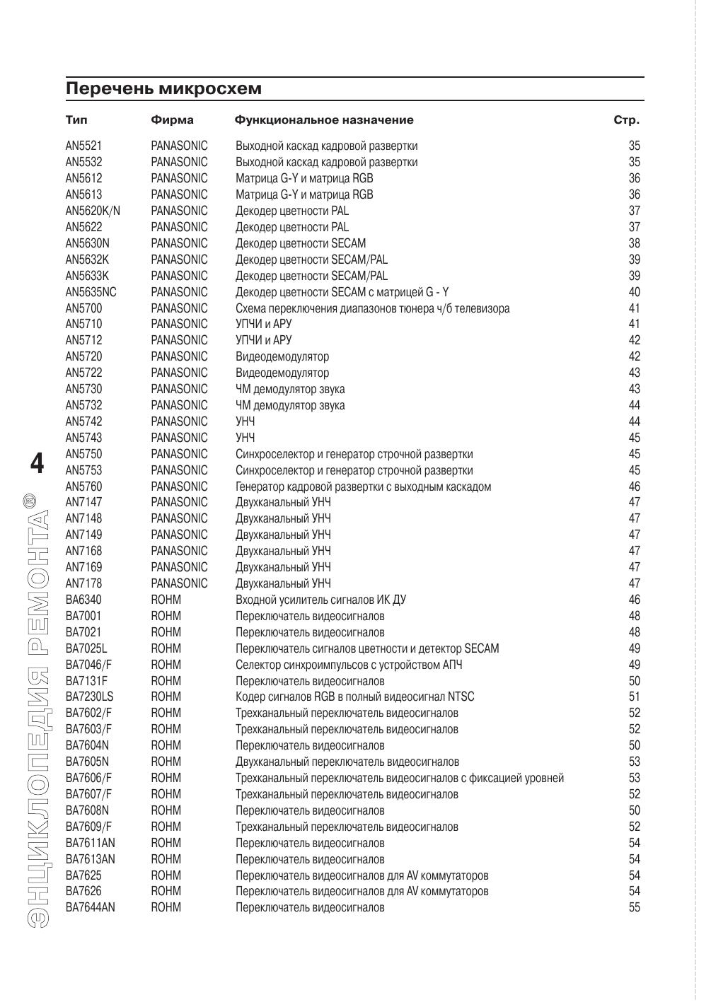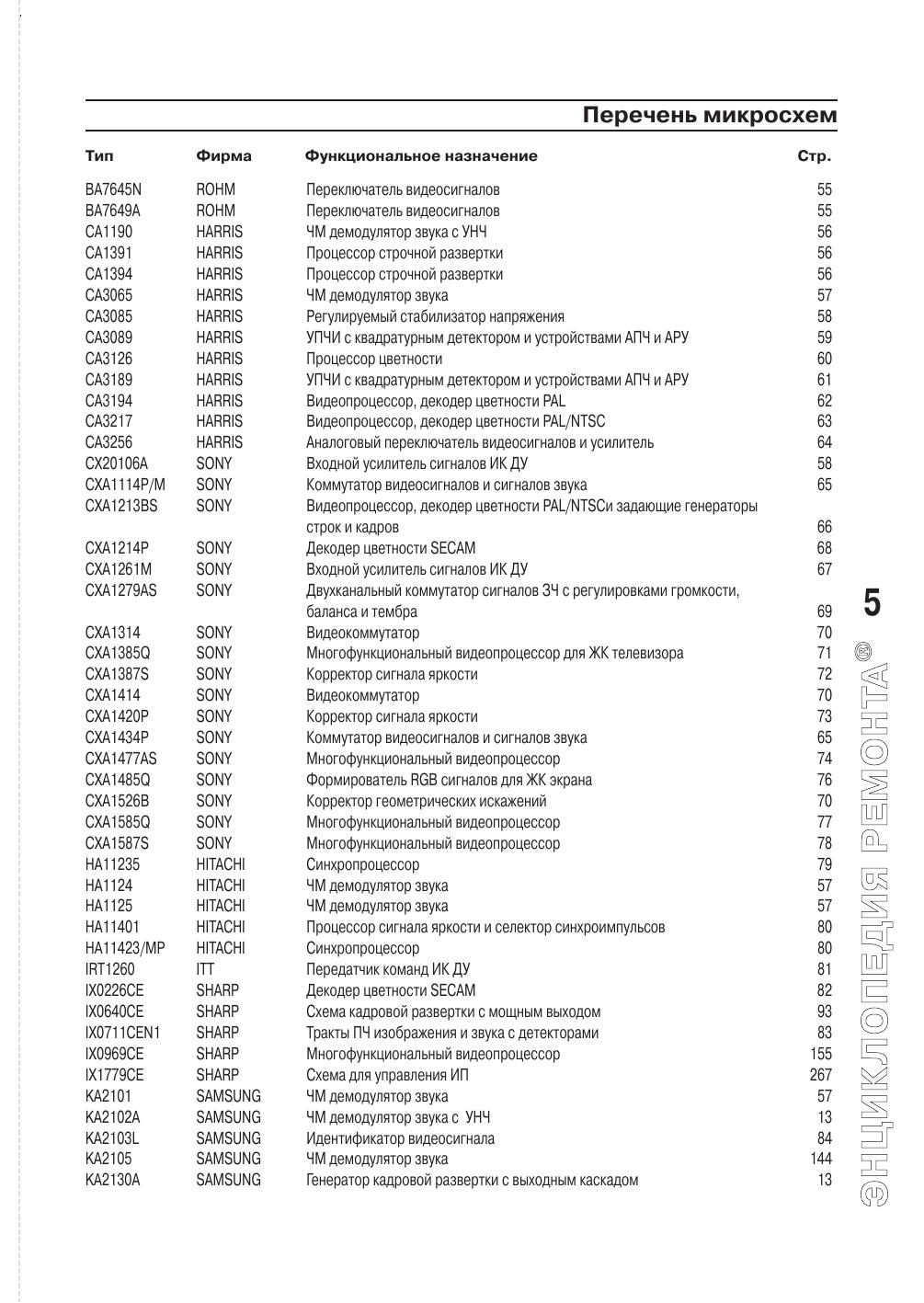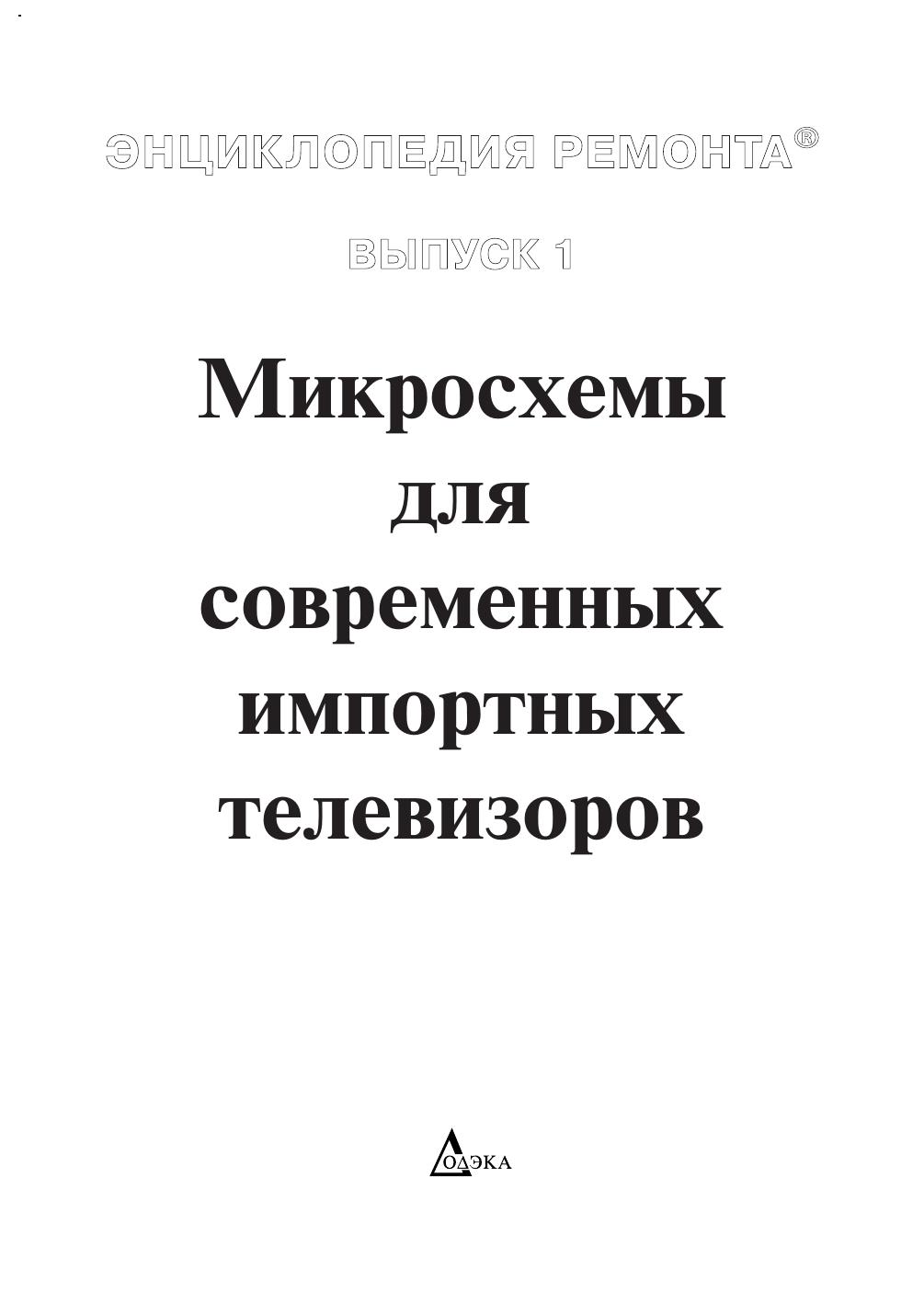 Книга открывает серию под названием ”Энциклопедия ремонта”. Впервые на русском языке приводятся структурные схемы и назначение выводов более четырехсот микросхем, применяемых в европейских и восточно"азиатских цветных телевизорах. Также в книге даны сведения об аналогах. Данное издание рассчитано на подготовленных радиолюбителей, самостоятельно занимающихся ремонтом зарубежной электронной аппаратуры, а также работников сервисных служб.