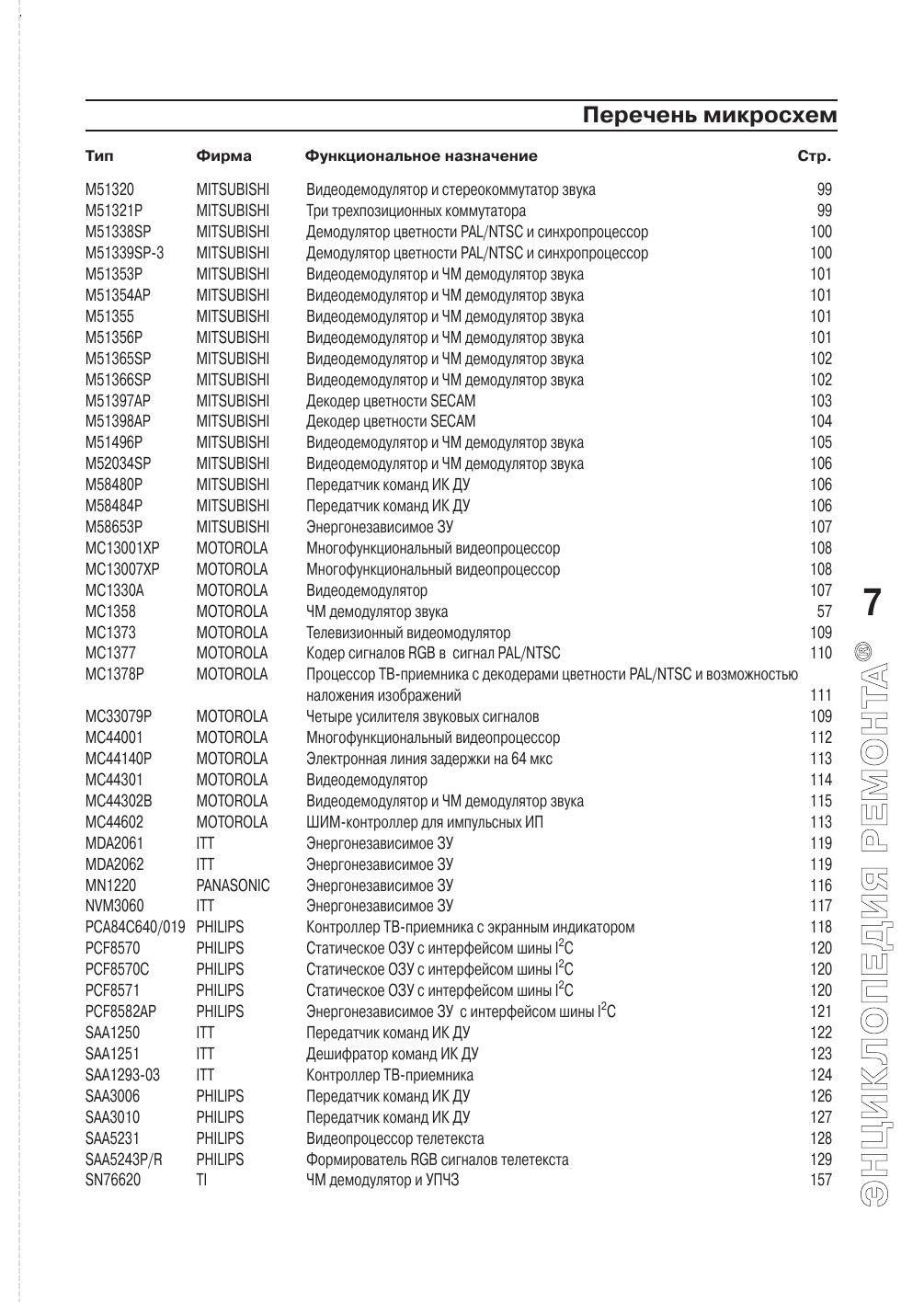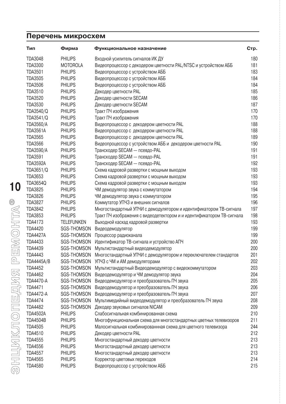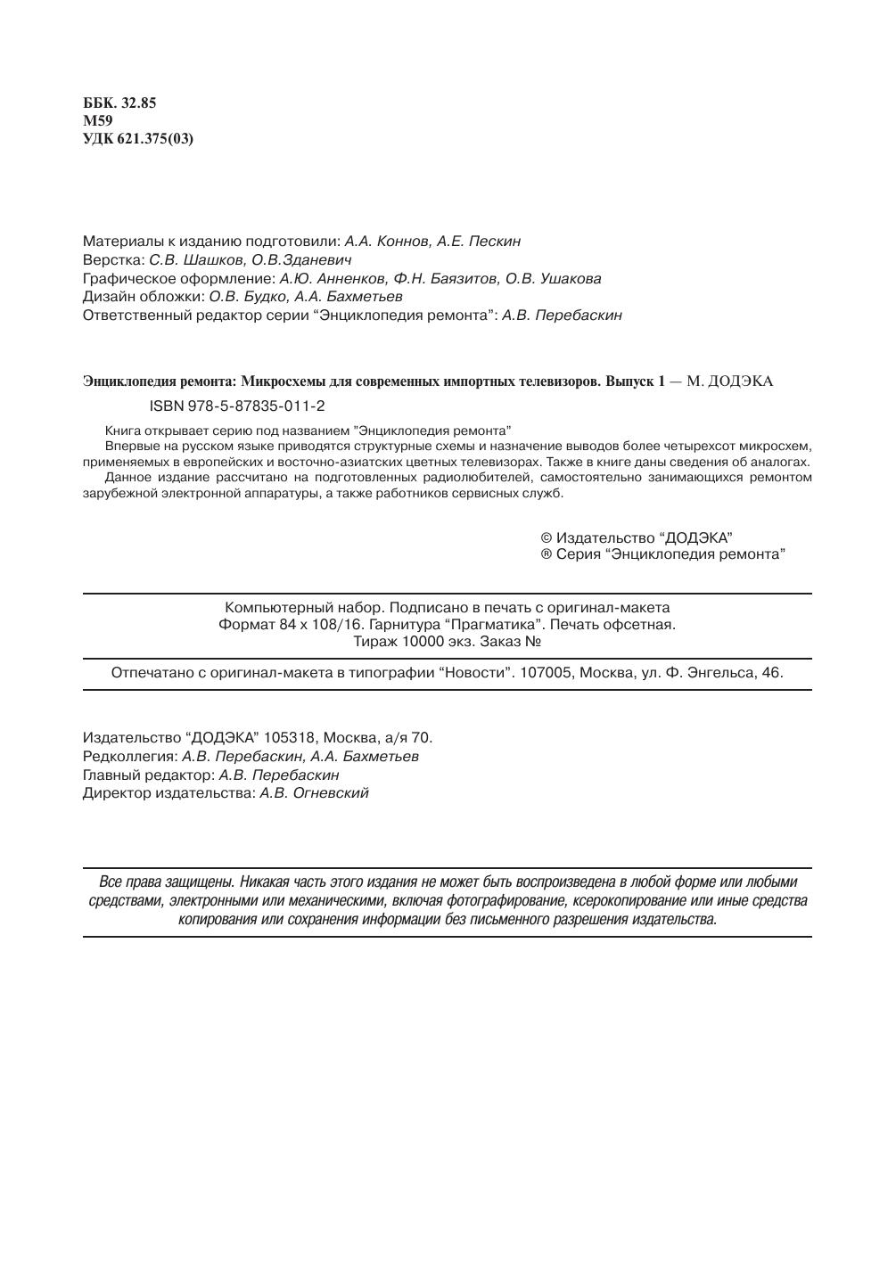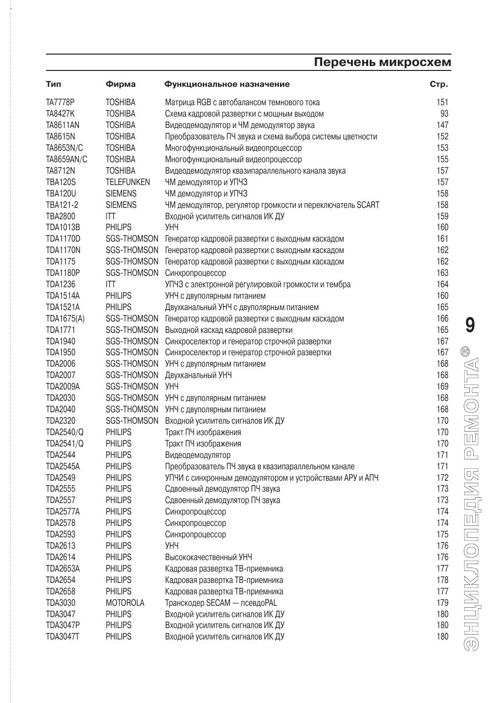 Книга открывает серию под названием ”Энциклопедия ремонта”. Впервые на русском языке приводятся структурные схемы и назначение выводов более четырехсот микросхем, применяемых в европейских и восточно"азиатских цветных телевизорах. Также в книге даны сведения об аналогах. Данное издание рассчитано на подготовленных радиолюбителей, самостоятельно занимающихся ремонтом зарубежной электронной аппаратуры, а также работников сервисных служб.