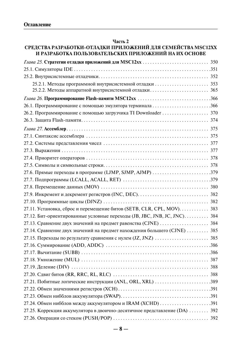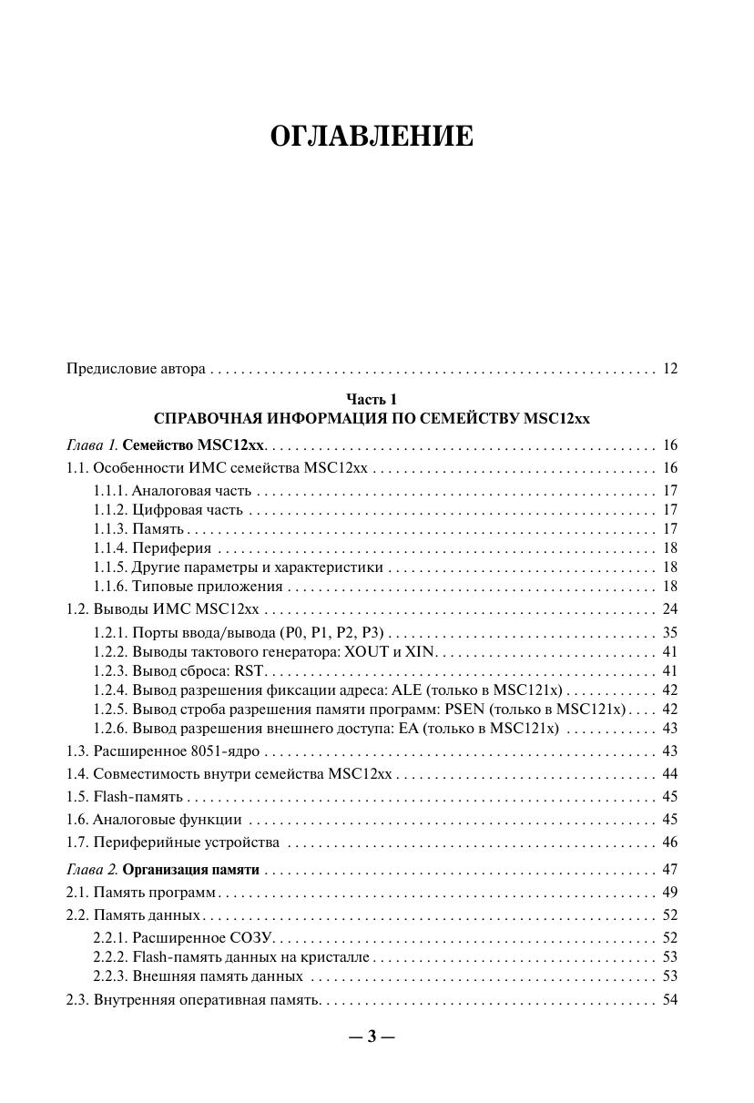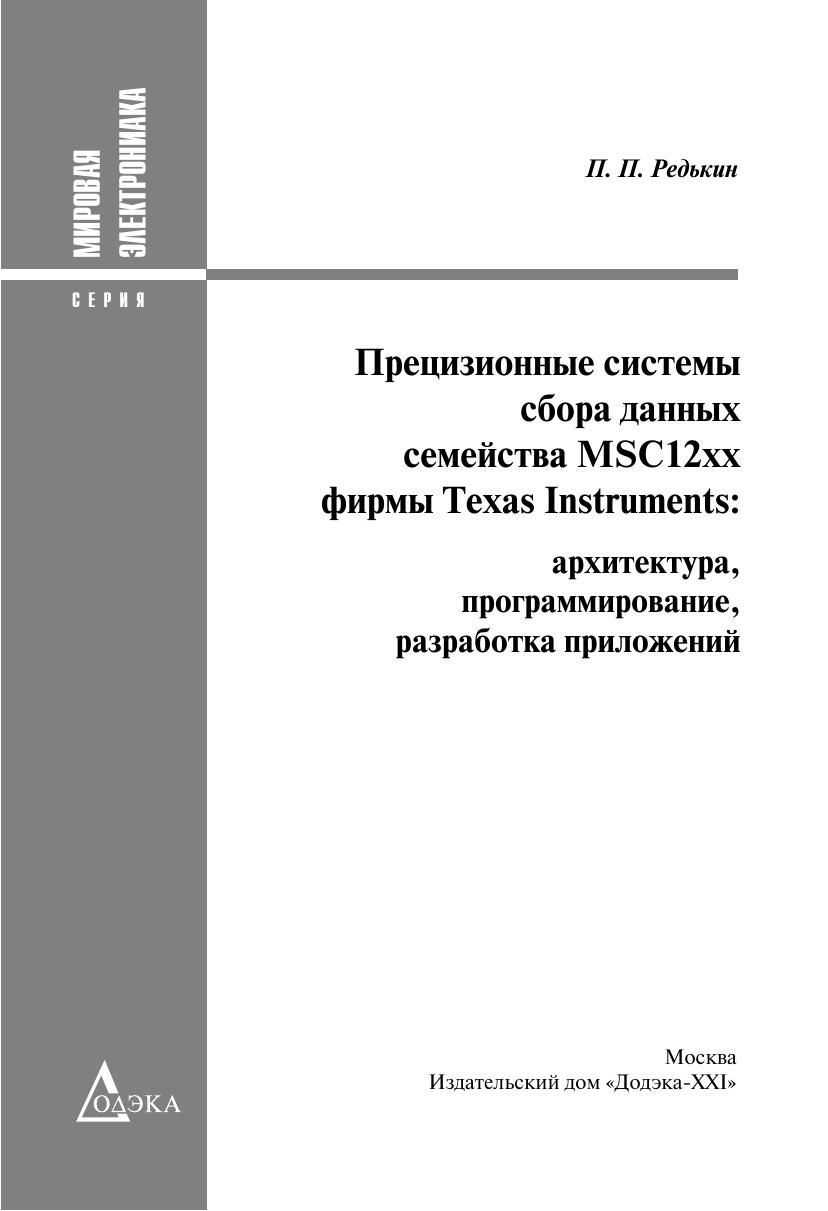 Книга представляет собой практическое руководство и справочное пособие для изучения микросхем семейства MSC12xx и создания на их основе пользовательских проектов. Материалы по семейству MSC12xx в таком объеме на русском языке издаются впервые. Часть I содержит достаточно полную справочную информацию о семействе MSC12xx, включая перечень типовых технических характеристик микросхем семейства MSC12xx, описание их архитектуры, программной модели, аппаратногопостроения и программирования периферийных модулей семейства MSC12xx (каждый периферийный модуль описан в отдельной главе), а также рекомендации производителя по программированию и применению отдельных узлов MSC12xx. Описание работы периферийных узлов и вычислительного ядра MSC12xx сопровождается примерами программных фрагментов на языках ассемблера и С, предоставленными фирмой производителем. Часть II содержит информацию о способах и средствах разработки отладки приложений на основе устройств MSC12xx. В приложениях приведены спецификации параметров и типовые характеристики устройств MSC12xx и другие справочные материалы. Книга предназначена для разработчиков радиоэлектронной аппаратуры истудентов радиотехнических специальностей. Она, несомненно, будет полезнарадиолюбителям, использующим микроконтроллеры в своей практике.