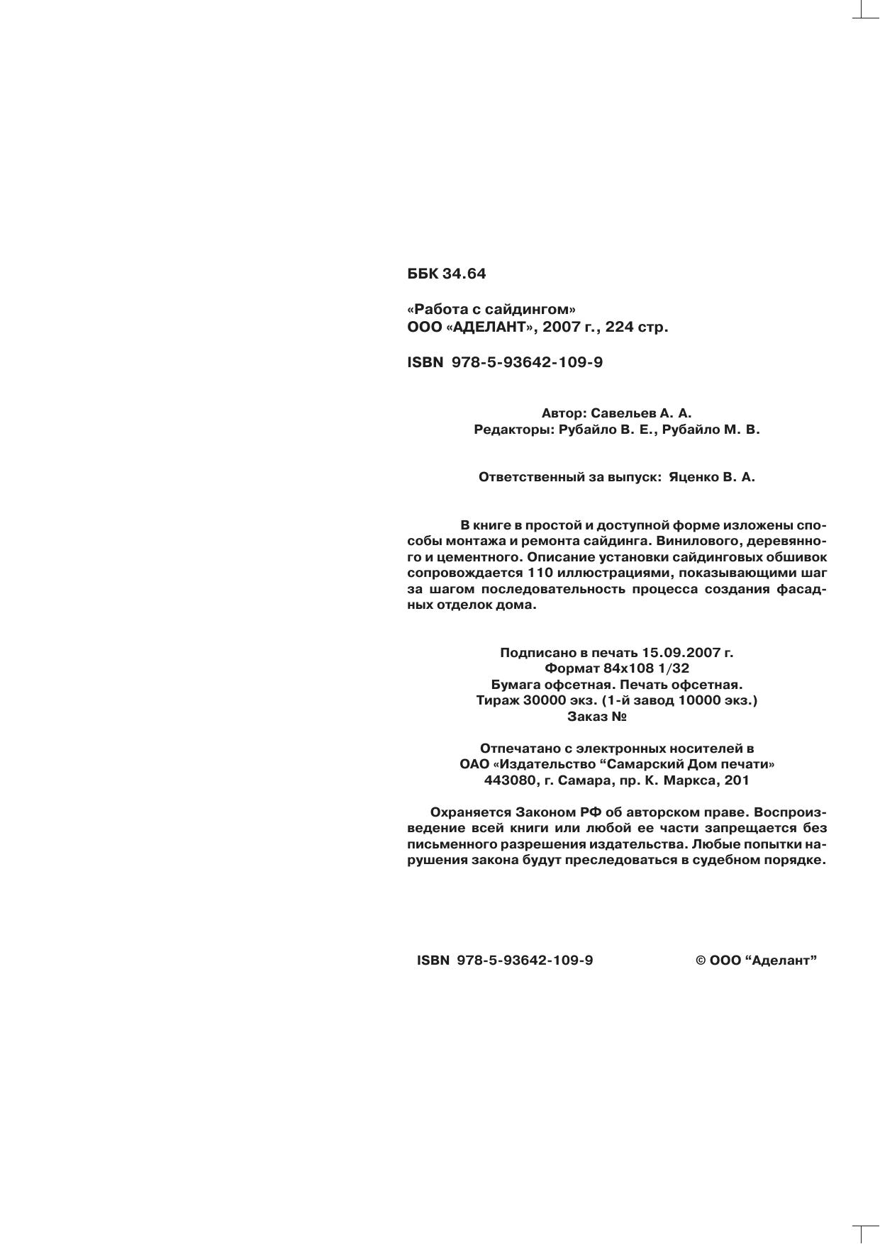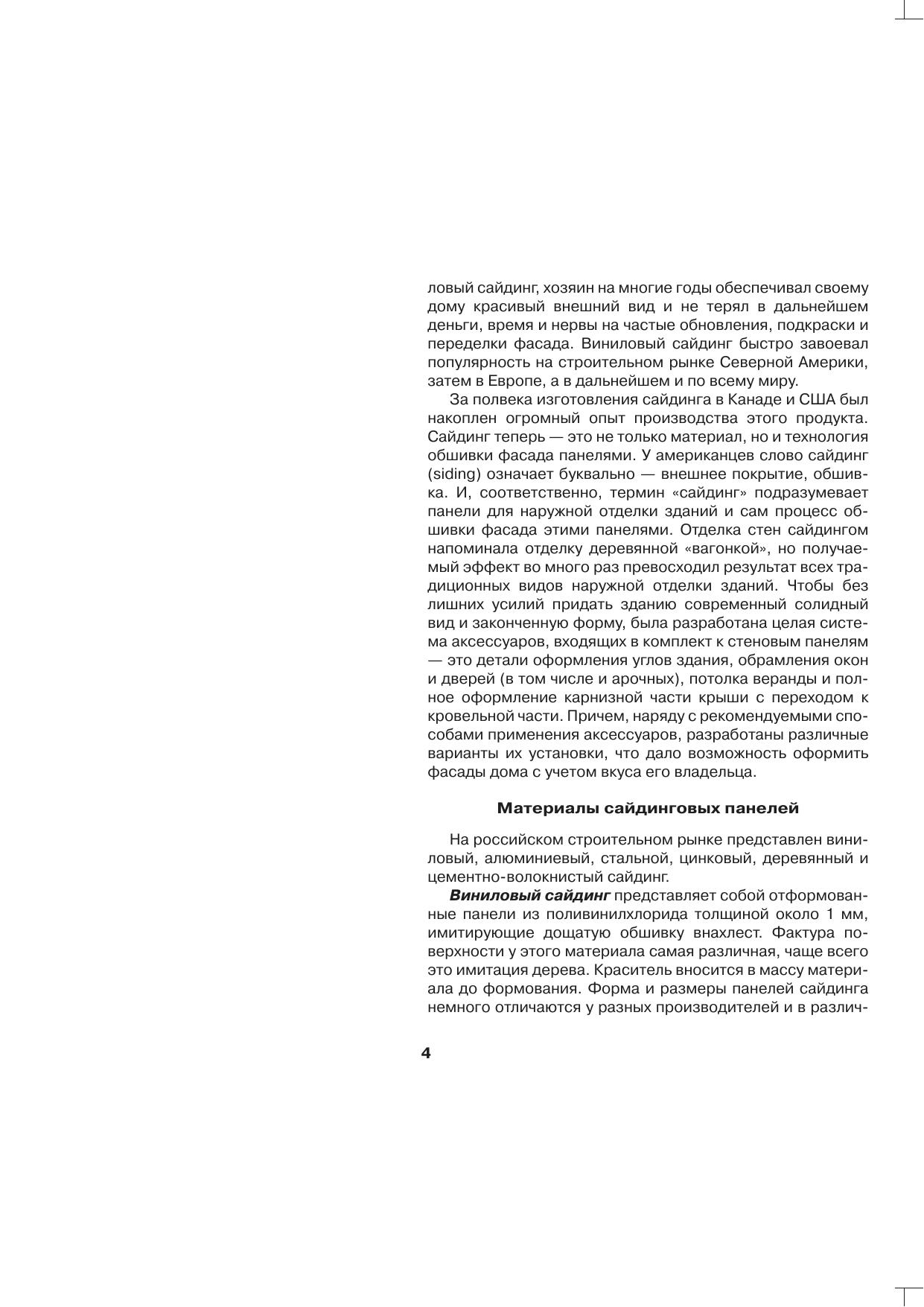 В книге в простой и доступной форме изложены способы монтажа и ремонта сайдинга. Винилового, деревянного и цементного. Описание установки сайдинговых обшивок сопровождается 110 иллюстрациями, показывающими шаг за шагом последовательность процесса создания фасадных отделок дома.