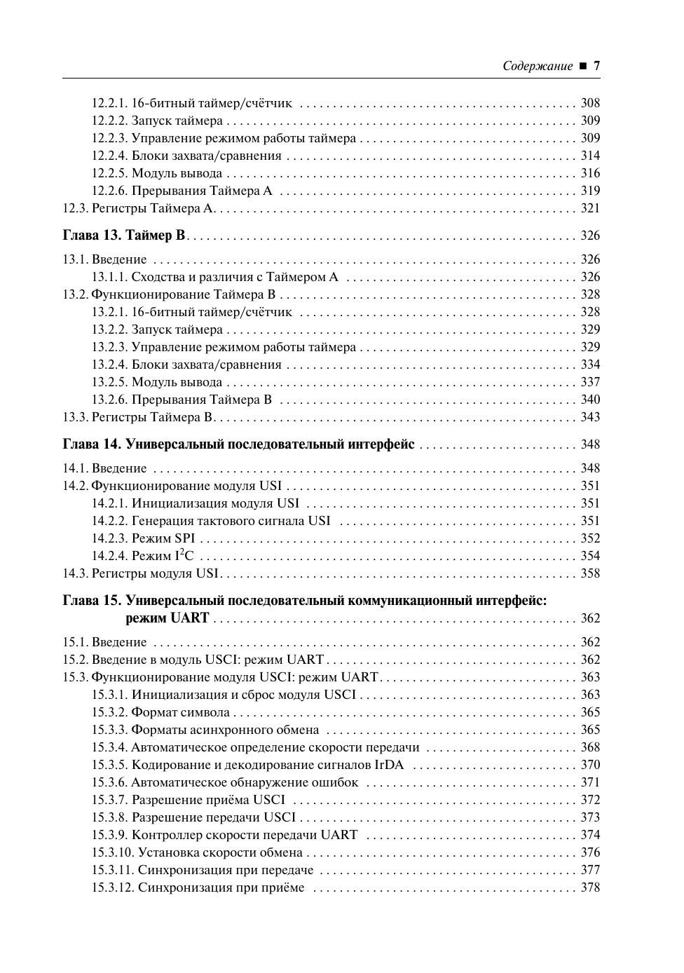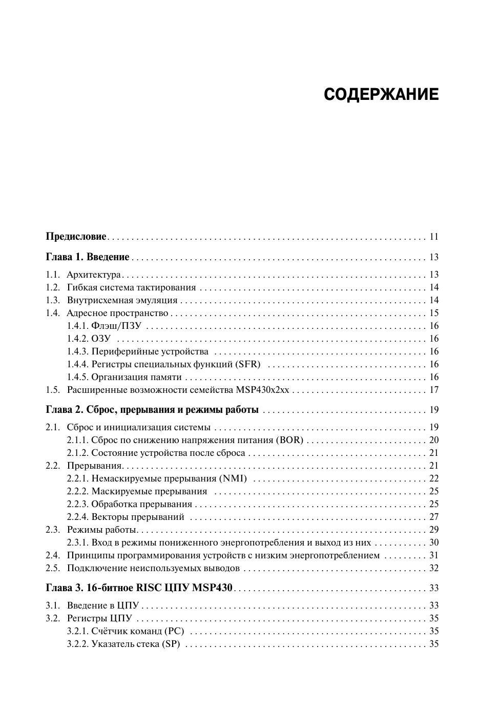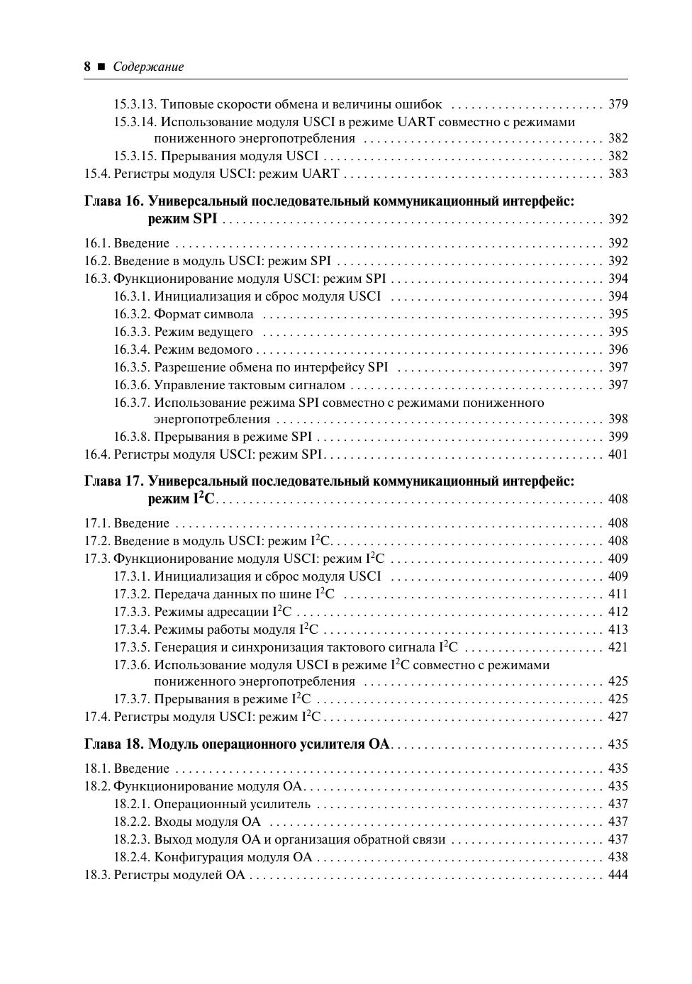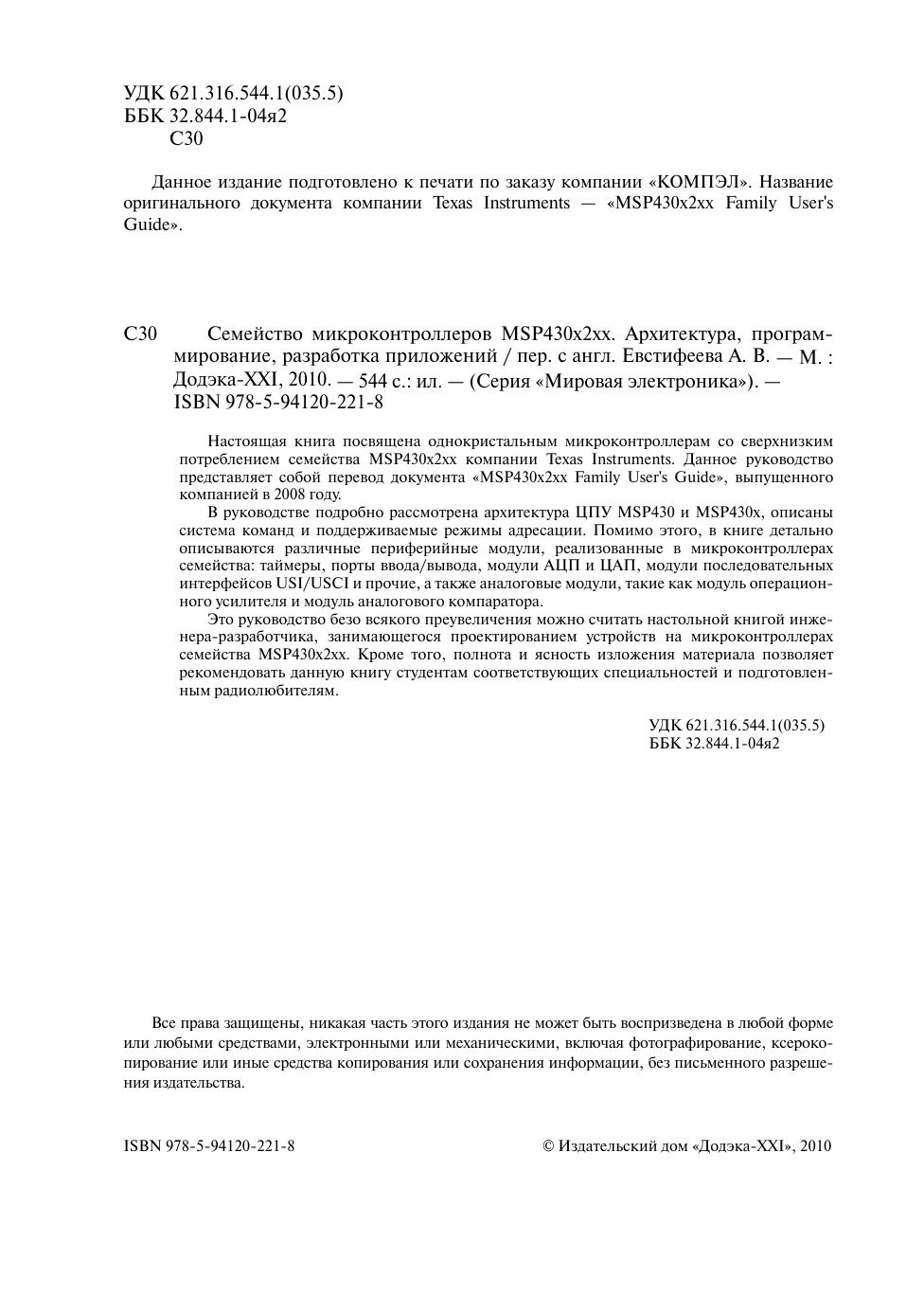 Настоящая книга посвящена однокристальным микроконтроллерам со сверхнизким потреблением семейства MSP430x2xx компании Texas Instruments. Данное руководство представляет собой перевод документа «MSP430x2xx Family User's Guide», выпущенного компанией в 2008 году. В руководстве подробно рассмотрена архитектура ЦПУ MSP430 и MSP430x, описаны система команд и поддерживаемые режимы адресации. Помимо этого, в книге детально описываются различные периферийные модули, реализованные в микроконтроллерах семейства: таймеры, порты ввода/вывода, модули АЦП и ЦАП, модули последовательных интерфейсов USI/USCI и прочие, а также аналоговые модули, такие как модуль операционного усилителя и модуль аналогового компаратора. Это руководство безо всякого преувеличения можно считать настольной книгой инженера разработчика, занимающегося проектированием устройств на микроконтроллерах семейства MSP430x2xx. Кроме того, полнота и ясность изложения материала позволяет рекомендовать данную книгу студентам соответствующих специальностей и подготовленным радиолюбителям.