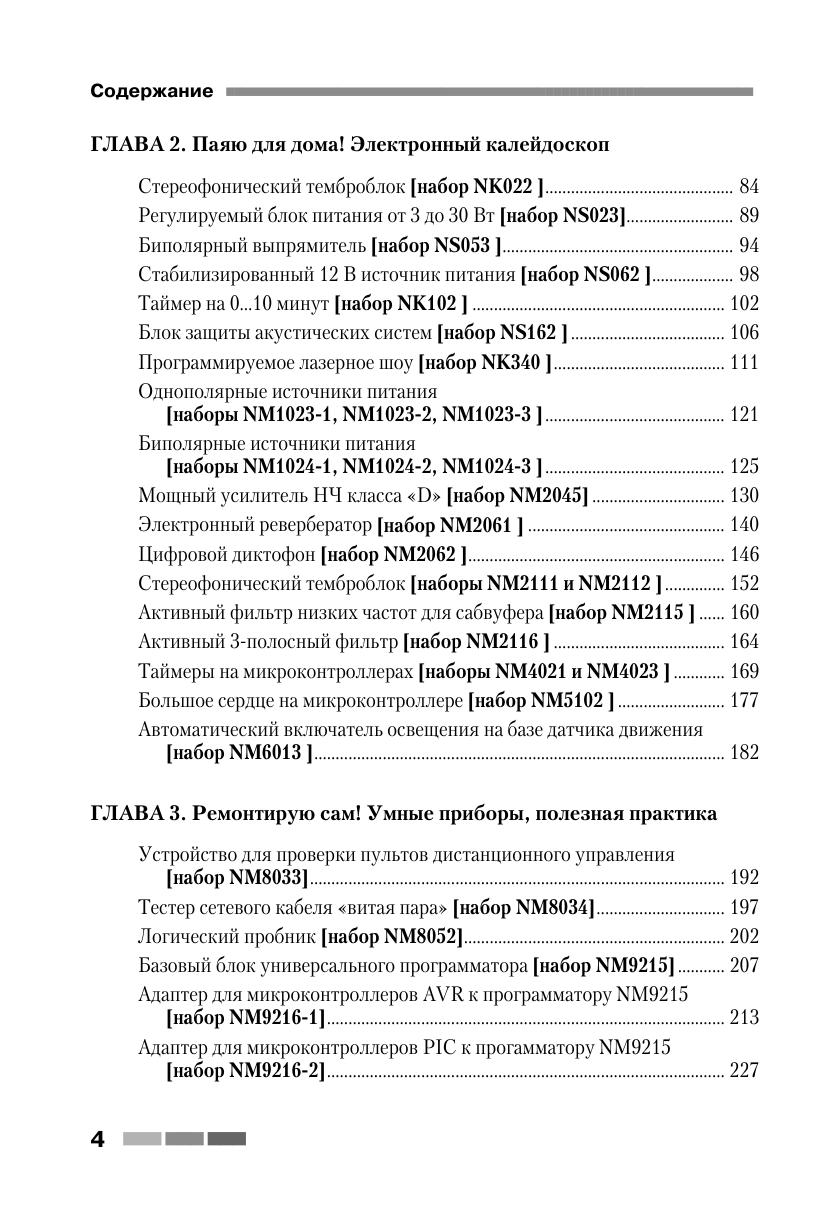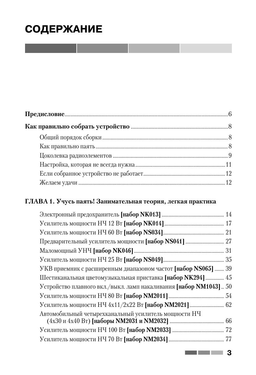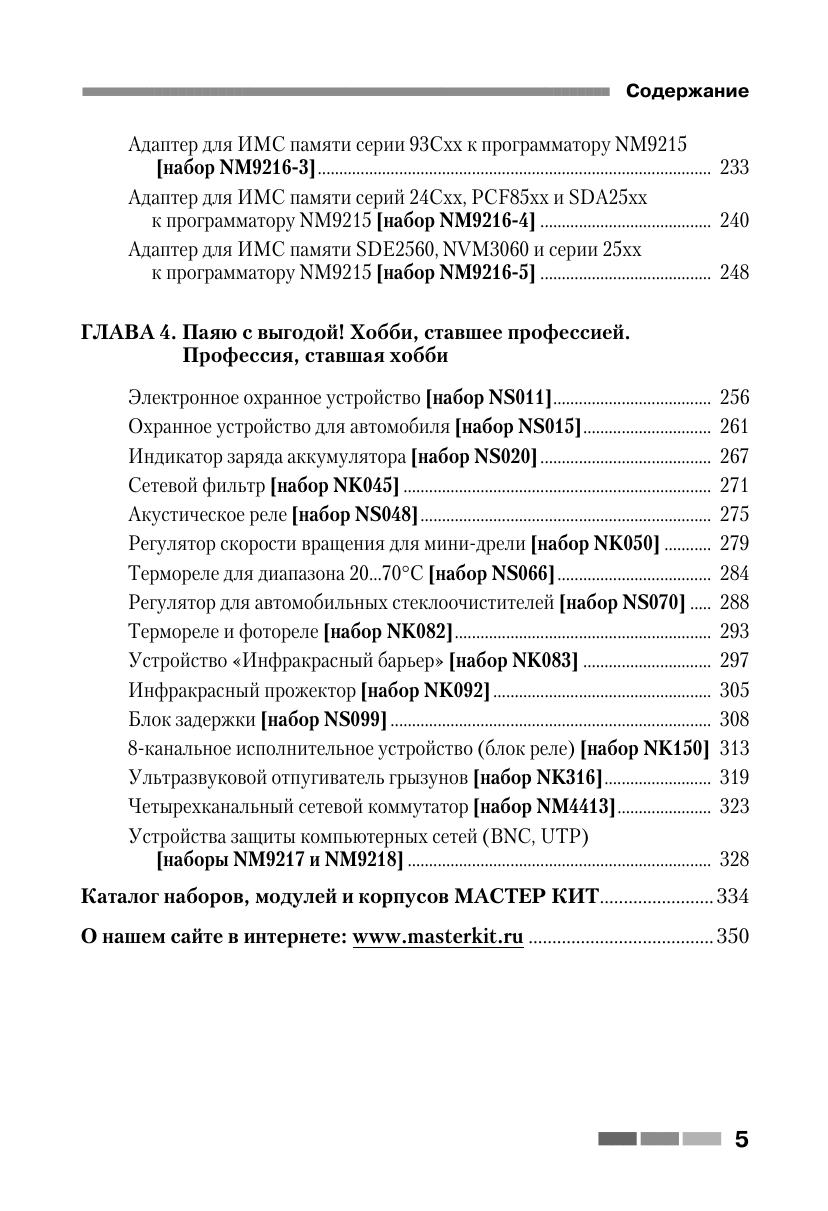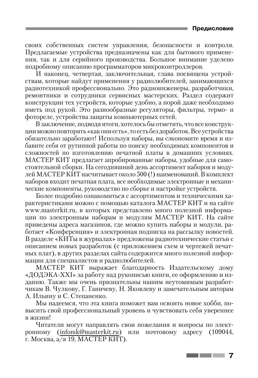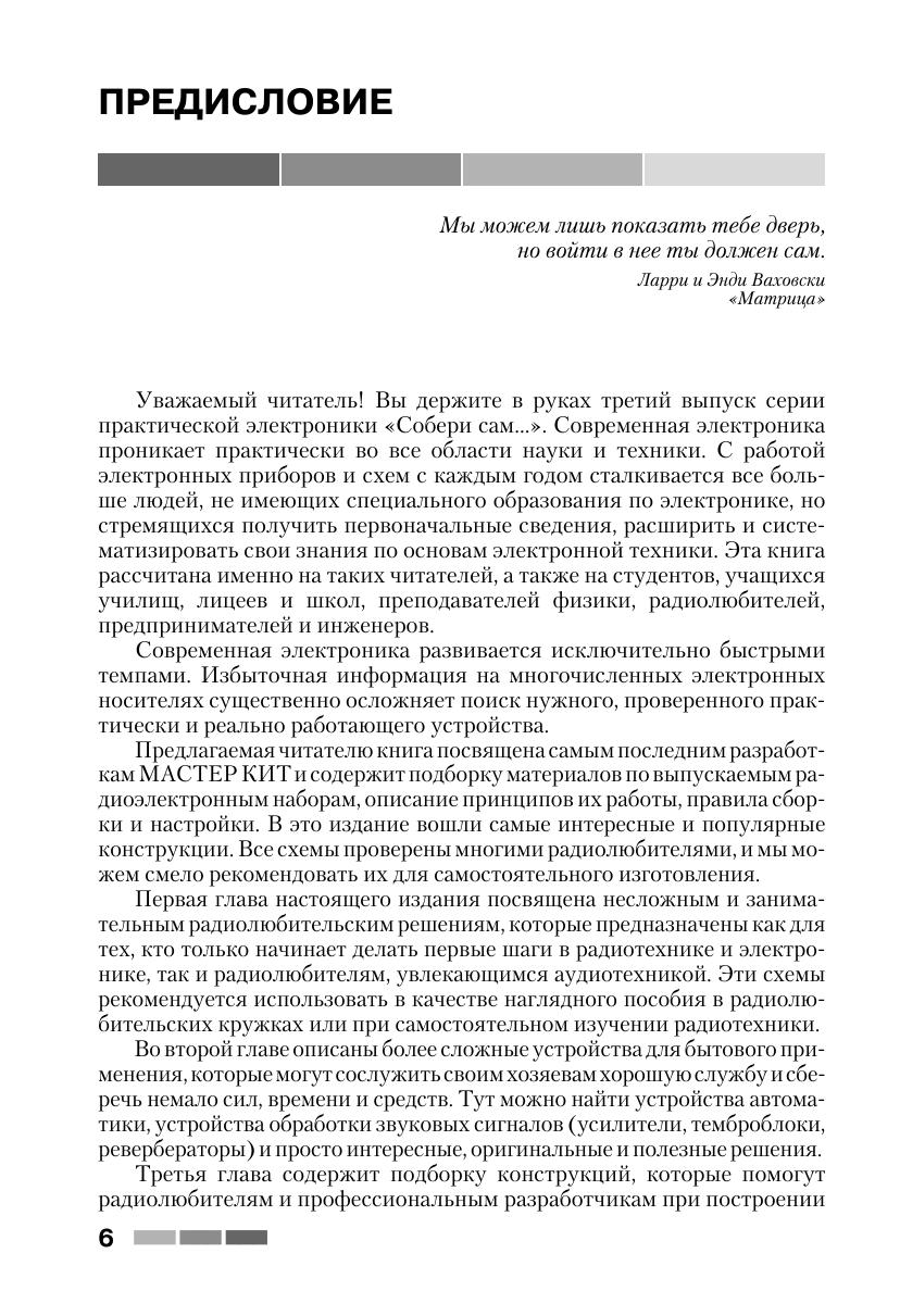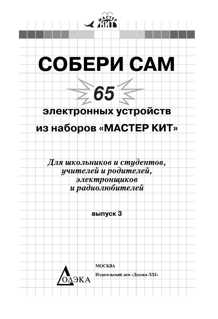 Книга знакомит читателей с 65 простыми и сложными электронными устройствами, которые можно легко собрать из наборов «МАСТЕР КИТ». Наборы содержат все необходимые радиодетали и платы для сборки электронных устройств. Эти наборы продаются практически во всех городах России, в радиомагазинах и на радиорынках. Описание электронных устройств представлено в четырех главах, сгруппированных по назначению устройств — от игрушек до сложной измерительной техники. В книге приведен каталог, содержащий 350 наименований электронных устройств, которые можно купить в виде готовых для сборки наборов «МАСТЕР КИТ», и перечень 90 типов корпусов с указанием их размеров, которые можно приобрести и для других типов радиоэлектронных или механических устройств. Учитывая большой интерес читателей к электронным устройствам и наборам, представленным в первых двух книгах, третья книга содержит описание уже 65 наборов «МАСТЕР КИТ» (выпуск 3), в том числе самые последние новинки. Все три книги представляют интерес для школьников и студентов, начинающих и опытных радиолюбителей, для работников сервисных и ремонтных служб, а также для учителей физики и родителей, обучающих детей основам радиоэлектроники, аналоговой и цифровой техники.
