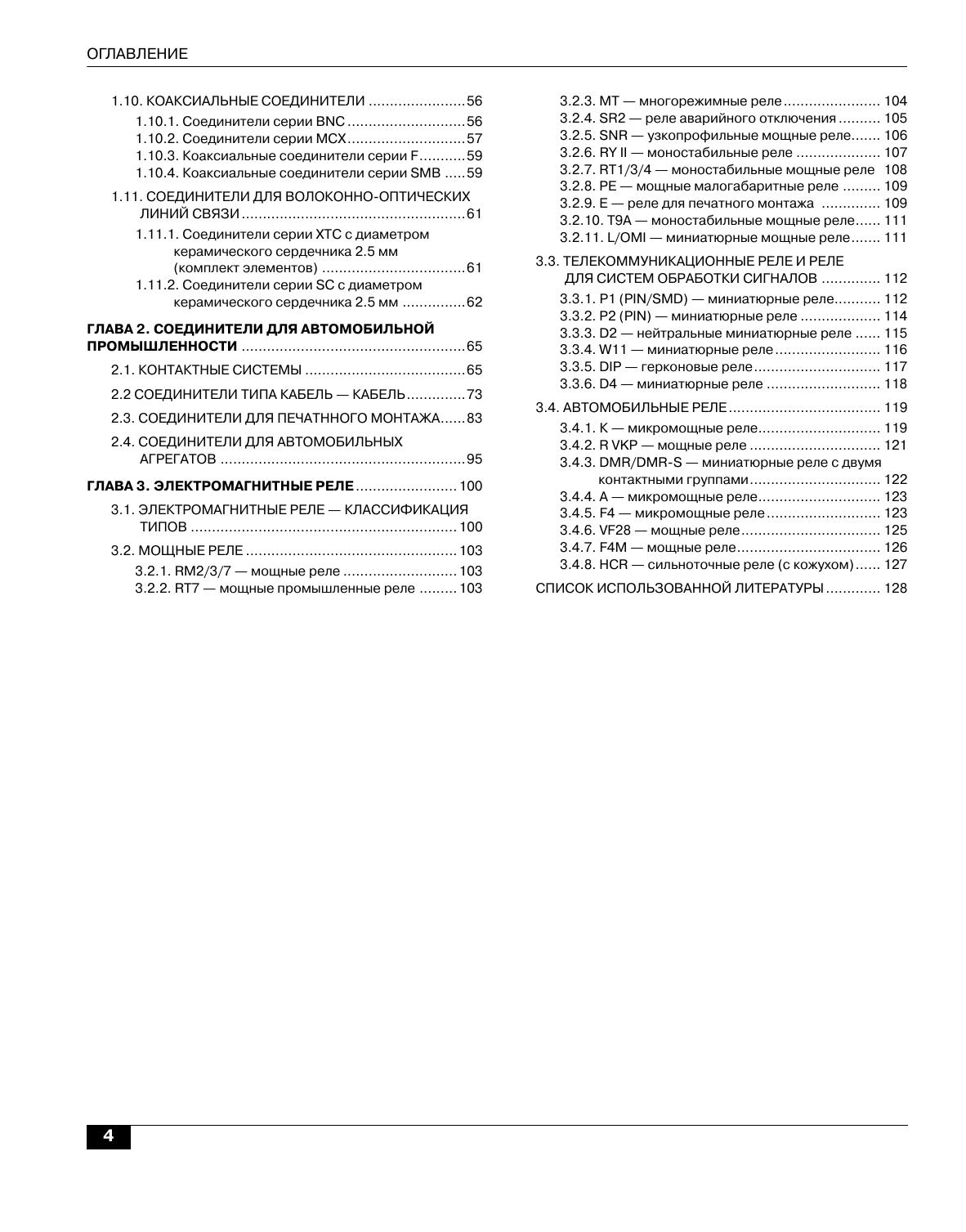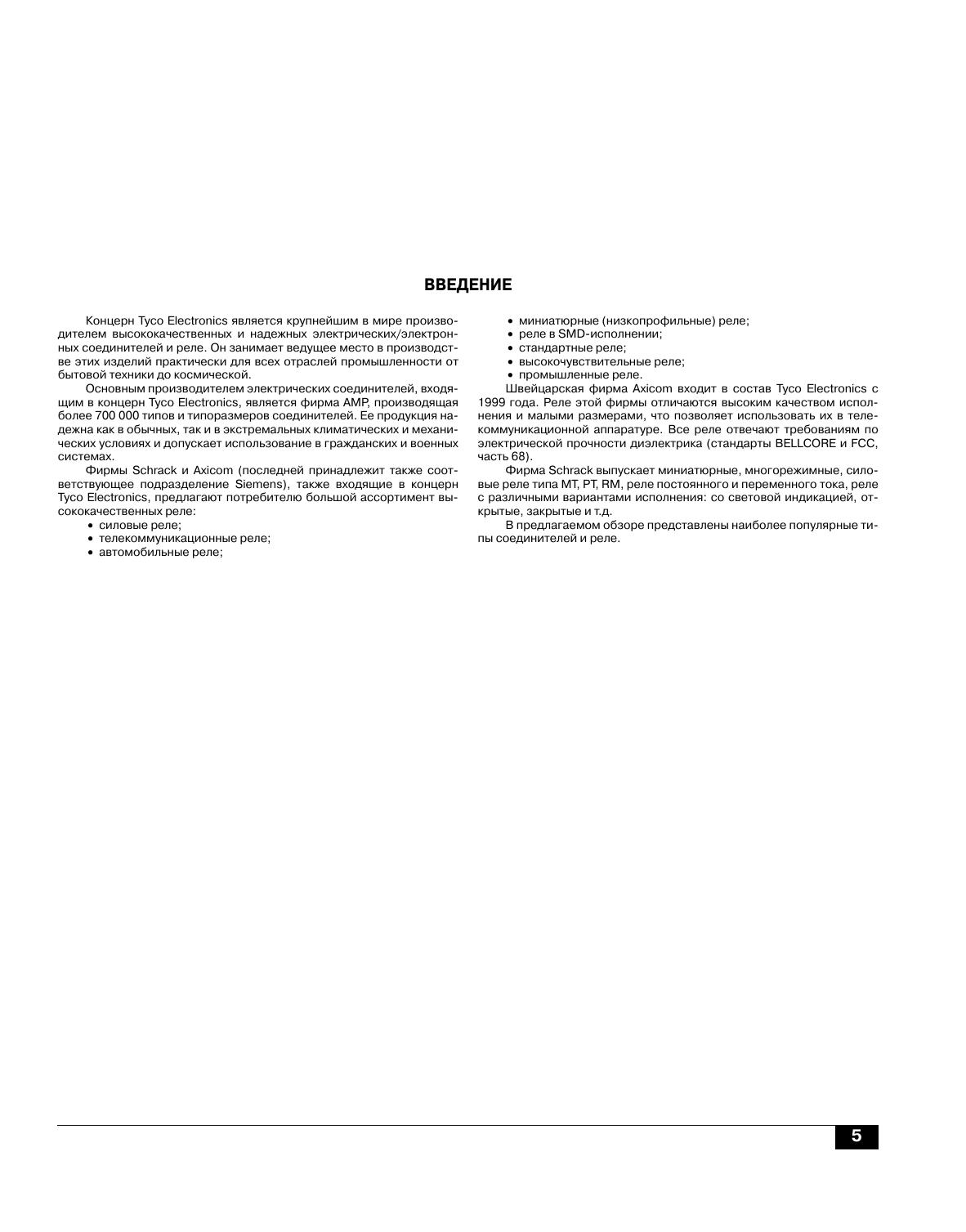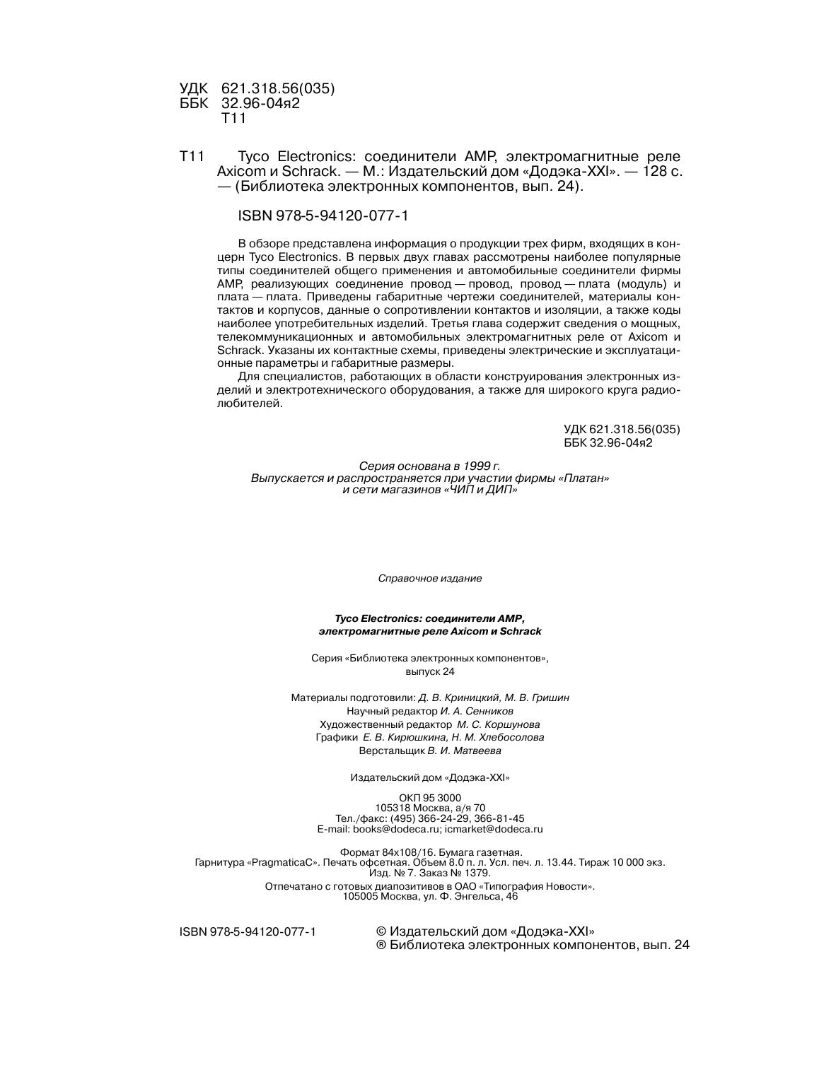 В обзоре представлена информация о продукции трех фирм, входящих в концерн Tyco Electronics. В первых двух главах рассмотрены наиболее популярные типы соединителей общего применения и автомобильные соединители фирмы AMP, реализующих соединение провод—провод, провод—плата (модуль) и плата—плата. Приведены габаритные чертежи соединителей, материалы контактов и корпусов, данные о сопротивлении контактов и изоляции, а также коды наиболее употребительных изделий. Третья глава содержит сведения о мощных, телекоммуникационных и автомобильных электромагнитных реле от Axicom и Schrack. Указаны их контактные схемы, приведены электрические и эксплуатационные параметры и габаритные размеры. Для специалистов, работающих в области конструирования электронных изделий и электротехнического оборудования, а также для широкого круга радиолюбителей.